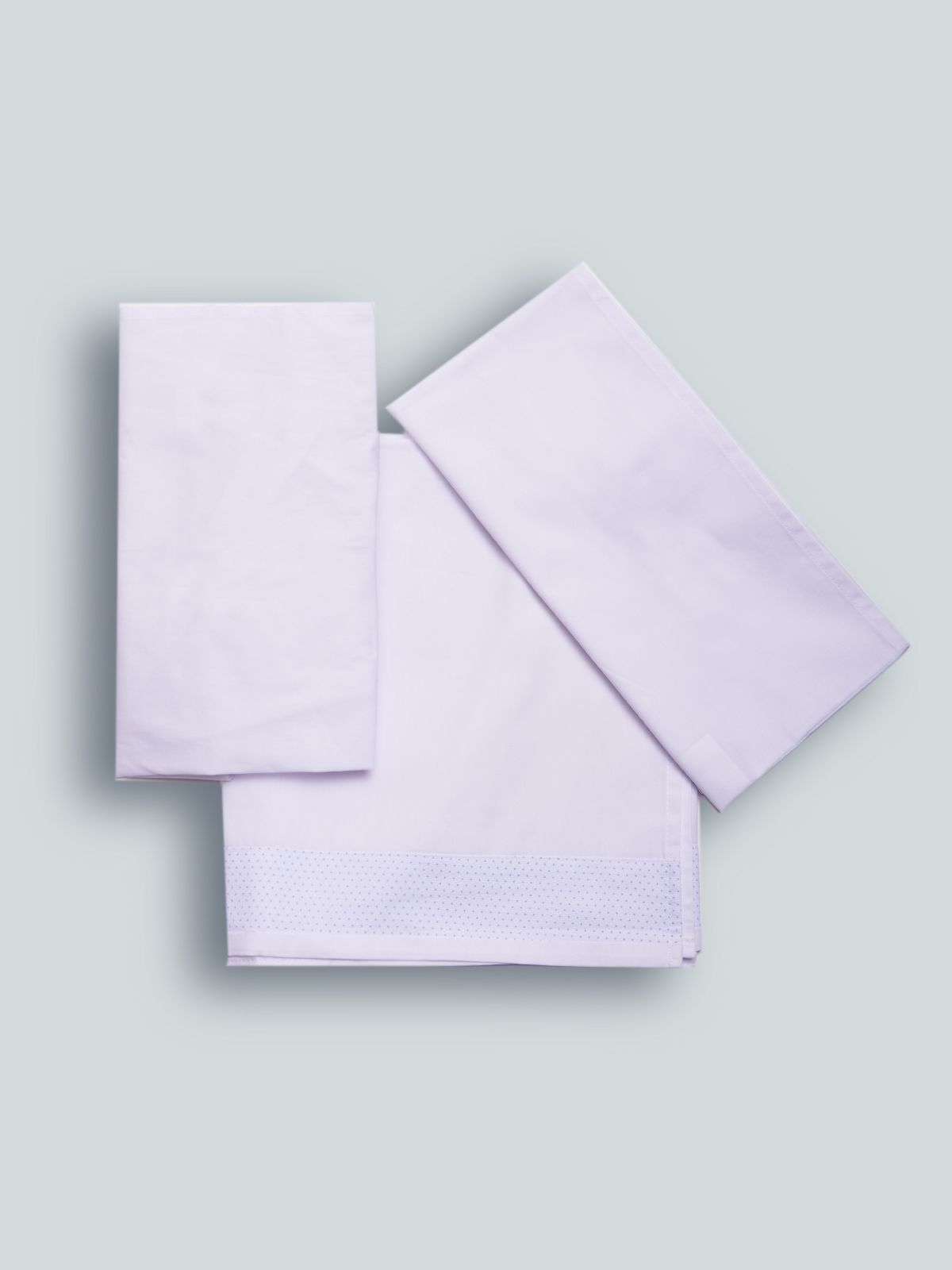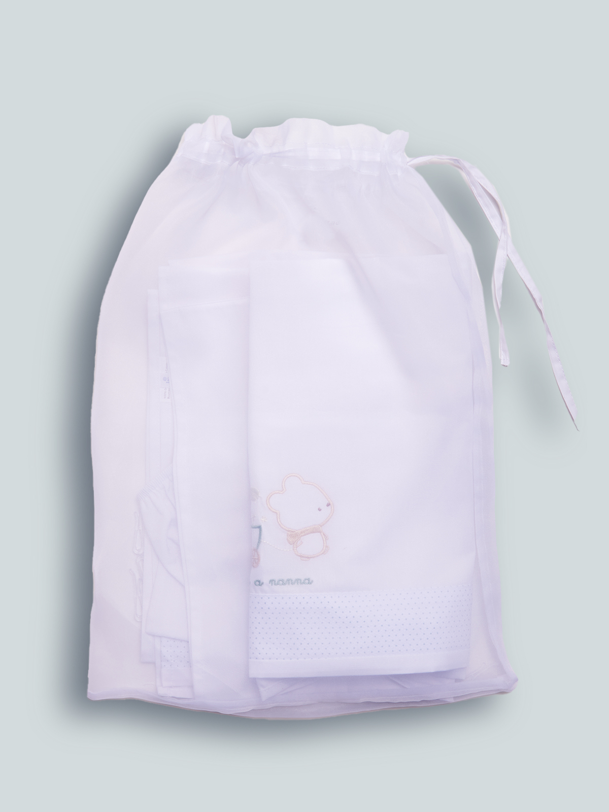 Set tre pezzi pezzi composto da: 1 lenzuolino piano con ricamo, 1 lenzuolo con bordo elasticato e 1 federa. Questo accessorio fa parte del corredino composto da tutti gli articoli indispensabili per il tuo neonato. Articolo spedito all’interno di un sacchetto in organza.