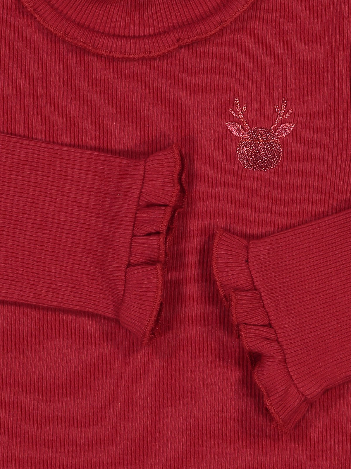 Lupetto in calda costina manica lunga. Simpatica renna a ricamo lurex sul davanti. Il modello del collo alto proteggerà la vostra bambina dal freddo. Rouches al fondo manica e al girocollo per ancora più femminilità. Un capo con dettagli chic ideale da indossare nel periodo nelle feste.