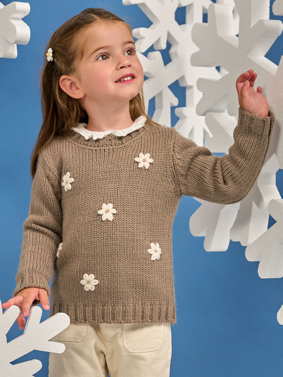 Maglia girocollo manica lunga in maglia di morbido cotone con fiori tridimensionali. Pratica apertura sul dietro grazie ai bottoncini. Un capo con dettagli sfiziosi e ideale per i primi freddi.