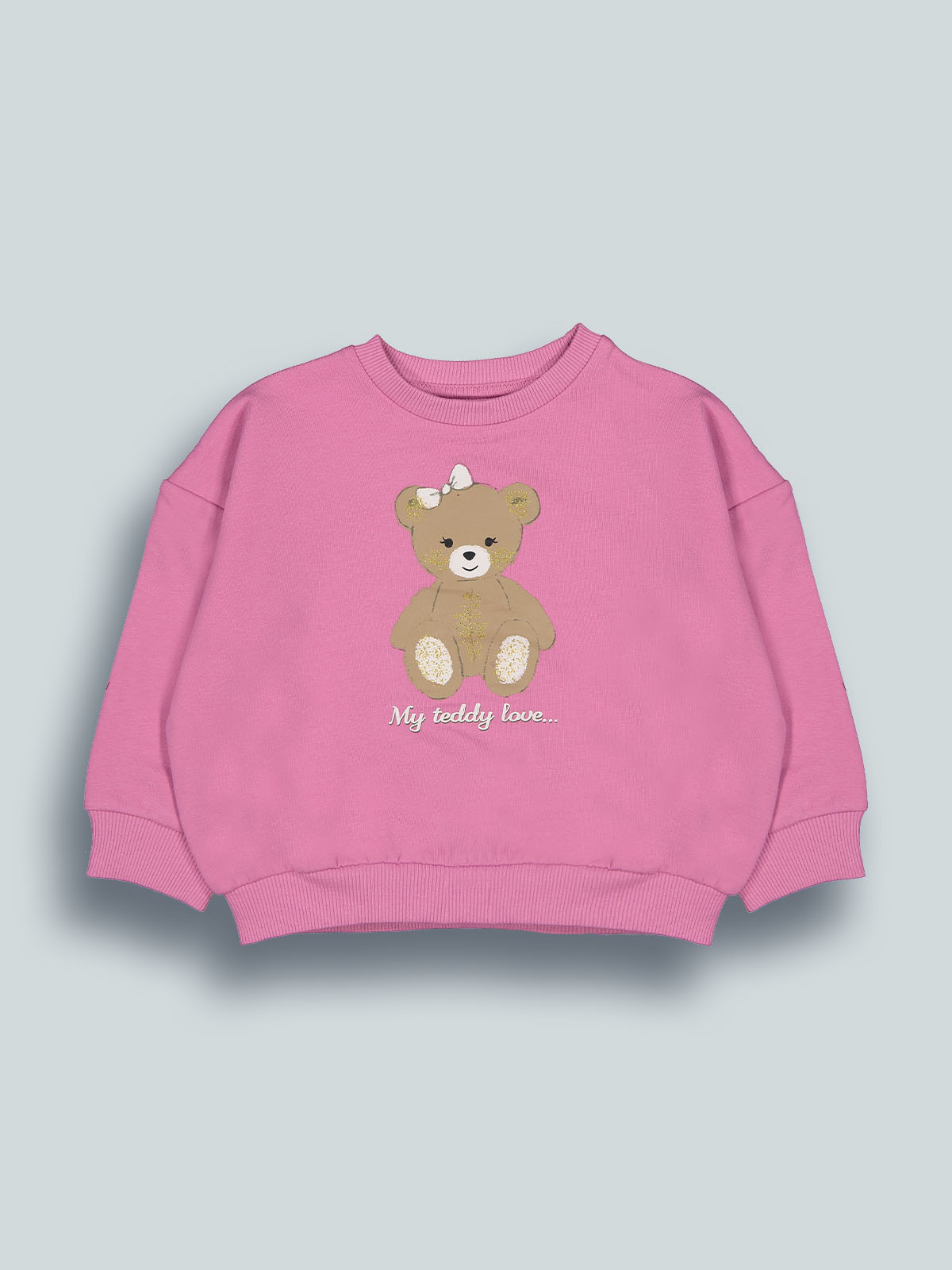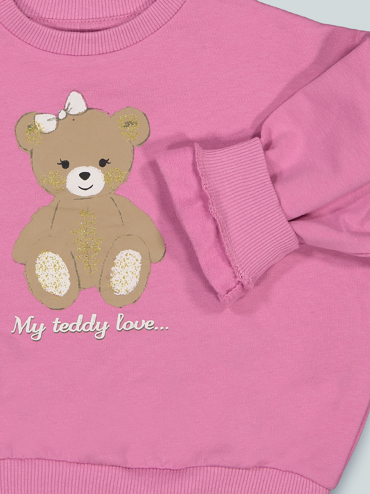 Maglia girocollo modello over in morbida e calda felpa elasicizzata. Collo, polsi e fondo in costina. Tenera stampa orsetto con glitter. L’interno della felpa di questo capo è lavorato in maniera tale che le fibre del tessuto si sollevino, rendendolo più morbido, soffice e caldo sulla pelle. Funzionalità e moda unite in un unico capo.