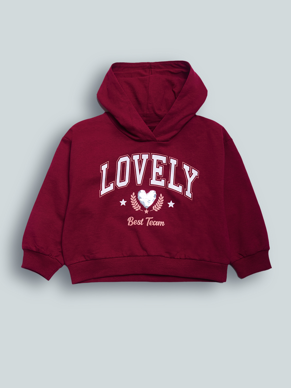 Maglia Modello corto con cappuccio in Morbida felpa leggera, Manica lunga. Stampa scritta con cuore in paillettes reversibili argento sul davanti. Un capo super fashion.
