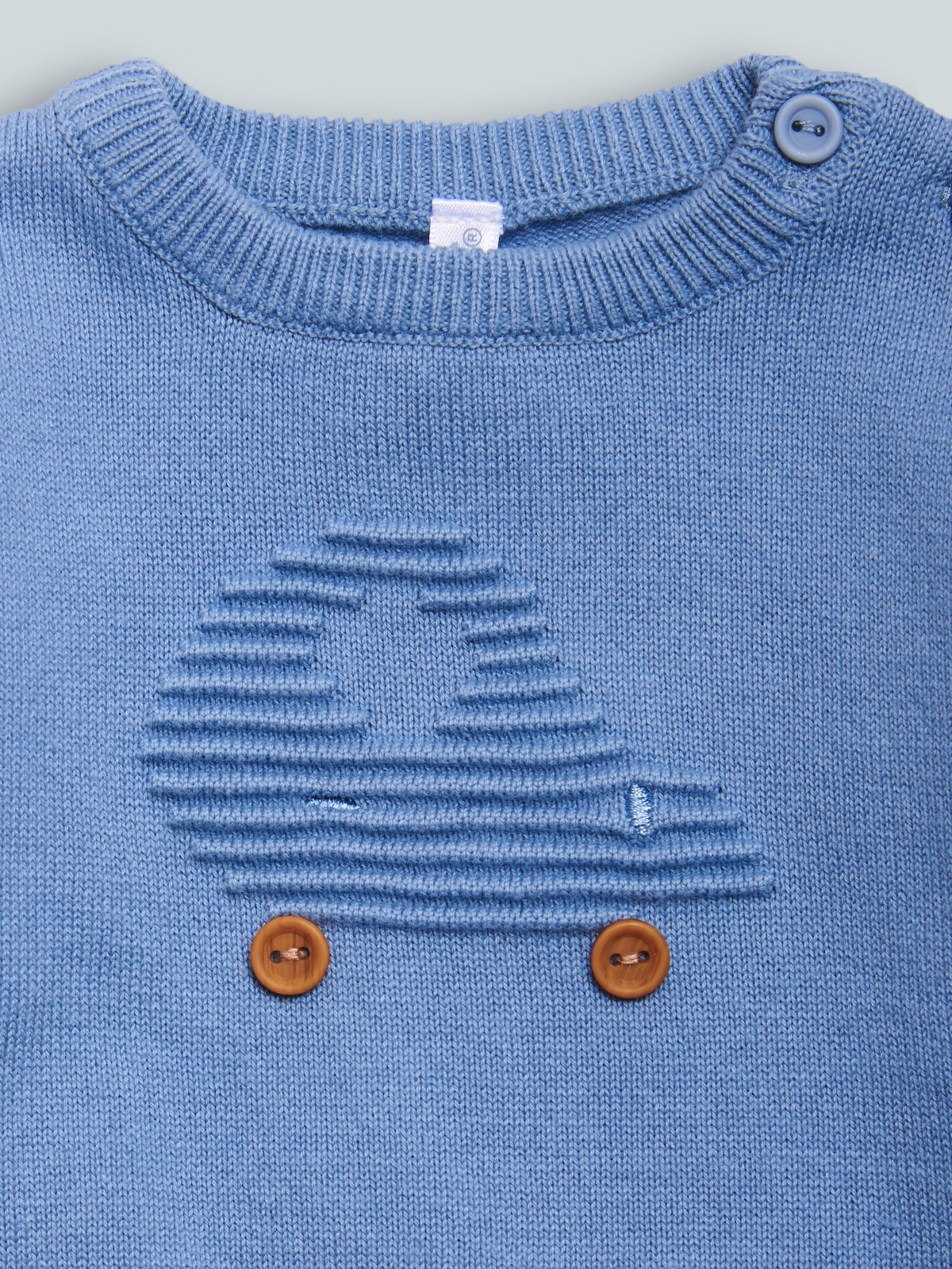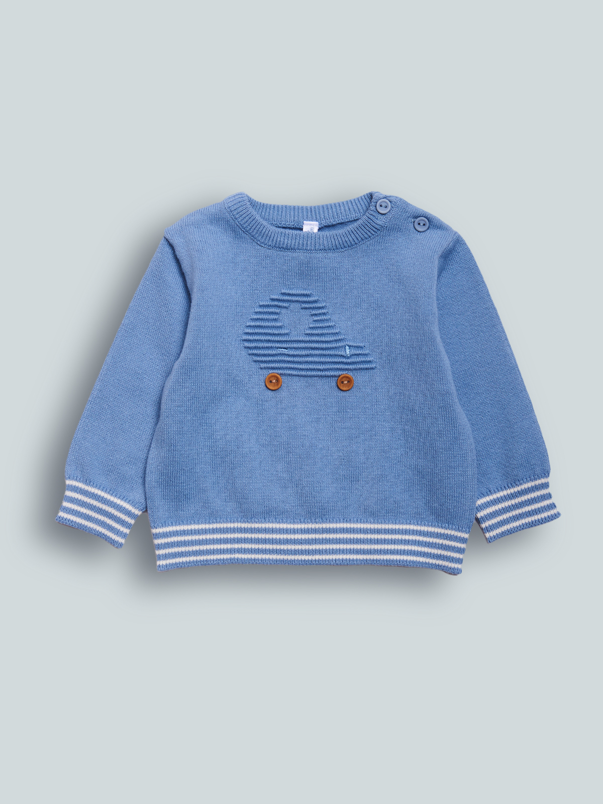 Maglioncino girocollo a Manica lunga in Misto cotone, pratica apertura con bottoni sulla spalla. Grafica Macchinina a rilievo con bottoni finto legno. Una Maglia pratica e facile da abbinare ad un jeans o ad un comodo pantalone.