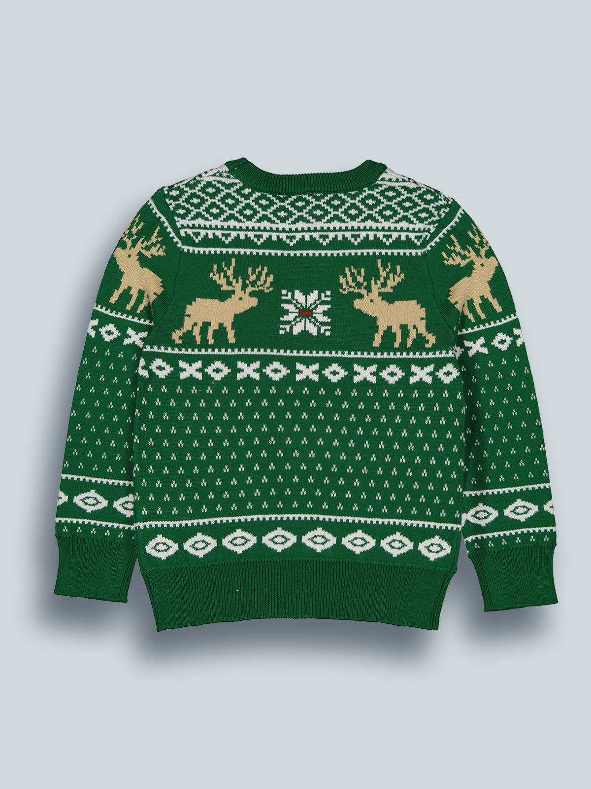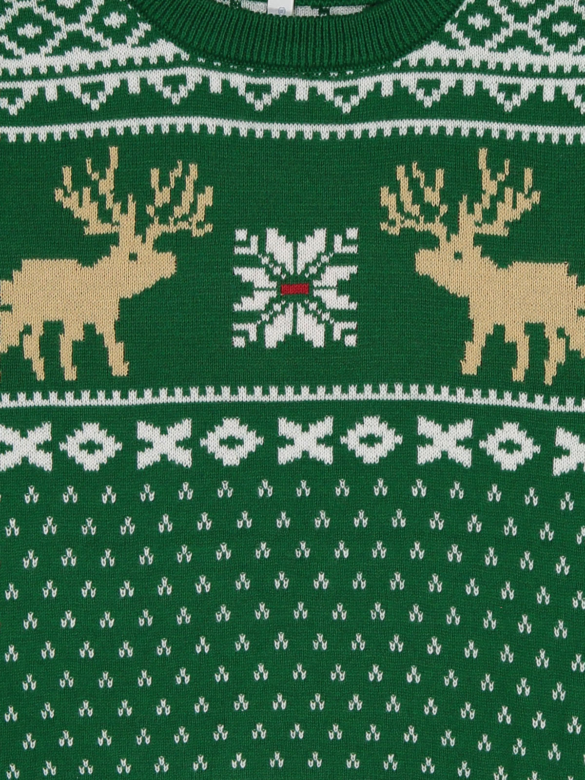 Maglioncino girocollo in caldo e morbido tricot con fantasia jacquard che richiama l’atmosfera del Natale. Un capo immancabile per le feste natalizie.