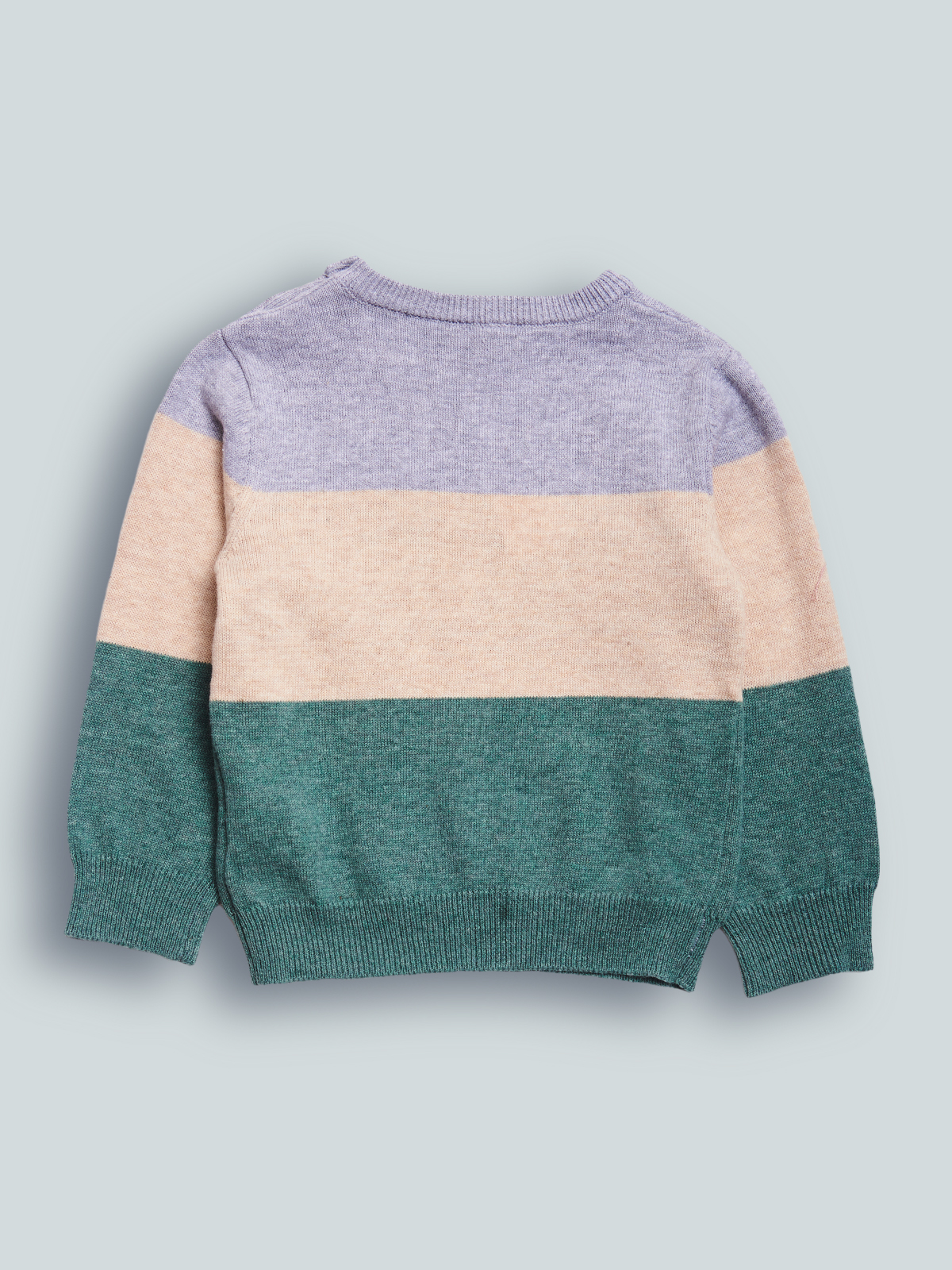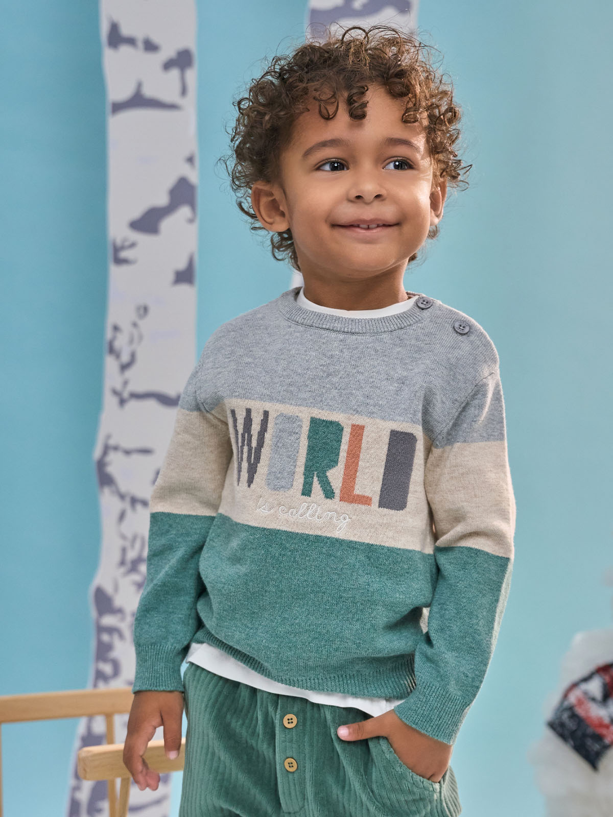 Maglioncino girocollo in morbido e caldo tricot rigato melange, pratica apertura con bottoncini su spalla. Scritta jacquard sul davanti. Un rigato nei colori di tendenza della stagione, facile da abbinare.