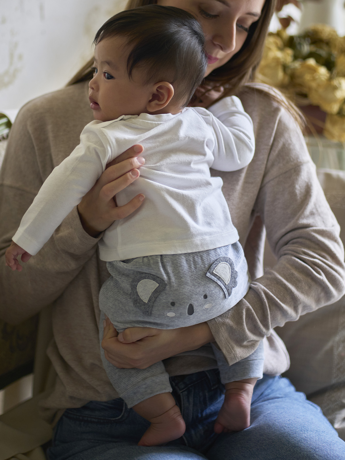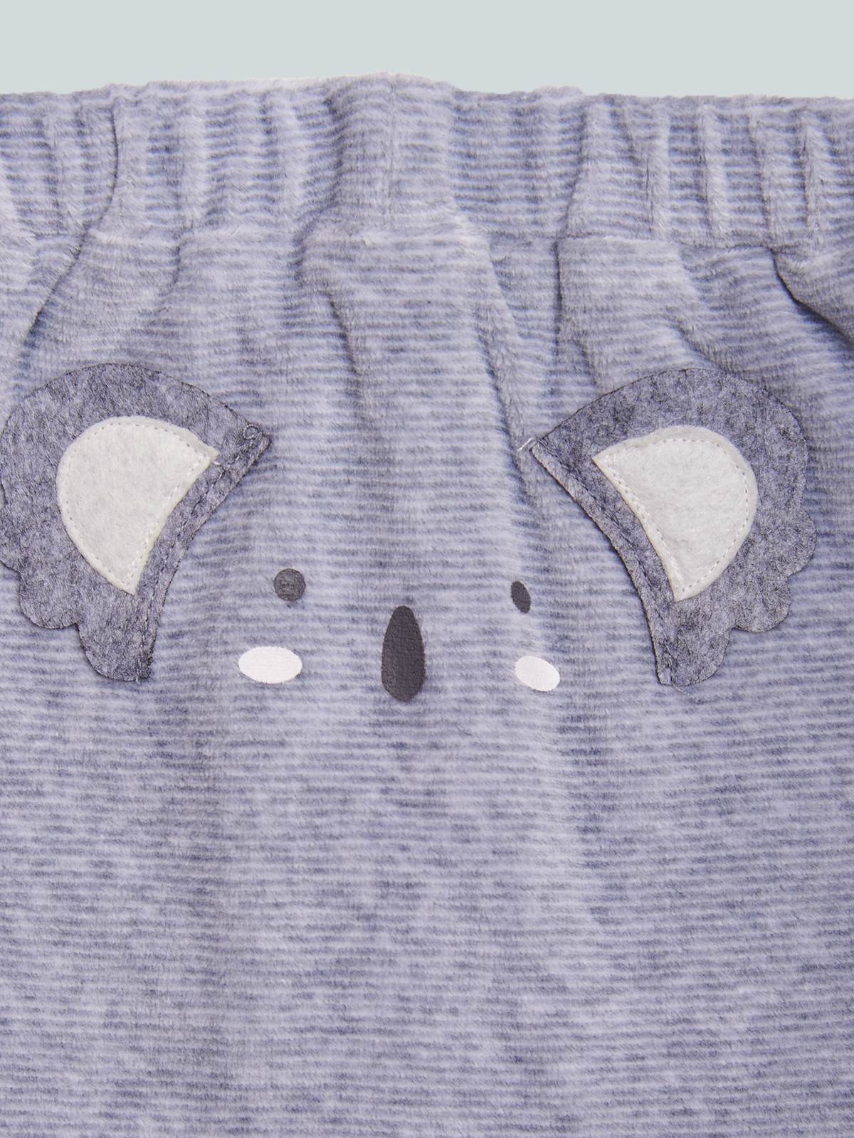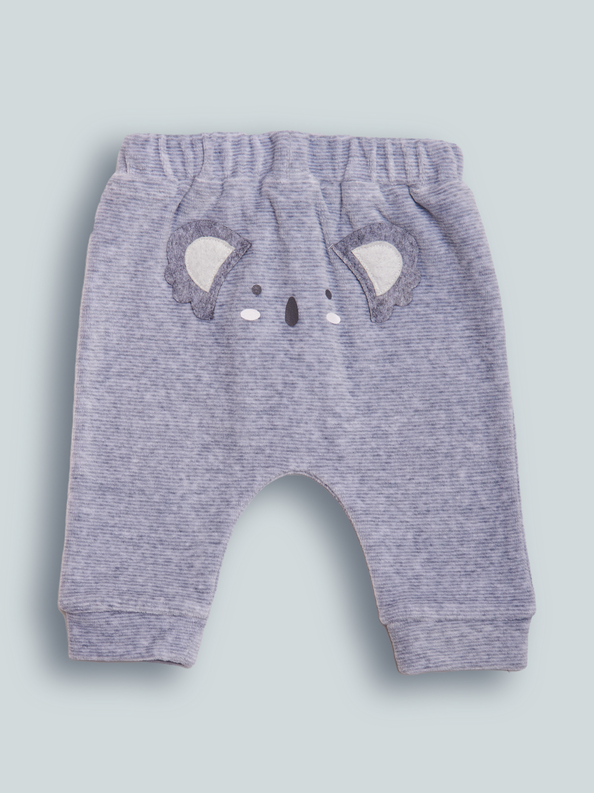 Pantaloni in Morbida ciniglia rigato tinto filo, vita elasticata, Modello jogger ampio nella parte superiore e più stretto nella caviglia. Due simpatiche orecchie e stampa Musetto sul dietro. Un capo pratico e alla Moda da indossare tutti i giorni.