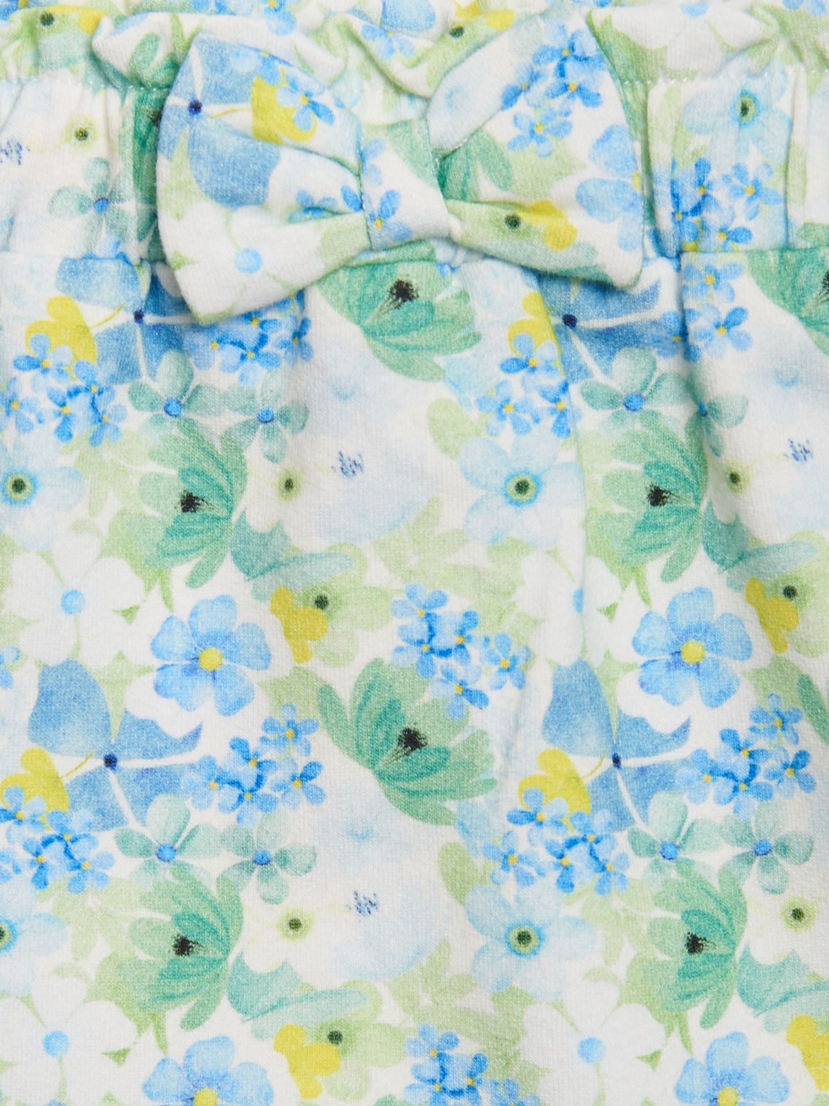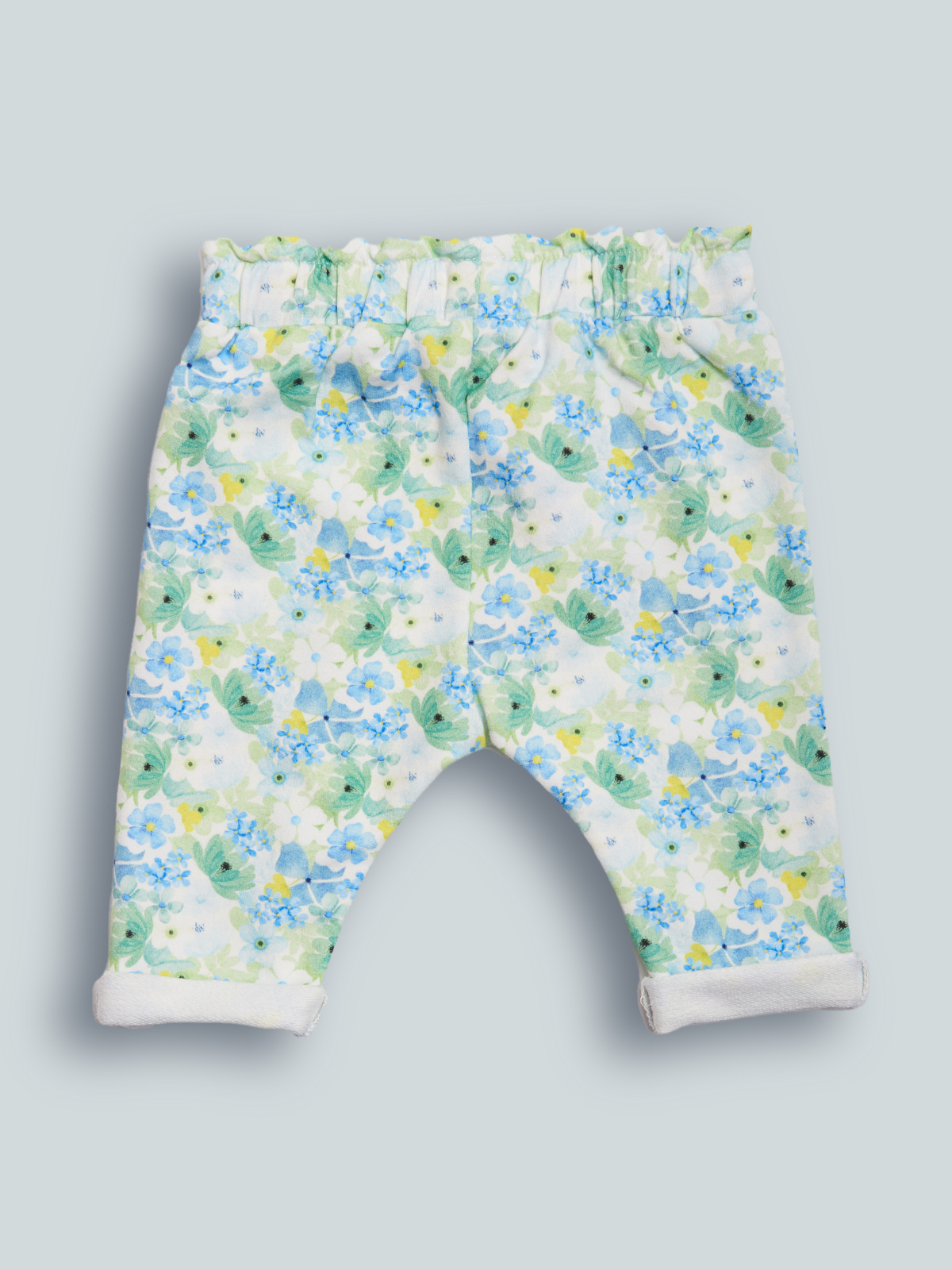 Pantaloni in felpa leggera elasticizzata stampato fantasia floreale. Vita arricciata con elastico interno e fiocco decorativo sul davanti. Moderni e Molto confortevoli.
