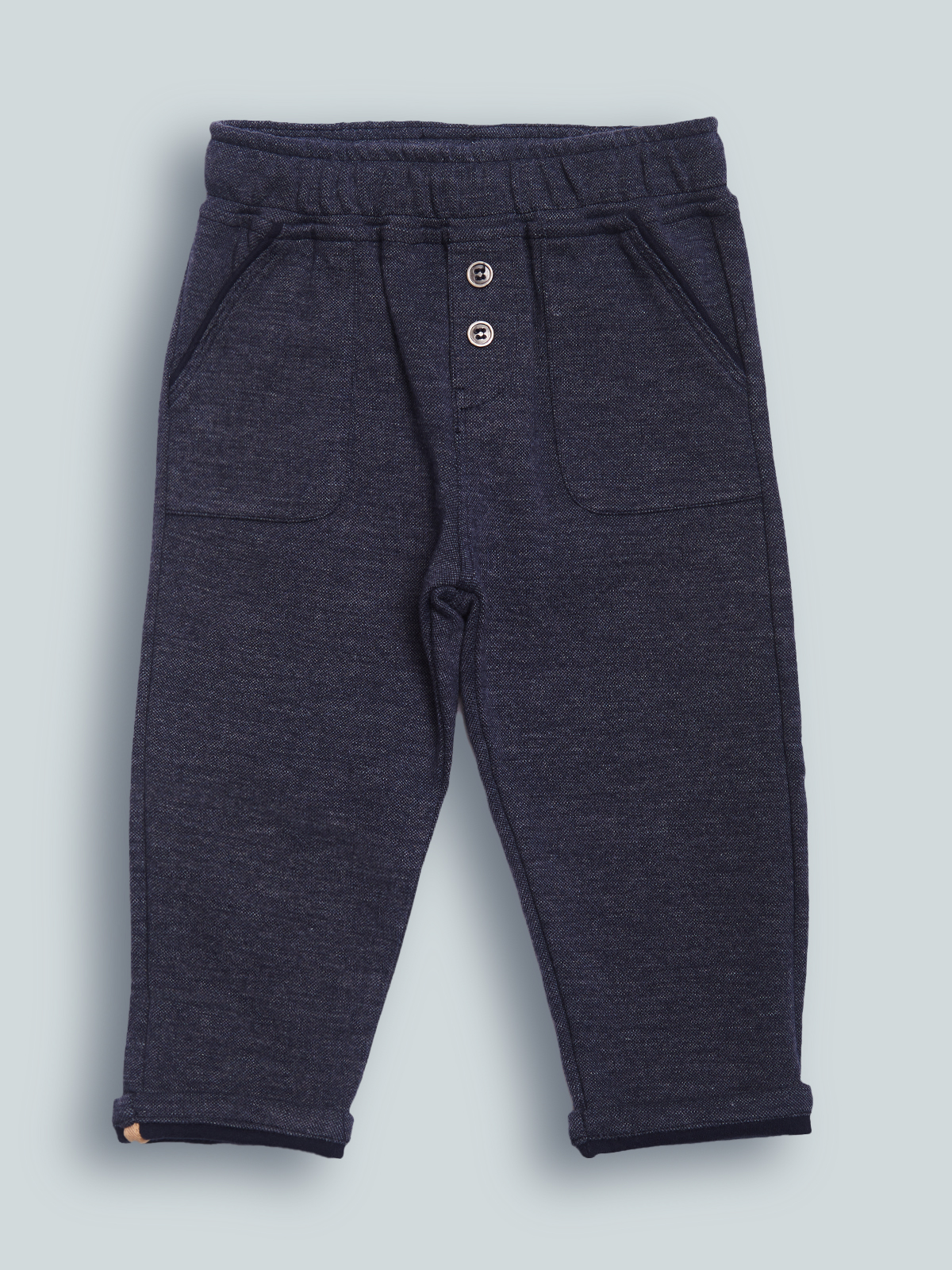 Pantaloni in tessuto Maglia elasticizzato, Modello con vita elasticata, pratiche tasche davanti, bottoncini decorativi sulla braghetta. Un capo pratico e comodo per giocare in libertà.