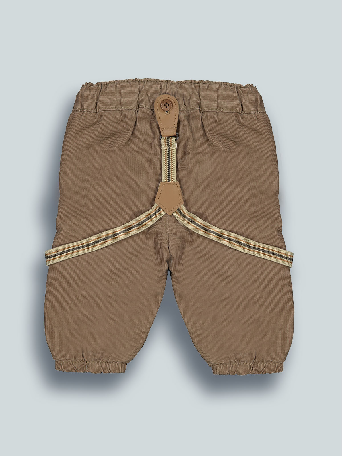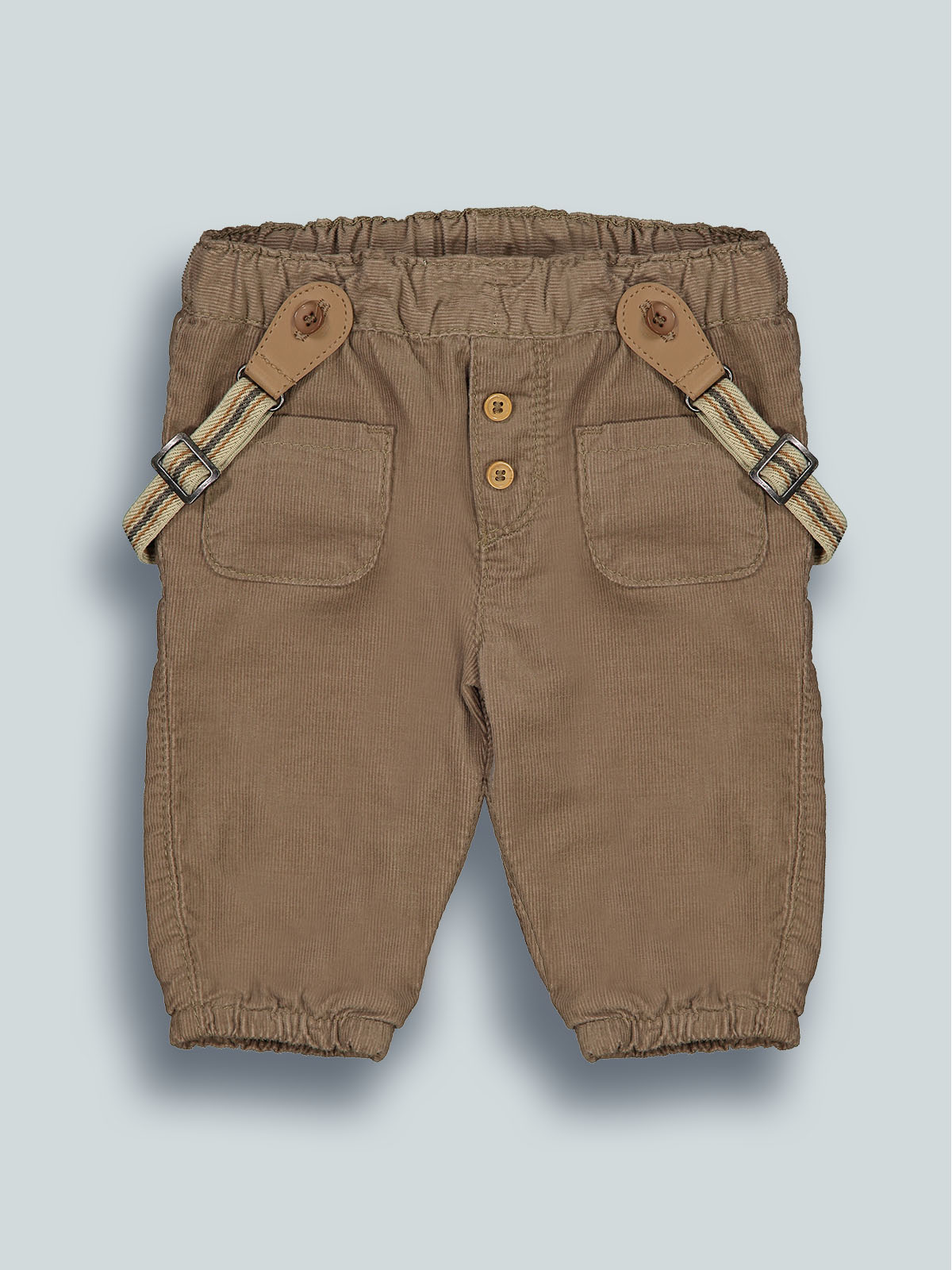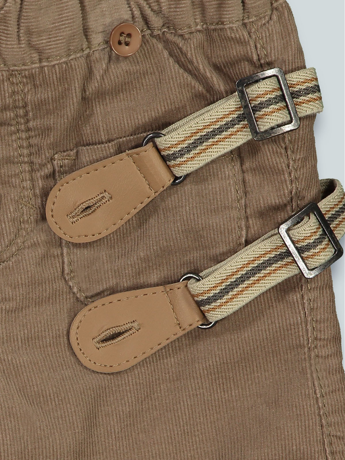 Pantaloni velluto foderato in jersey, vita elasticata regolabile e dettaglio bottoncini finto legno per braghetta. Dotato di bretelle removibili e regolabili. Un capo morbido e caldo facilmente abbinabile, ideale per l’inverno.