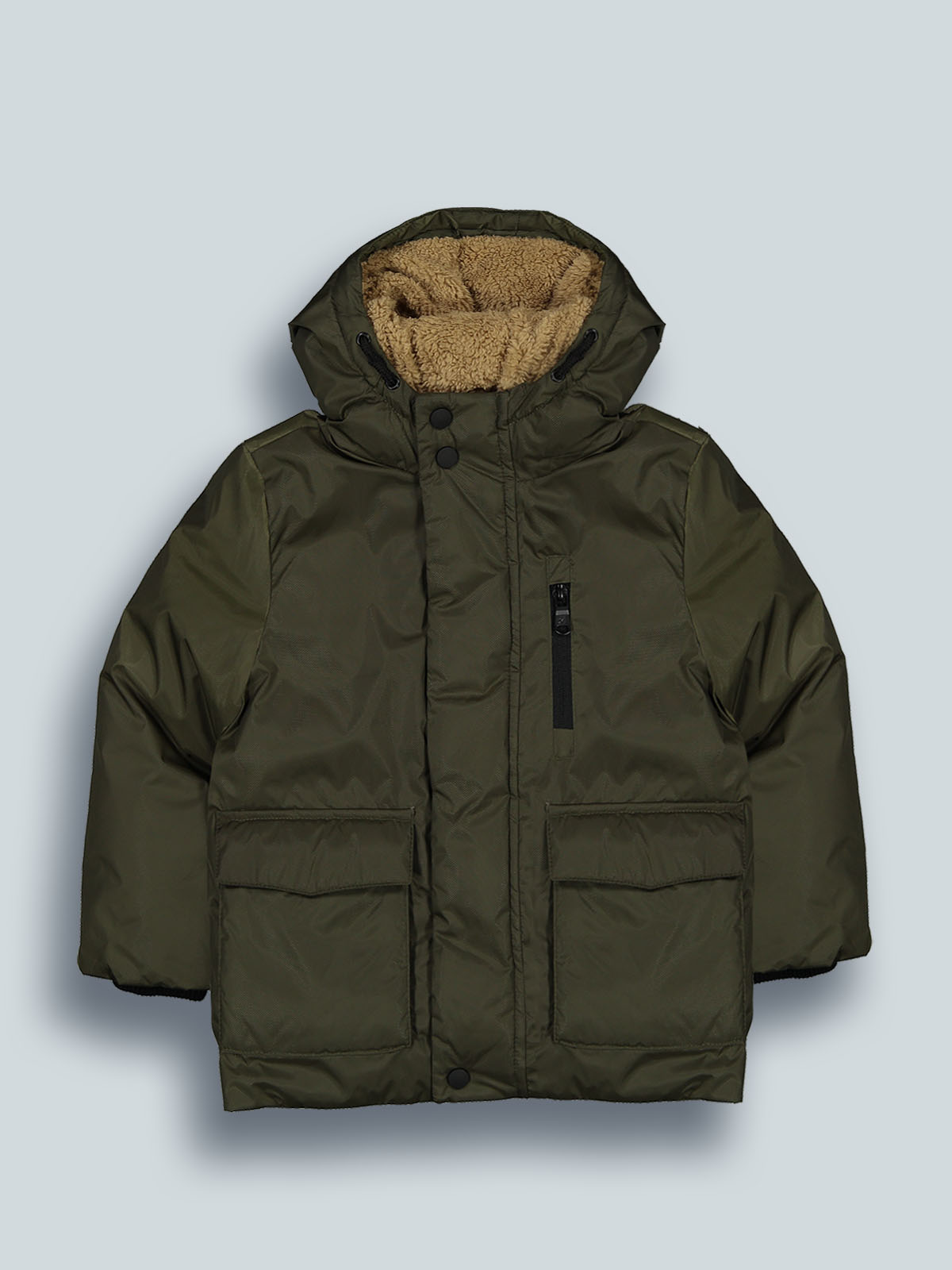 Parka con cappuccio in nylon rip stop, imbottito pesante. Aperto davanti con zip sotto alla patta e comodi bottoni a pressione. Tasche davanti con pattine e zip a contrasto sul petto, polsi salvaneve in morbida costina. Fodera interna in pile e nylon, interno cappuccio in soffice bouclette. Il capo ideale per rimanere bene al caldo.