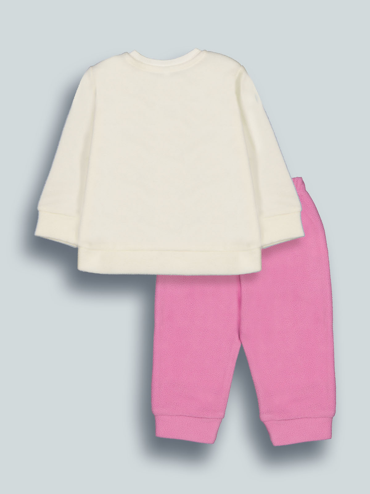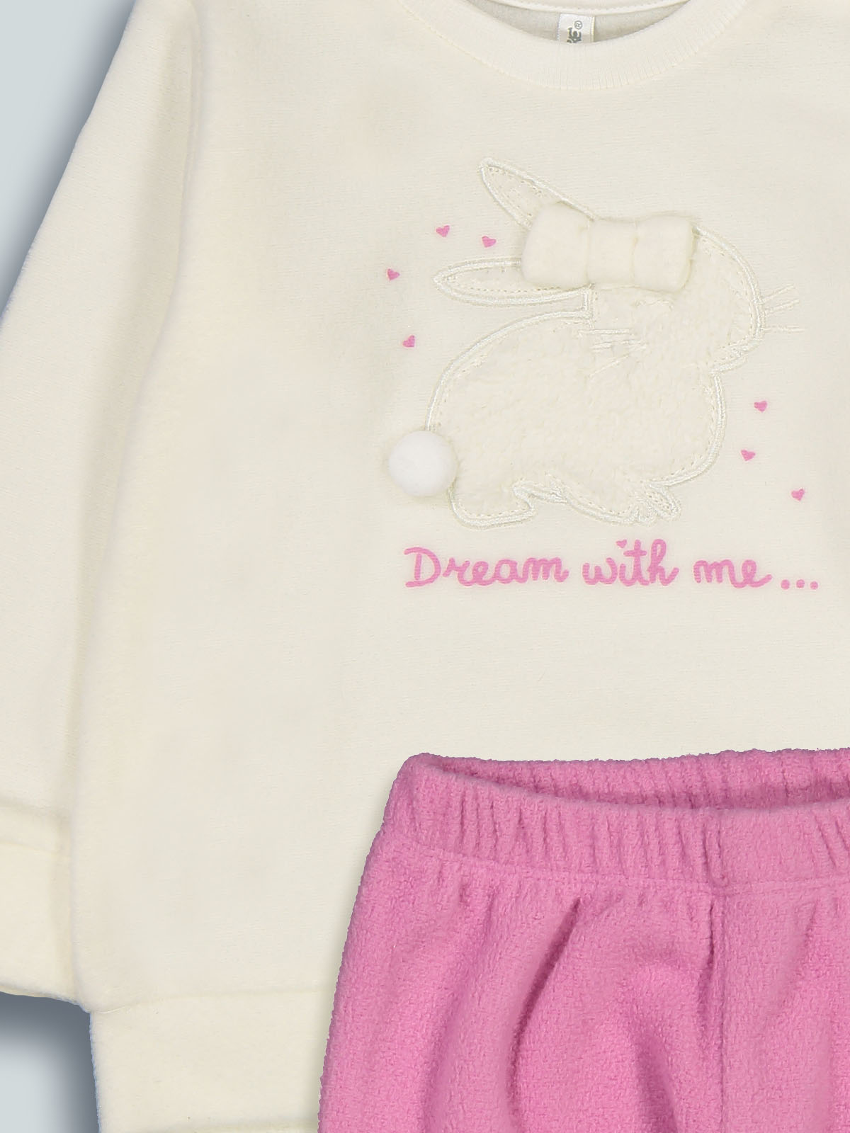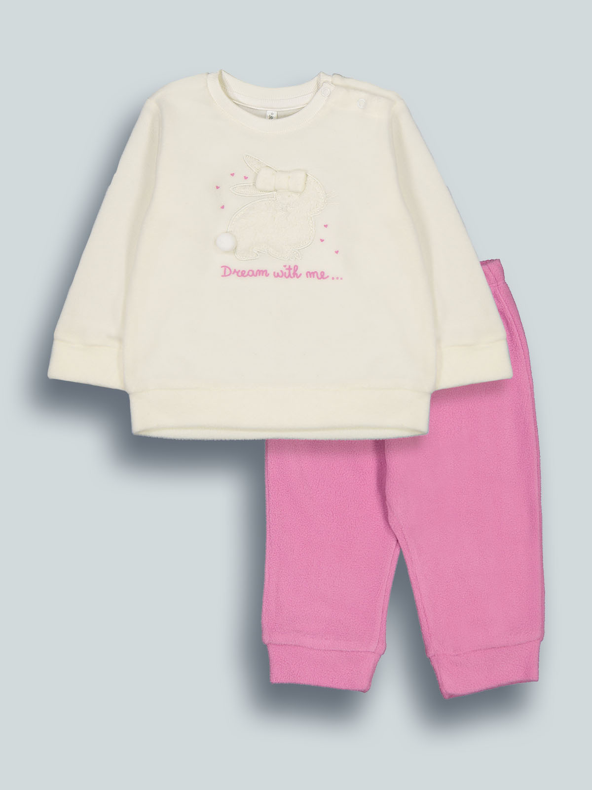 Pigiama due pezzi in morbido pile. Tshirt manica lunga con pratica apertura su spalla grazie ai bottoncini a pressione. Tenero coniglio a ricamo con fiocco e pompon in applicazione. Pantaloni con vita elasticata. Un capo caldo, morbido e confortevole, ideale per le fredde notti d’inverno.