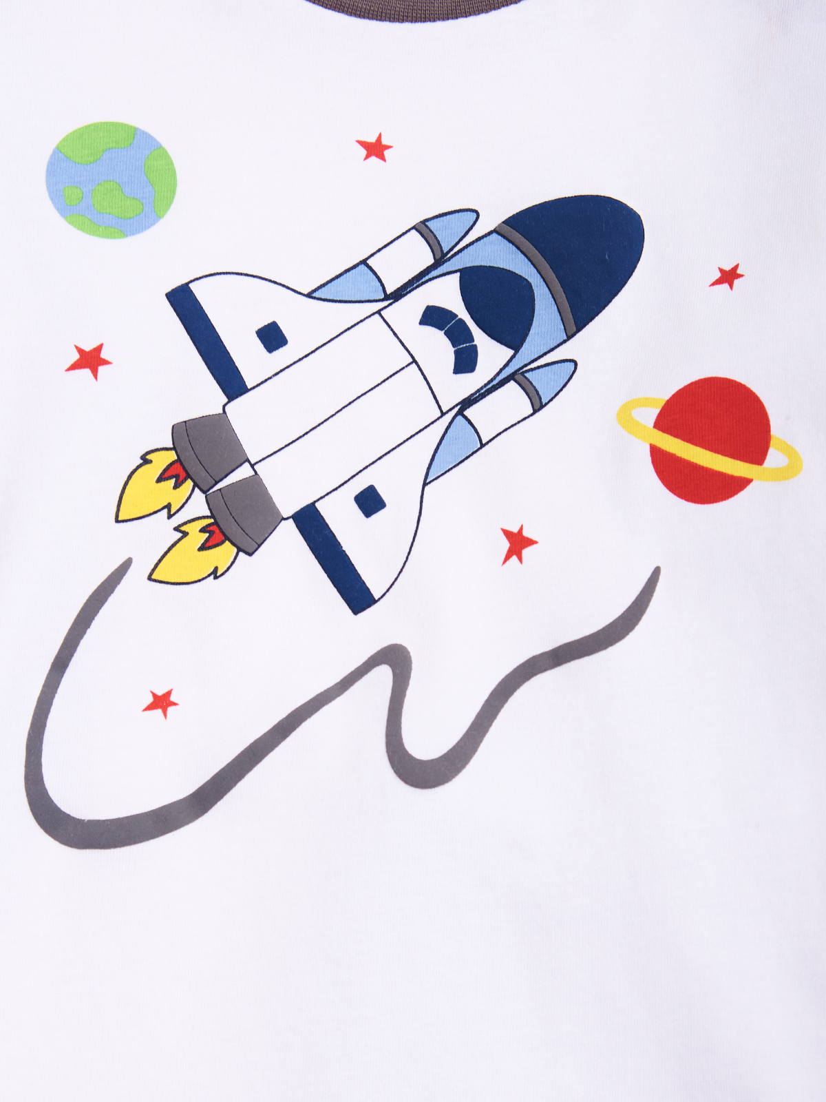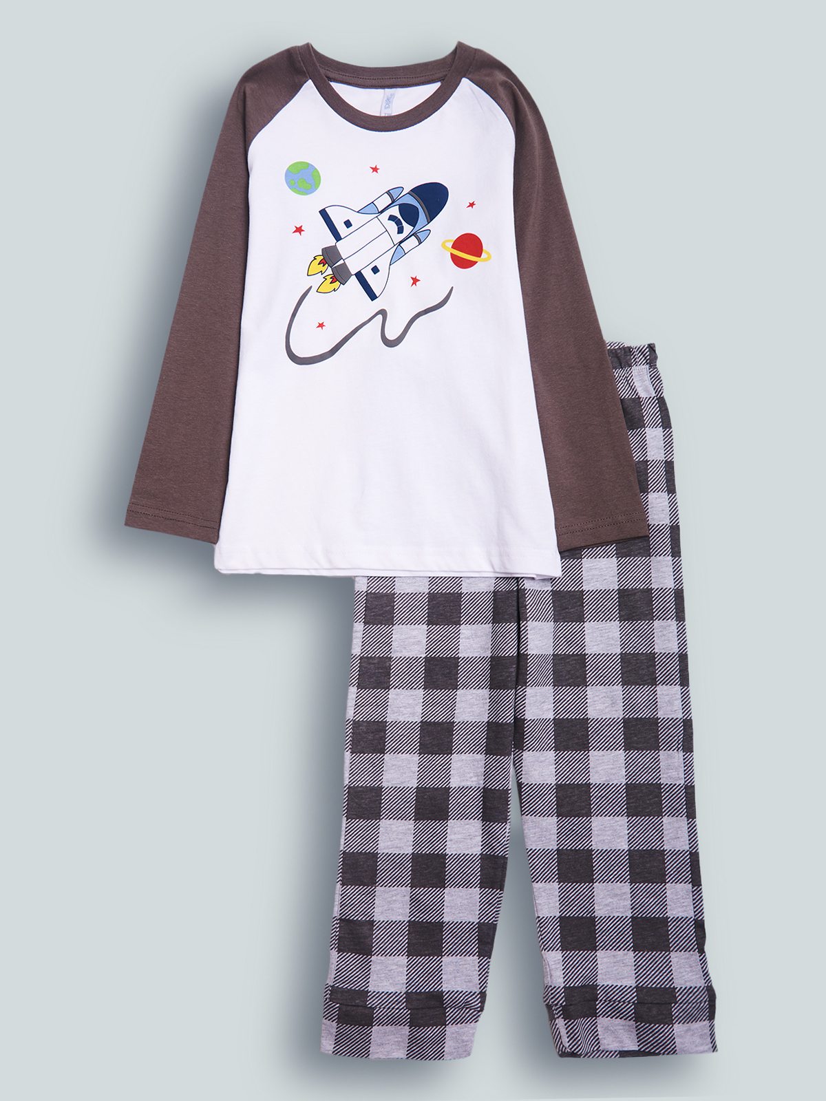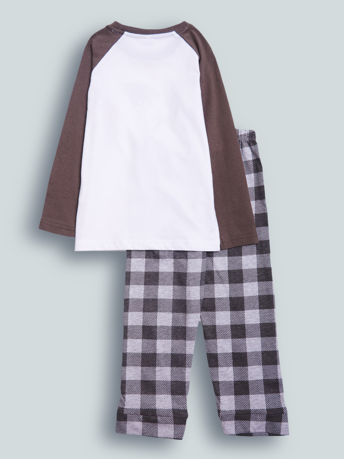Pigiama due pezzi in morbido cotone. Tshirt girocollo con manica lunga in contrasto e stampa sul davanti. Pantaloni a quadretti con pratico elastico a vita. Il capo ideale per fare lunghi sonni tranquilli.