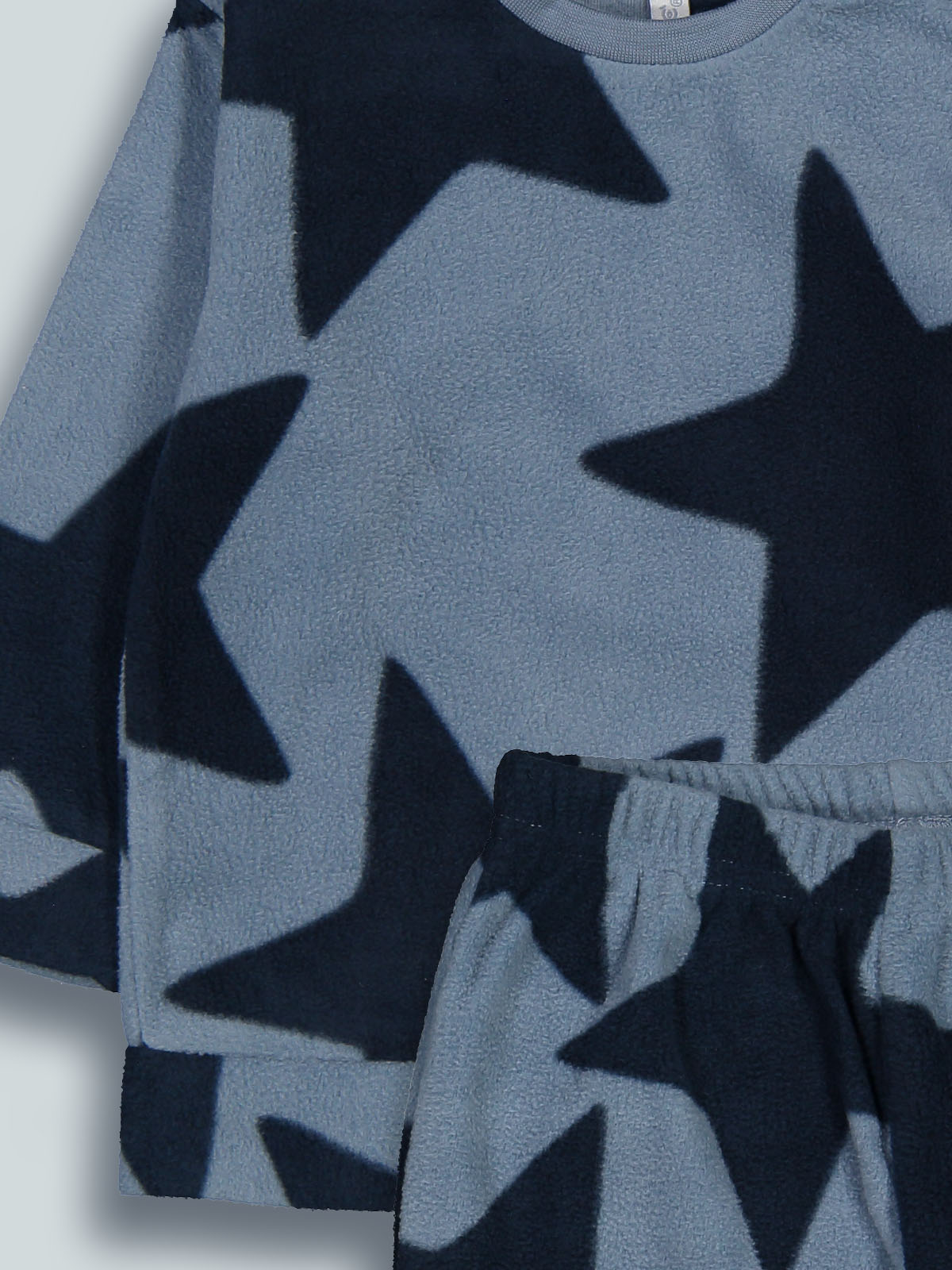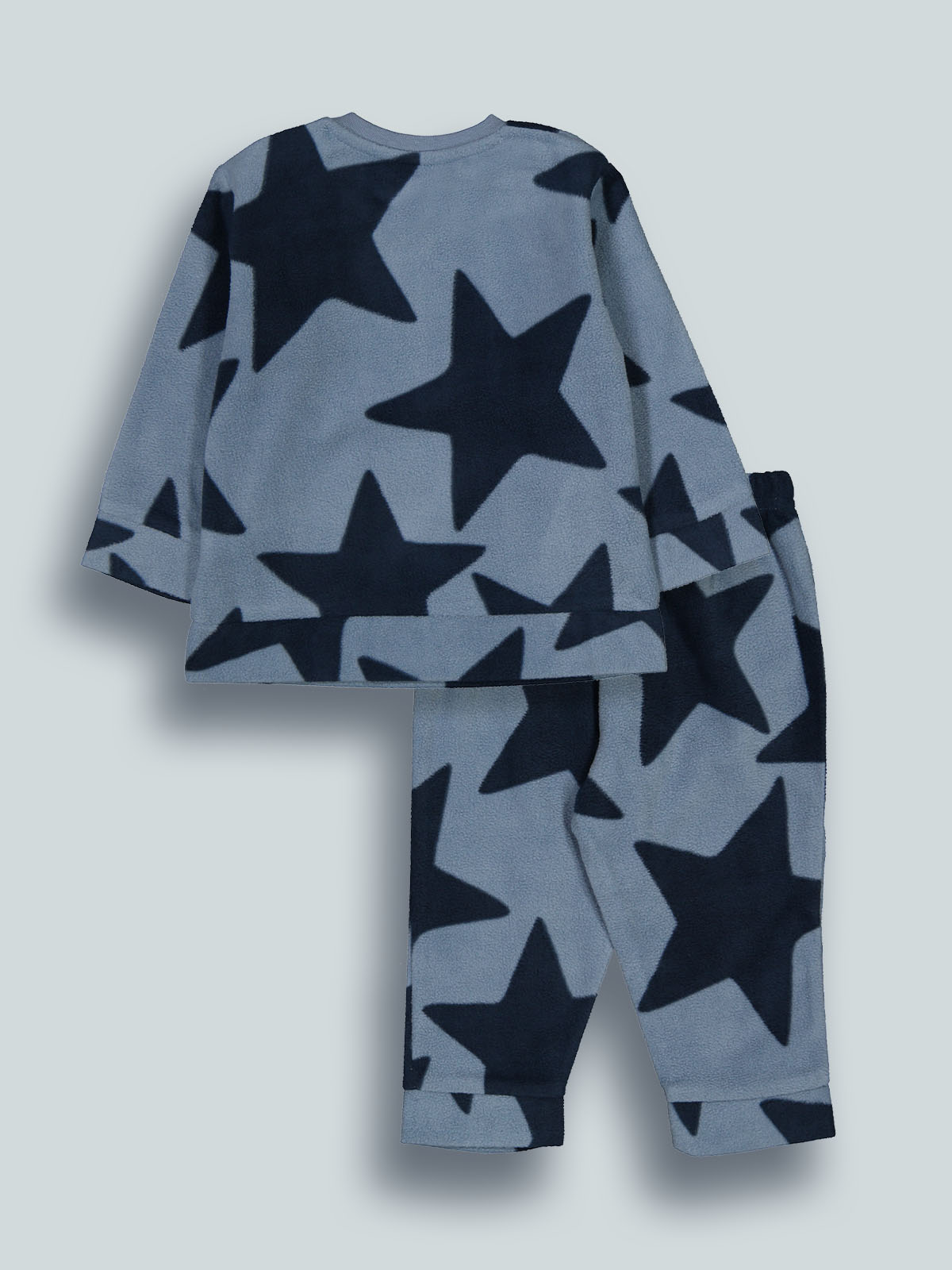 Pigiama due pezzi in pile leggero fantasia stelle. Tshirt a manica lunga, pratica apertura su spalla con bottoncini a pressione. Pantaloni con elastico a vita. Un capo caldo e confortevole, ideale per le notti più fredde.