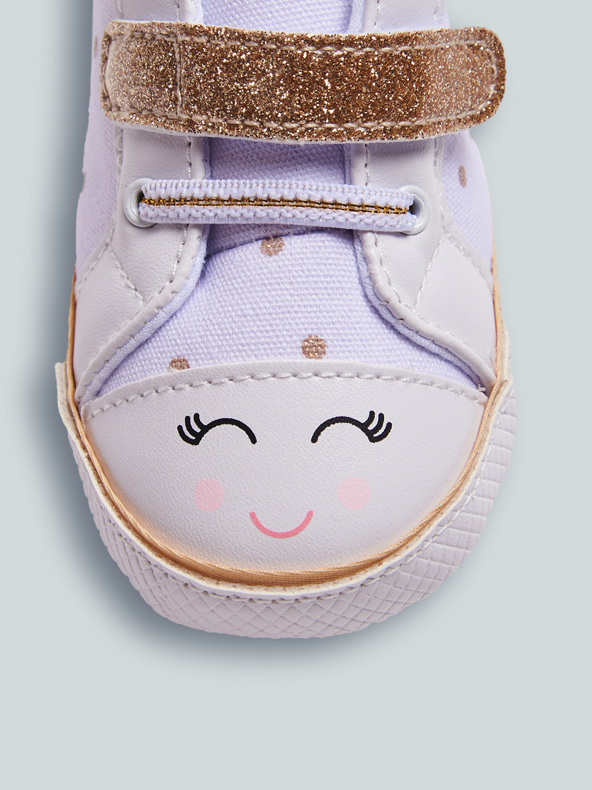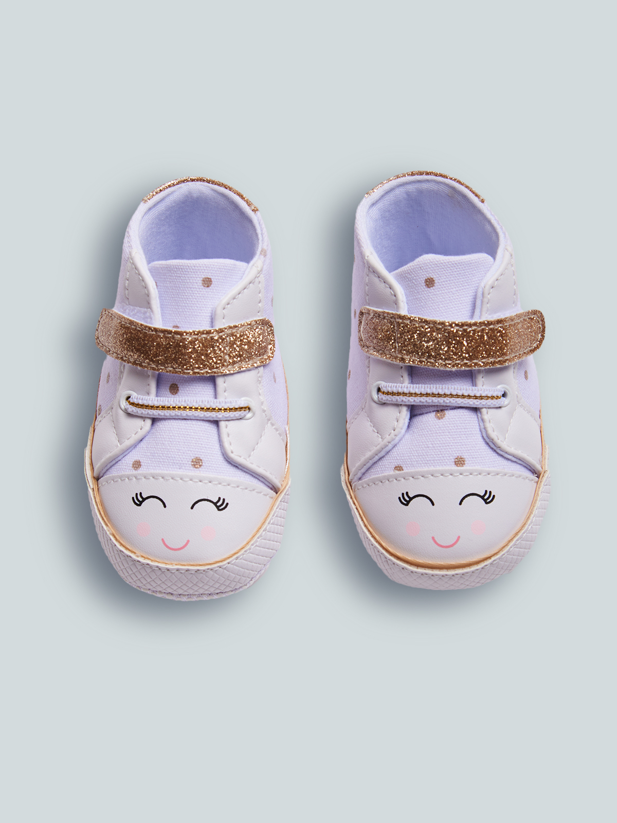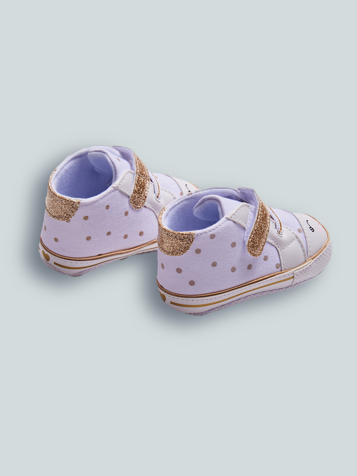 Le prime scarpine per neonata non possono che essere alla moda. Sneakers con particolari glitter, fondo antiscivolo. Chiusura con velcro e lacci elasticizzati che garantiscono una migliore vestibilità e semplificano la calzata. Questo articolo è spedito all’interno di una confezione della linea Newborn, ideale come regalo.