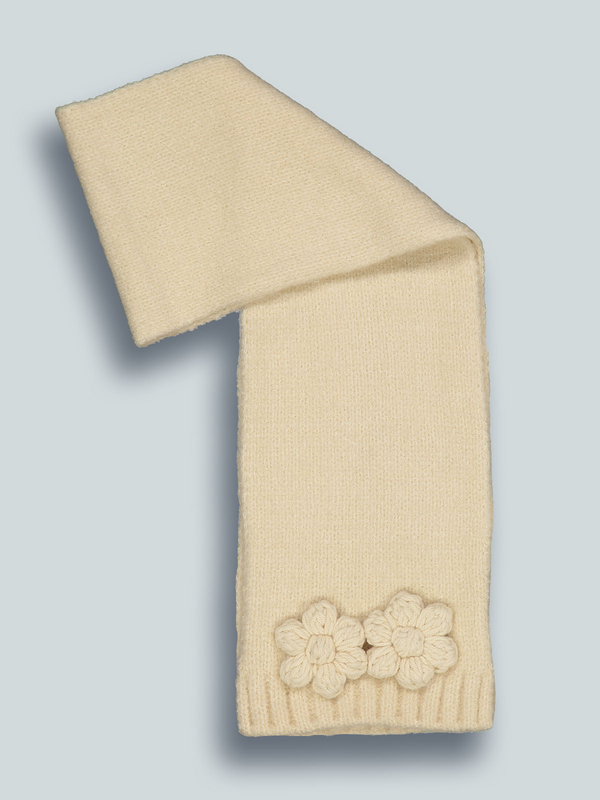 Sciarpa in maglia di morbido misto cotone con fiori tridimensionali. E’ perfettamente abbinabile con la sua cuffia coordinata, realizzata con lo stesso filato. La sciarpa ideale da indossare nelle fredde giornate invernali.