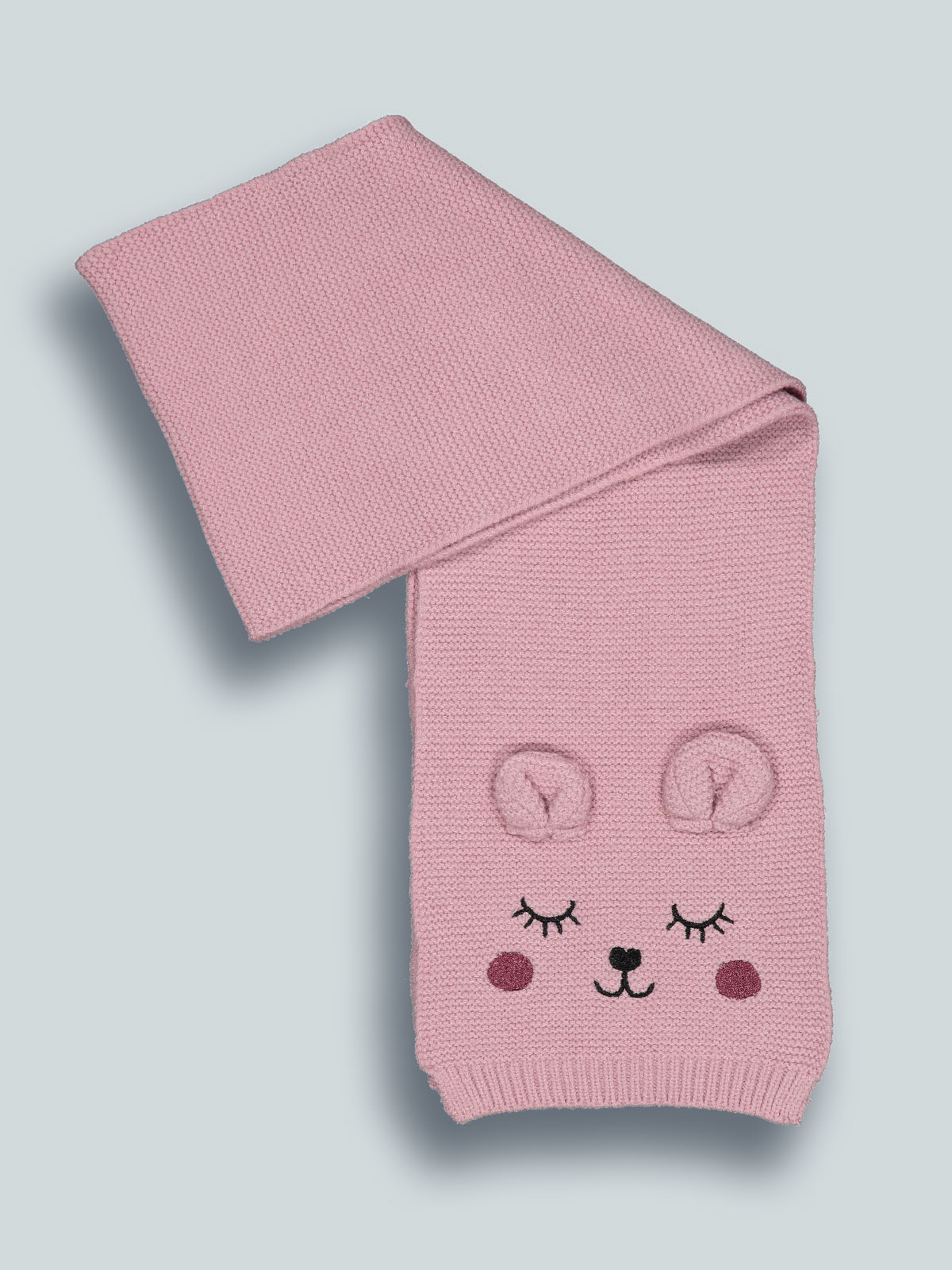 Sciarpa in maglia di morbido cotone con simpatico musetto e orecchie tridimensionali. E’ perfettamente abbinabile alla sua cuffia coordinata, e alle sue moffole, realizzati con lo stesso filato. La sciarpa ideale per tenere al caldo la vostra bambina nelle giornate invernali.