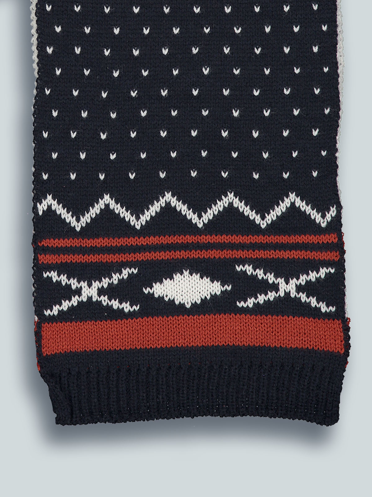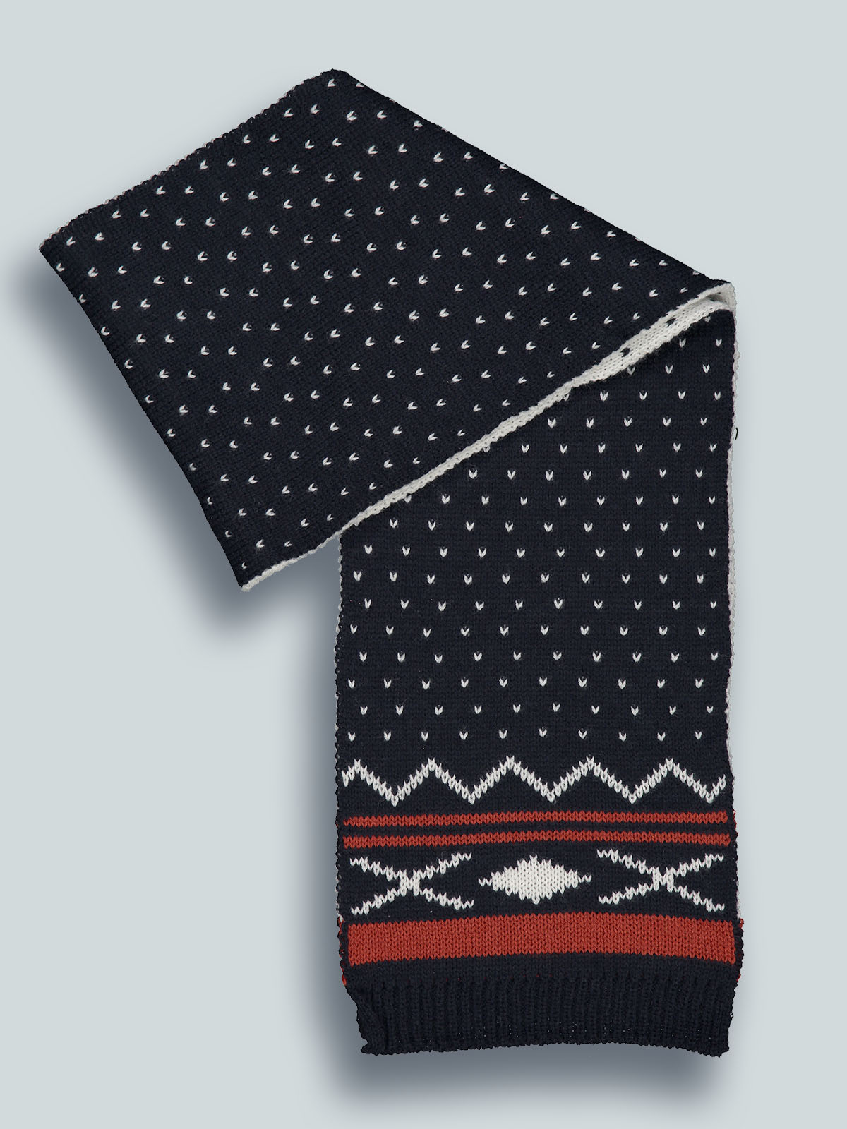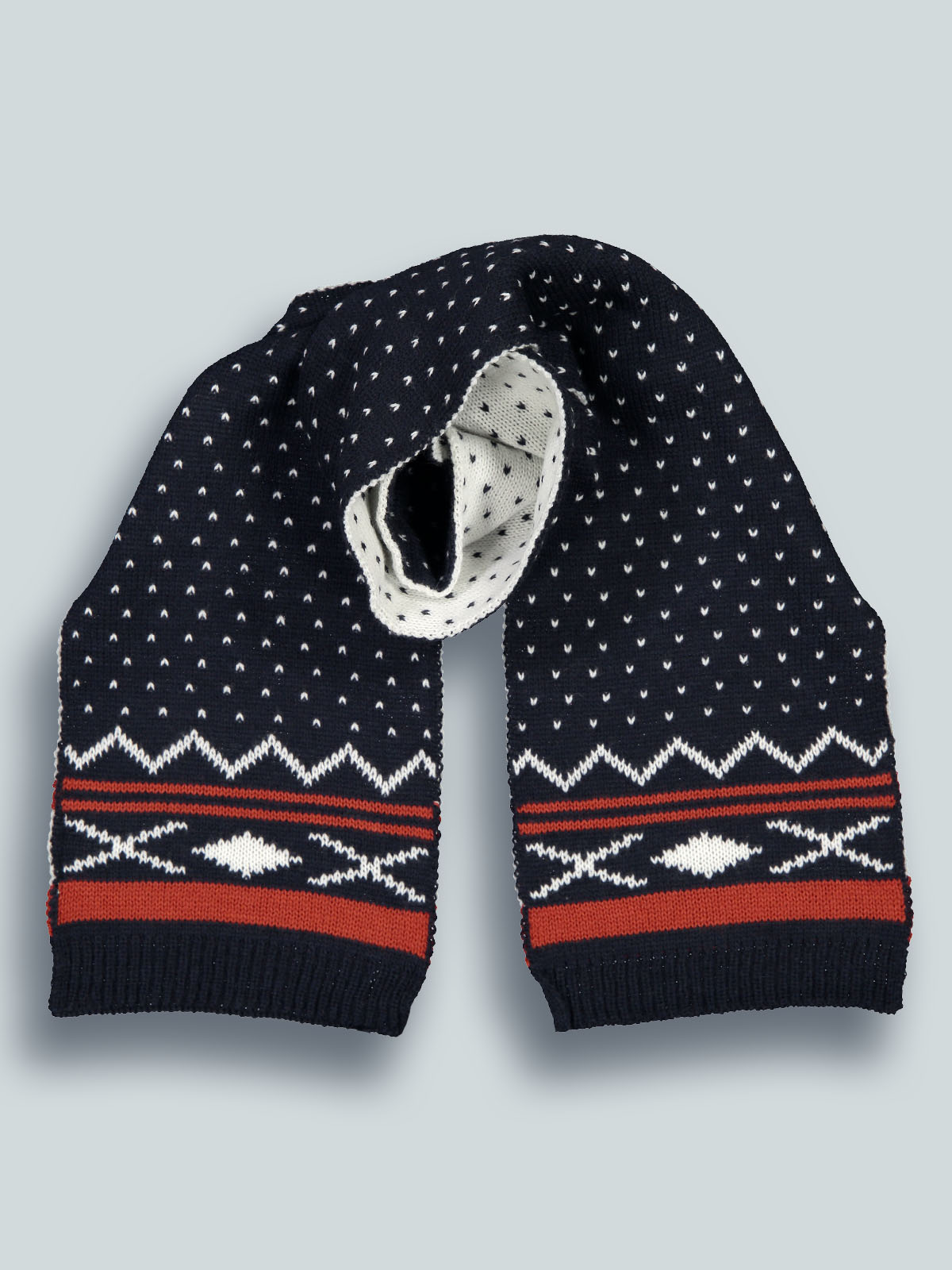 Sciarpa in caldo e morbido tricot con lavorazione greche jacquard. Pensata in abbinamento alla sua cuffia. Il capo ideale per la stagione più fredda.