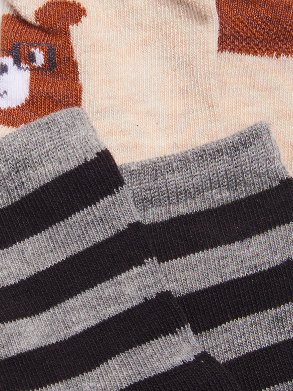 Set due paia di calzini in Morbido Misto cotone. Una variante in beige Melange con simpatico orsetto e orecchie tridimensionali. L’altra variante rigata. Due proposte differenti, da abbinare in base al look della giornata.