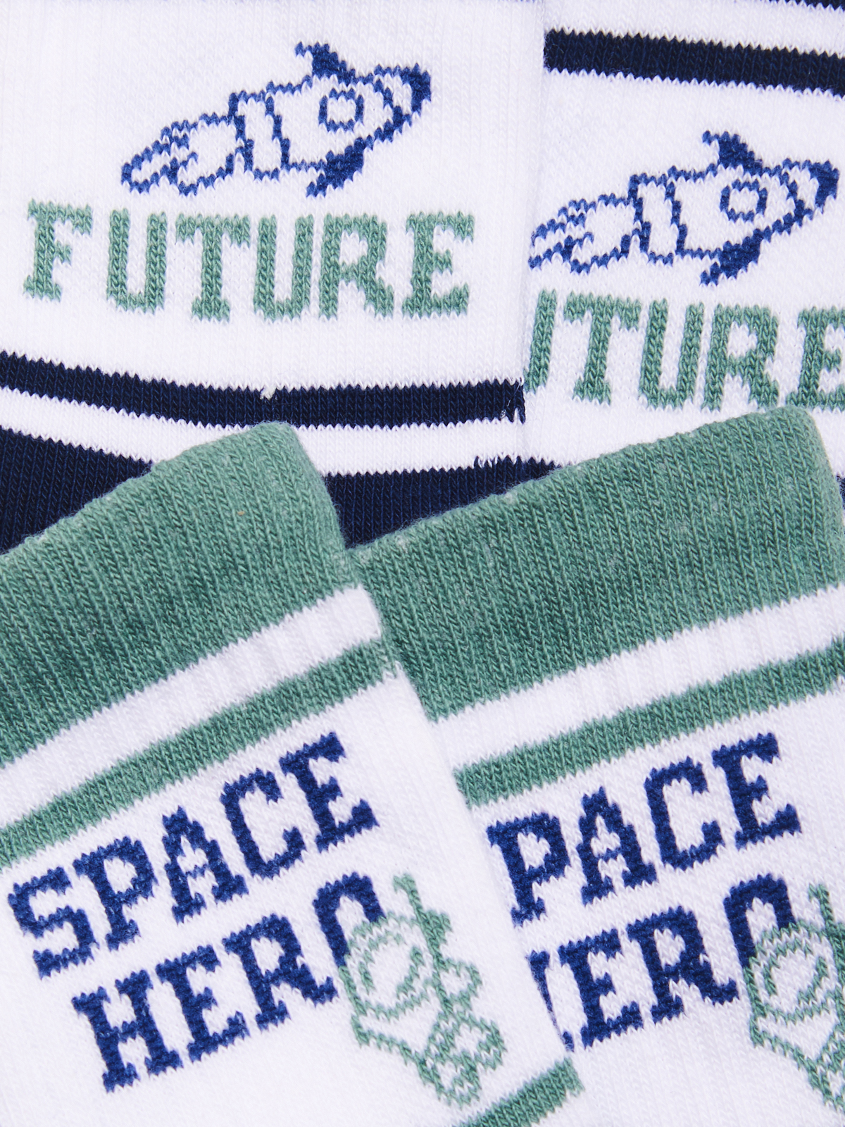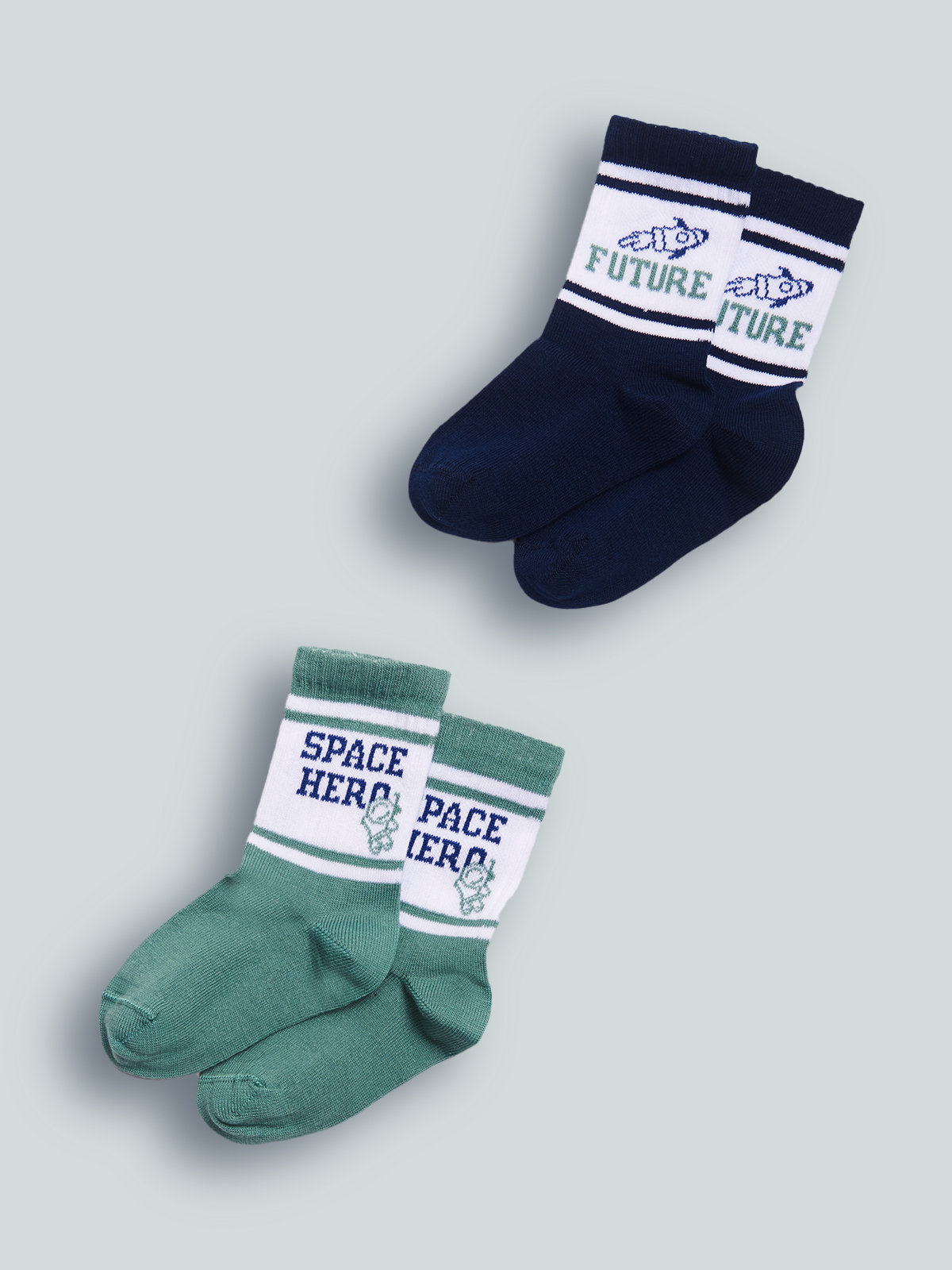 Set due paia di calzini in Morbido Misto cotone. Lavorazione costa per la parte alta della calza con disegno e scritta in tema spazio che piace sempre ai bambini.