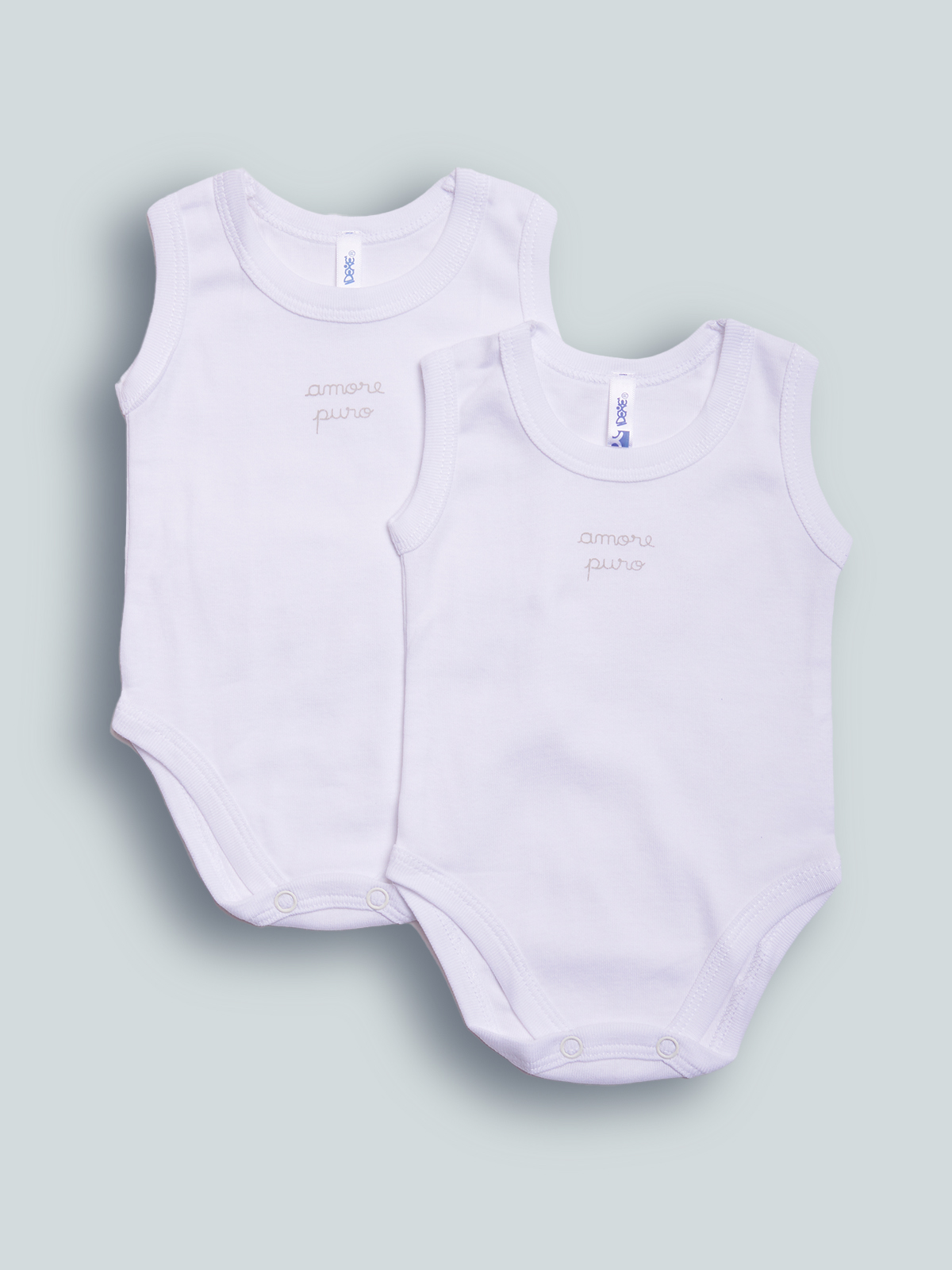 Set composto da due body smanicati in costina cotone. Apertura al cavallo con pratici bottoncini a pressione. La confezione comprende due body in tinta unita.