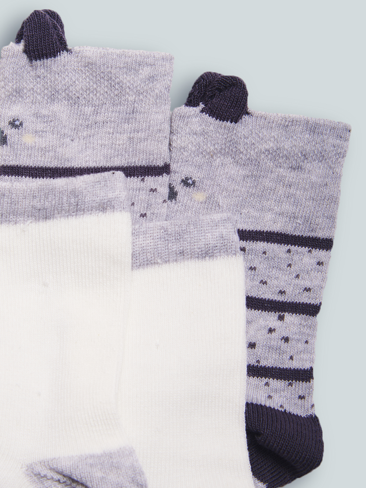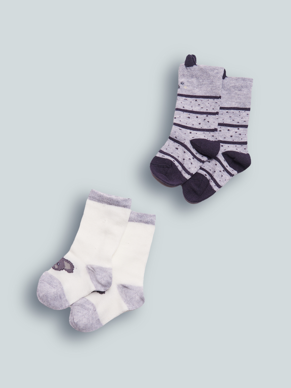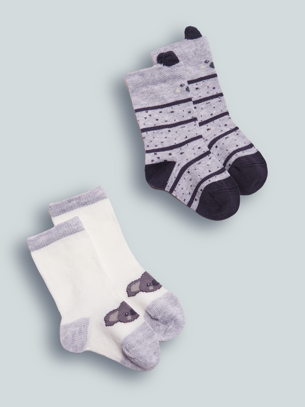 Calzini in Morbido Misto cotone. Doppia variante: uno rigato con orecchie 3D, l’altro unito con koala. La proposta ideale per essere alla Moda dalla testa ai piedi.