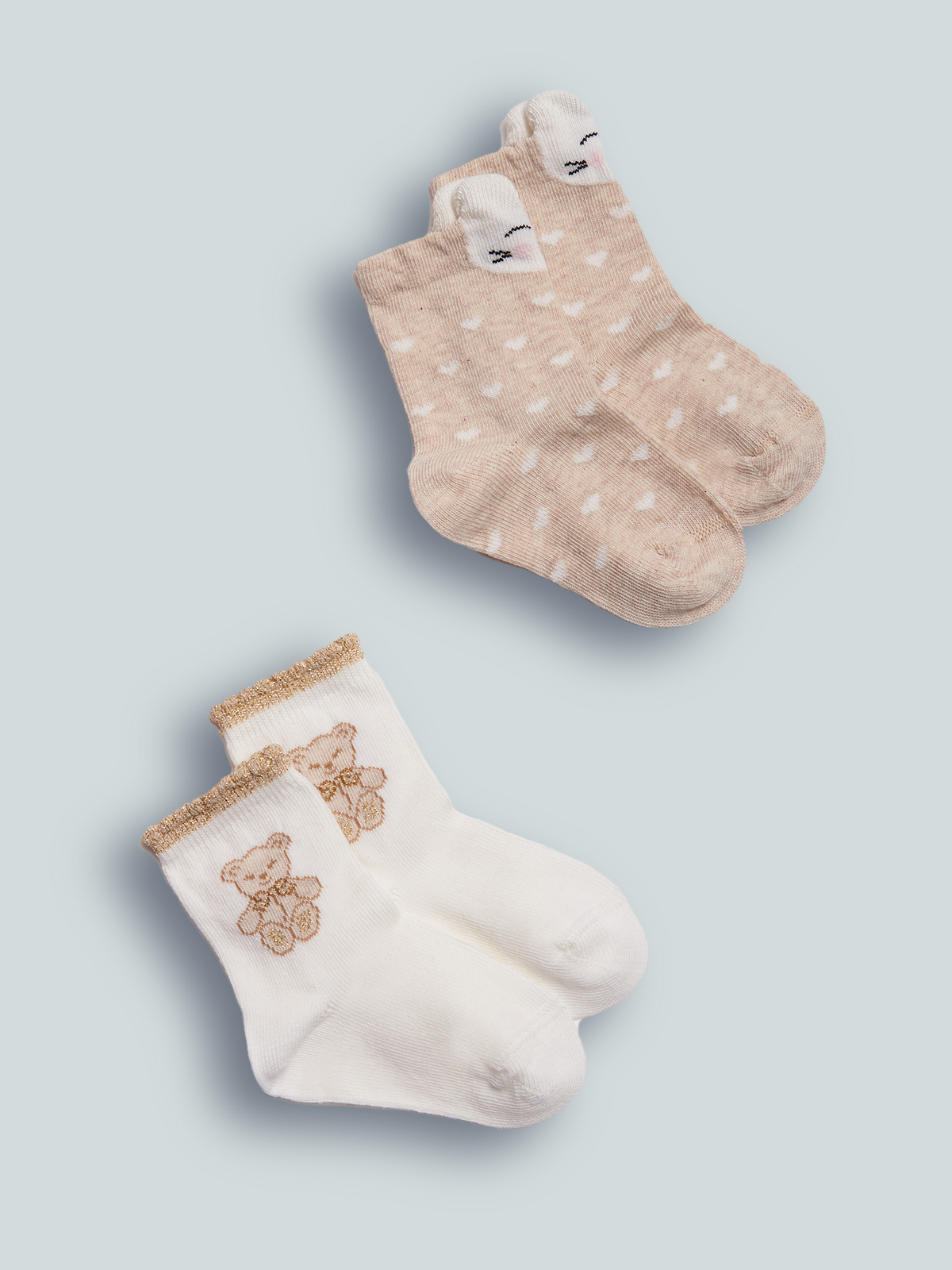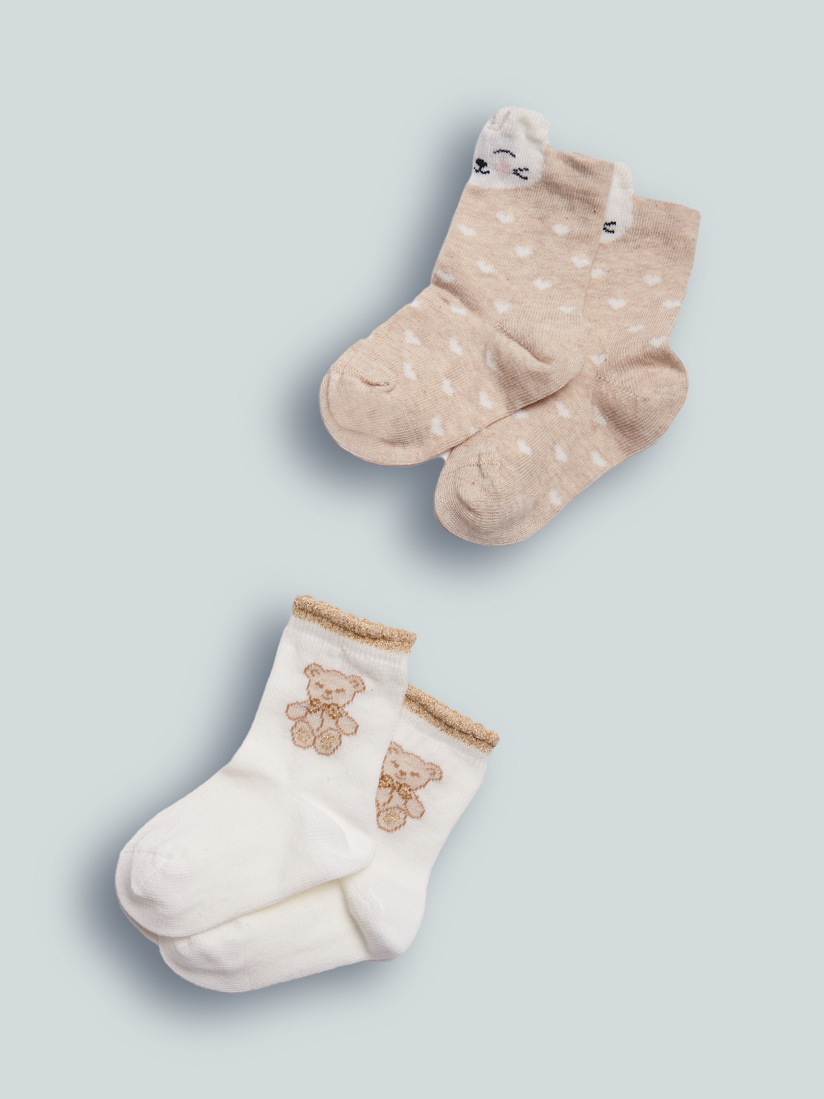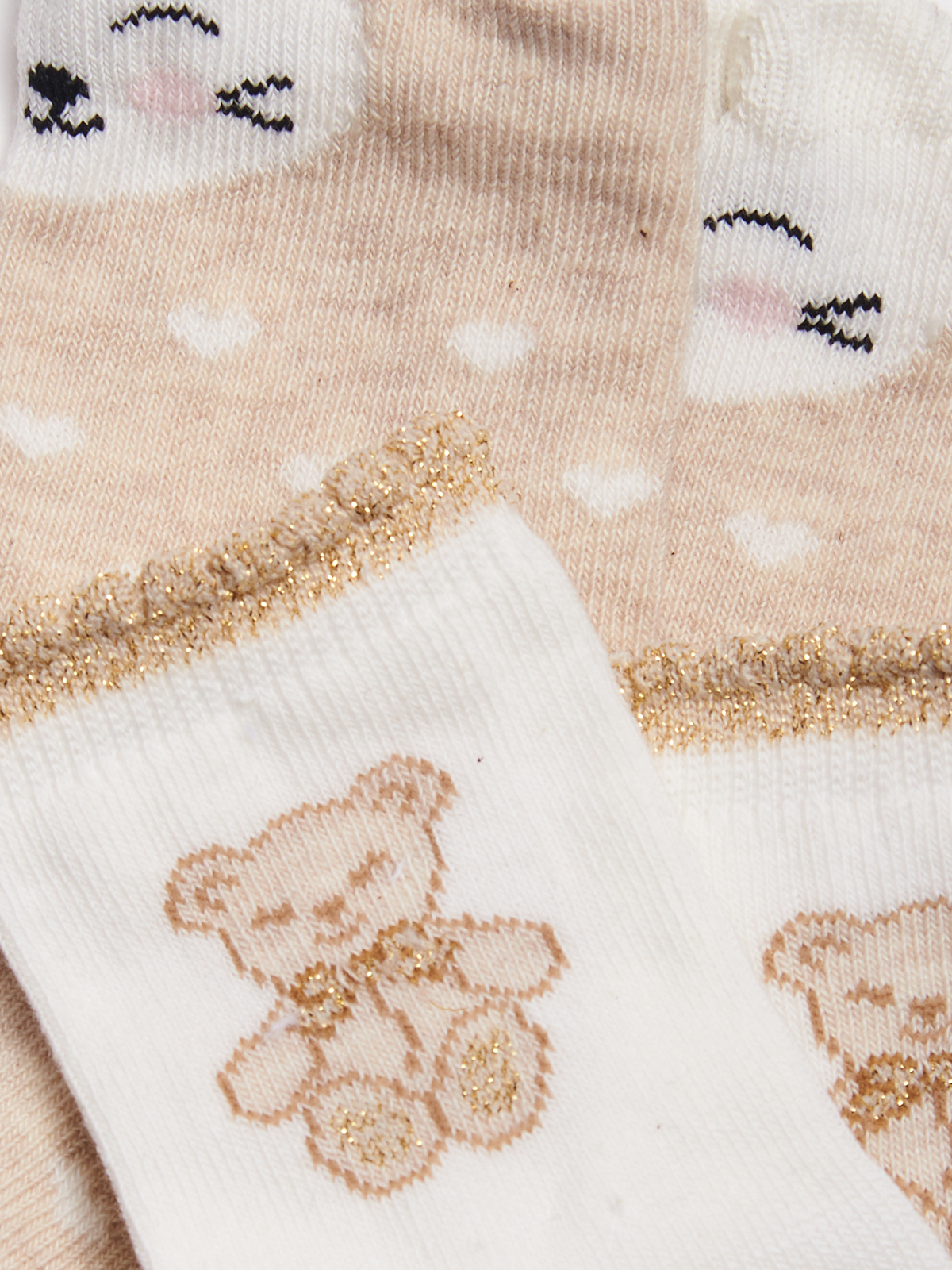 Calzini lunghezza sopra caviglia in Morbido Misto cotone. Due varianti colore: latte con orsetto e bordino lurex oro, grigio Melange fantasia pois e dettaglio Musetto. In un unico acquisto avrete tre proposte colorate e alla Moda!