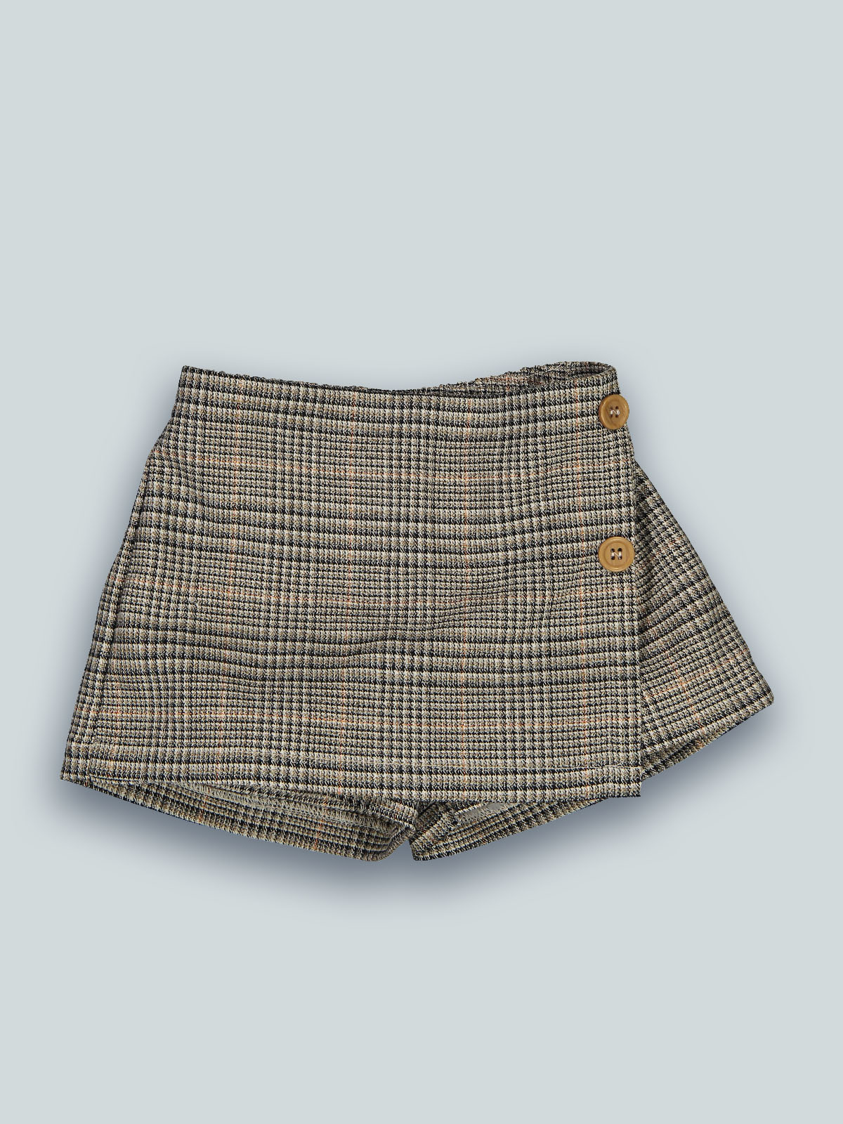 Short gonna in morbida flanella scozzese con vita elasticata per maggiore comodità. Foderato internamente in tessuto di cotone. Bottoncini effetto legno decorativi per ancora più femminilità. Ideale da abbinare ai collant della collezione per un total look alla moda