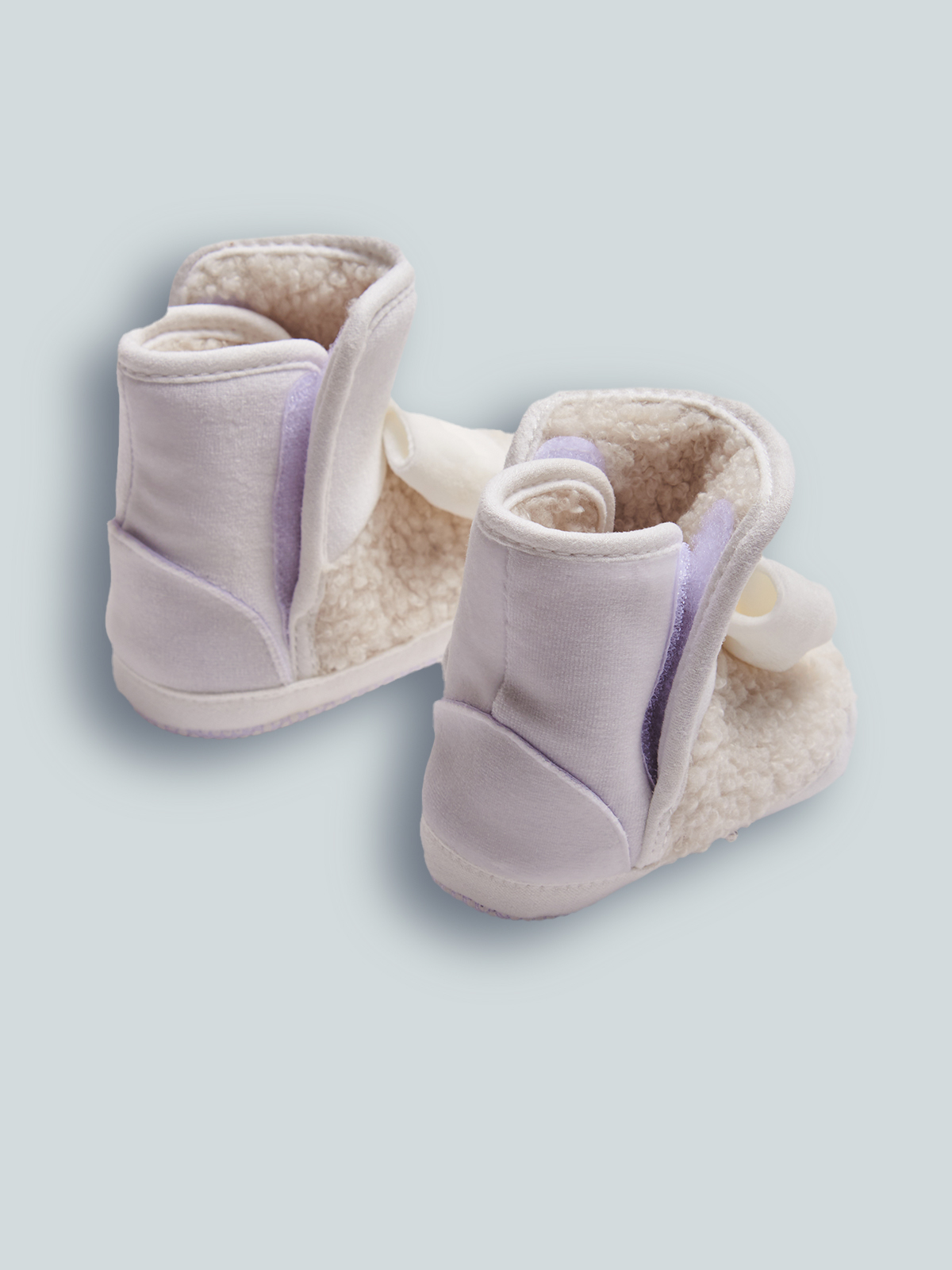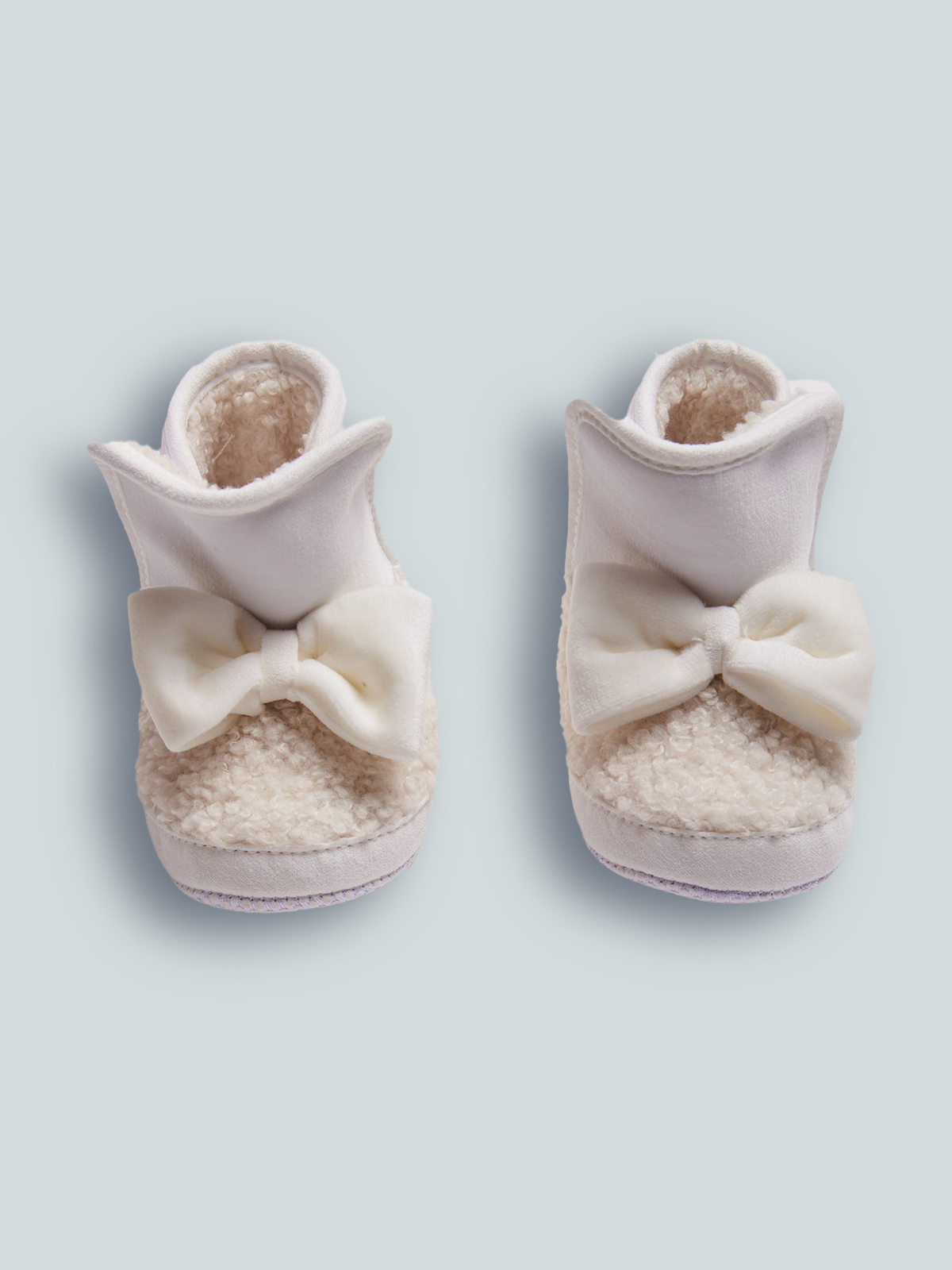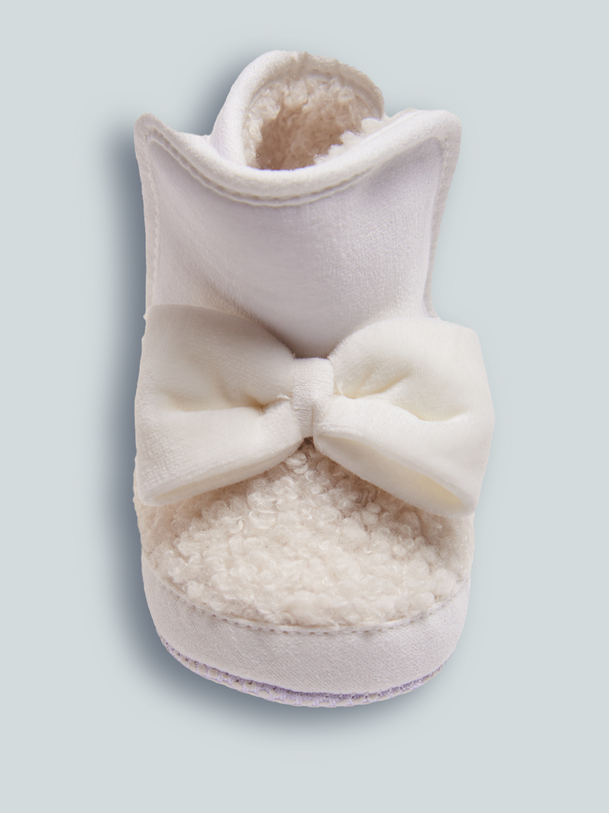 Stivaletti per neonata, comodi per proteggere i suoi piedi durante i mesi invernali. Rivestimento interno peluche ed esterno con effetto scamosciato. Chiusura con velcro dietro per una calzata veloce e semplice. Elementi decorativi: fiocco sul davanti. Questo articolo è spedito all’interno di una confezione della linea Newborn, ideale come regalo.