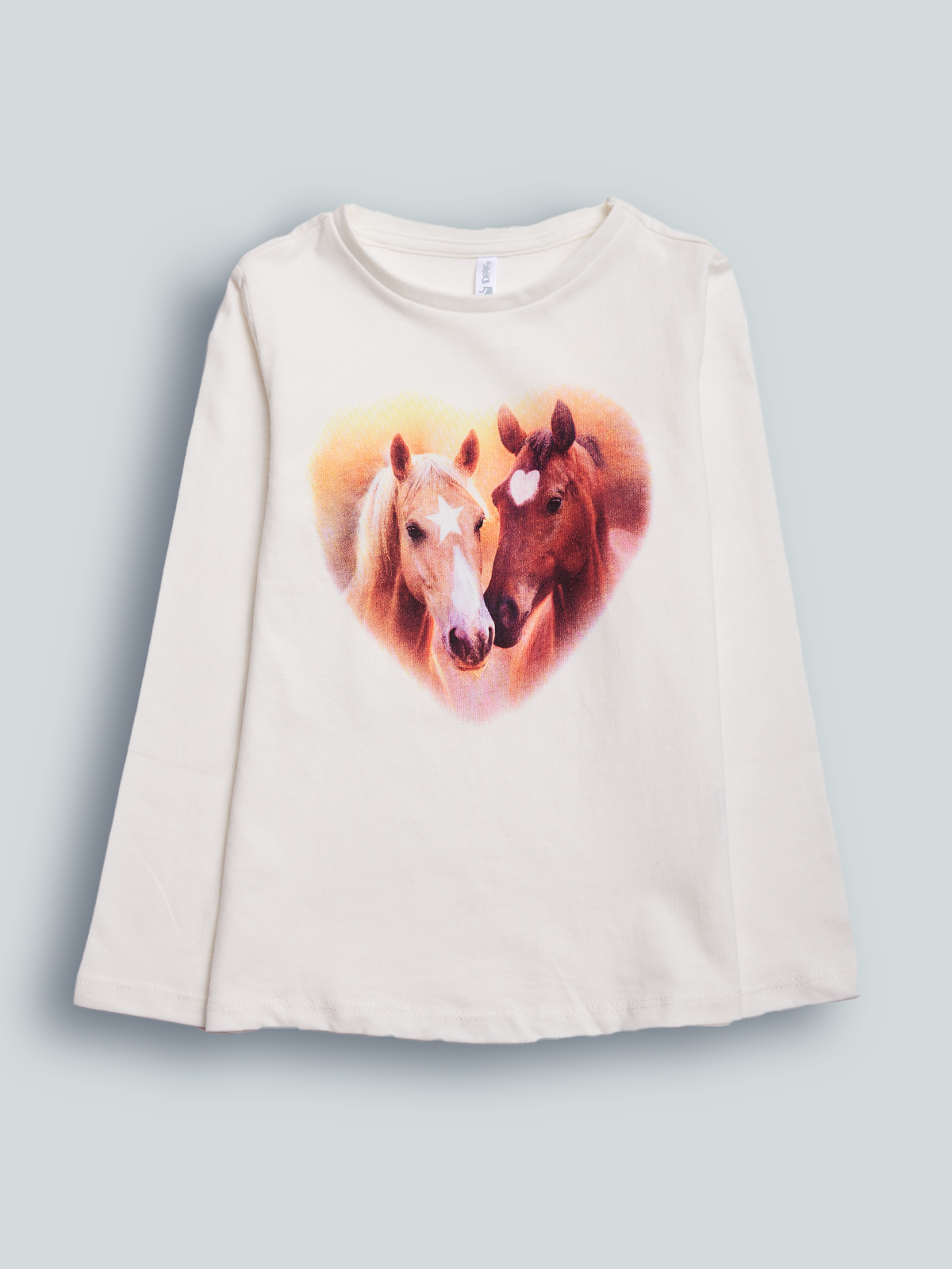 Tshirt manica lunga in morbido e caldo cotone, stampa cavalli fotografici sul davanti. Un capo romantico e grazioso.