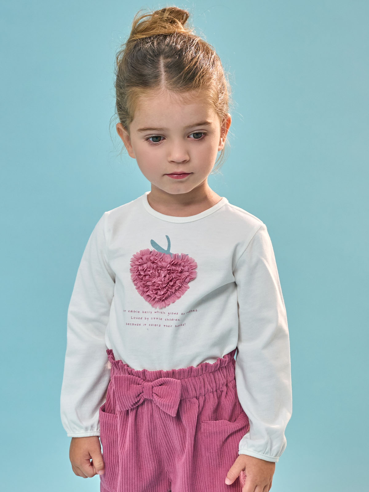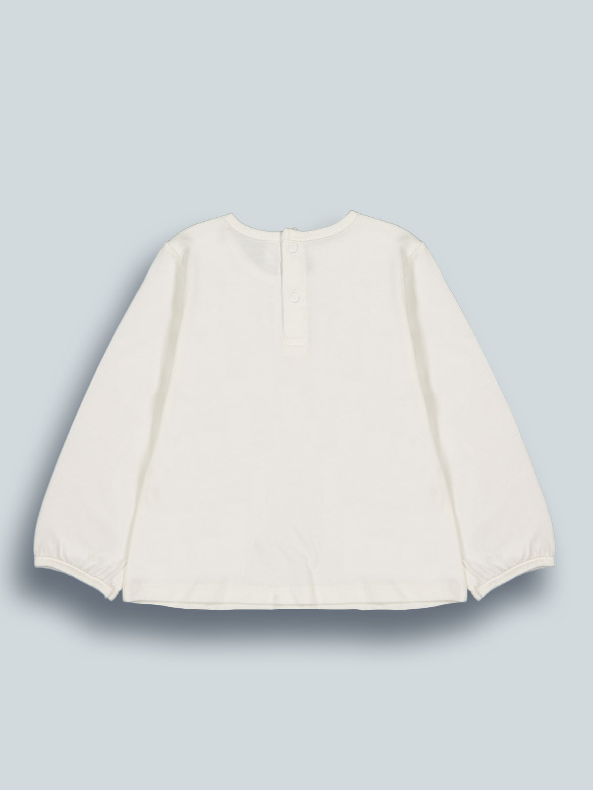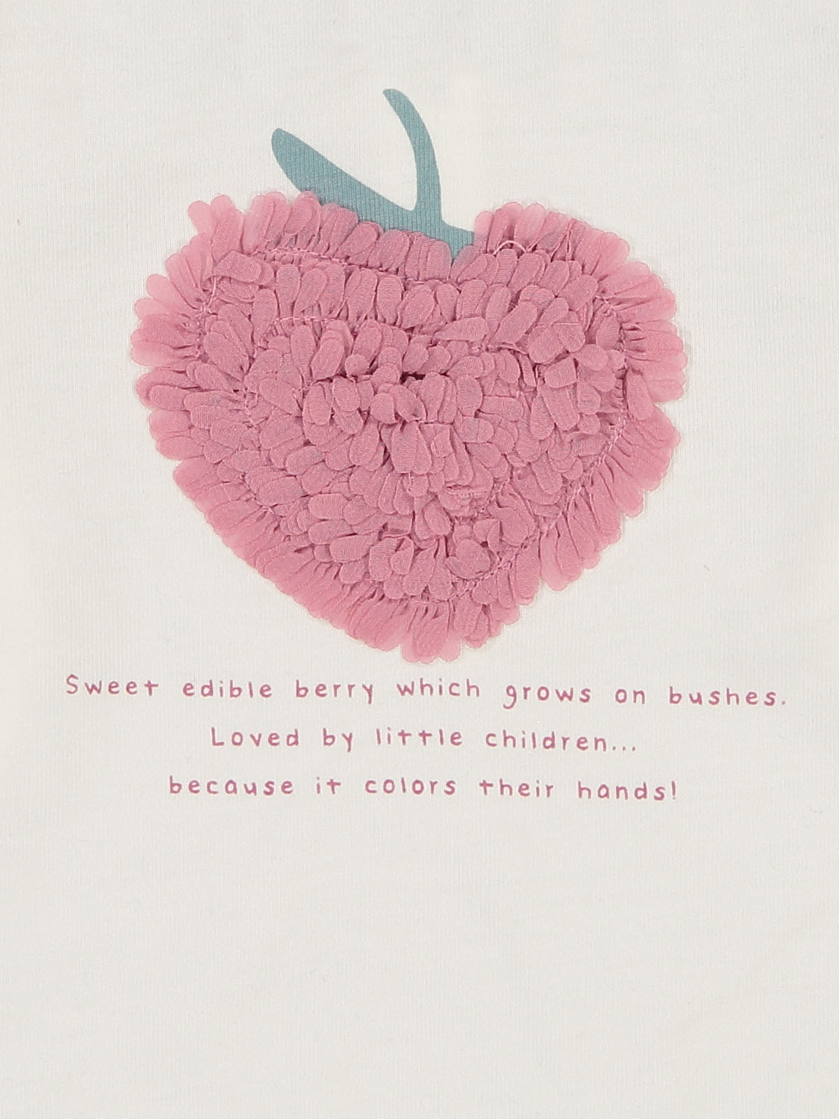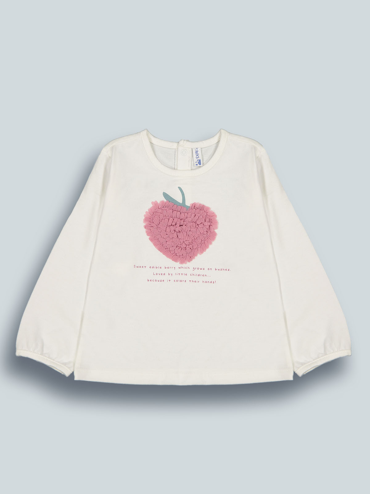 Tshirt in caldo cotone manica lunga con pratica apertura sul dietro grazie ai bottonicini a pressione. Tenera stampa mora con scritta e fettuccia in voile arricciata in applicazione. Un capo versatile e di facile abbinamento. Un vero must have.