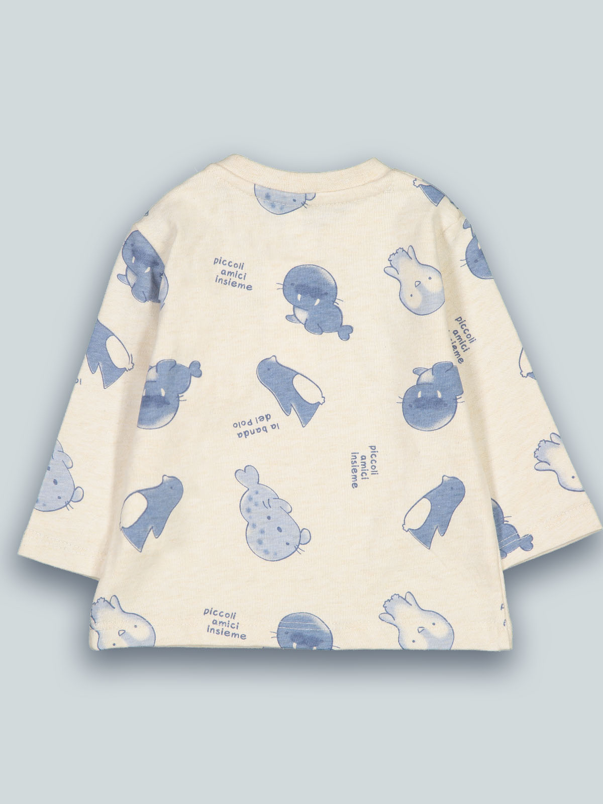 Tshirt in caldo cotone stampato su base beige melange, apertura su spalla con pratici bottoncini a pressione. Tasca su petto con simpatica stampa e ali 3D. Un capo pratico e confortevole per il tempo libero.