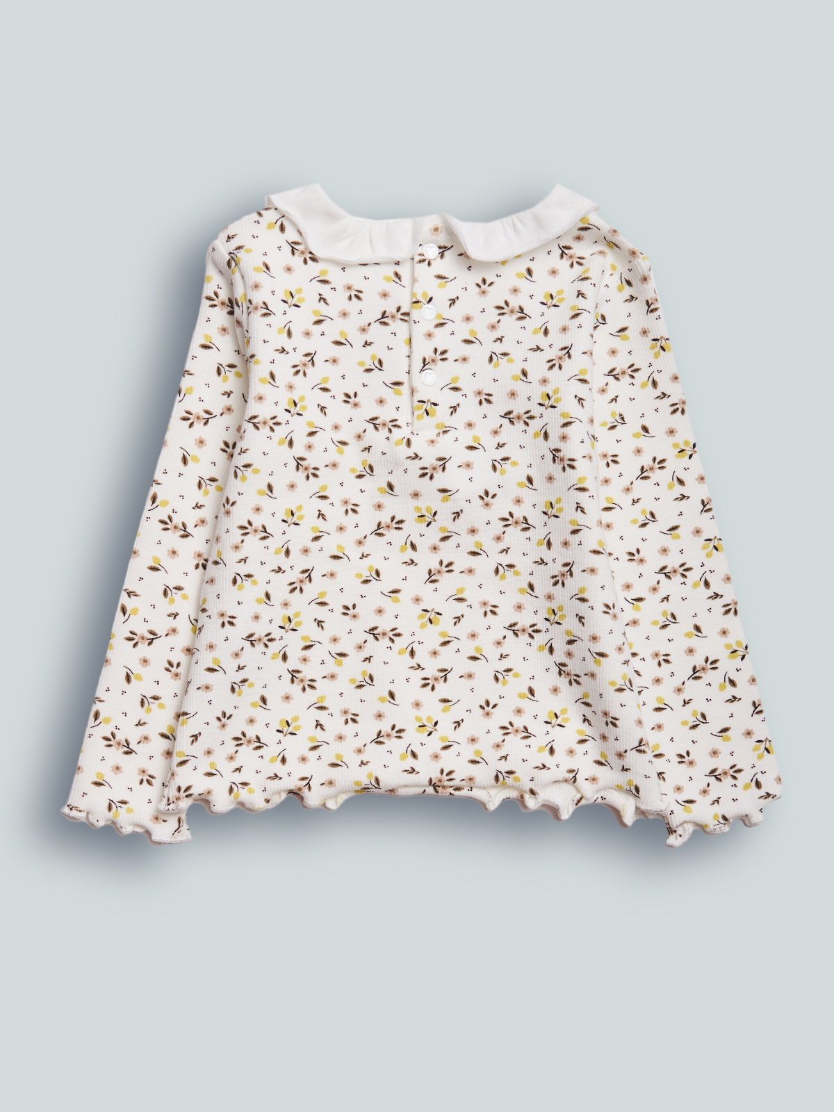 Tshirt in morbida e calda costina manica lunga fantasia fiori. Colletto in cotone tinta unita. Pratica da indossare grazie all’apertura sul dietro con bottoncii. Un capo con dettaglia chic e di facile abbinamento.