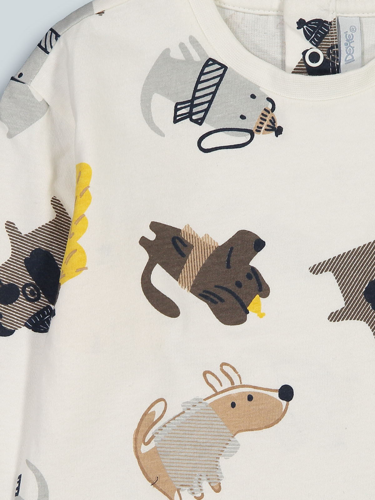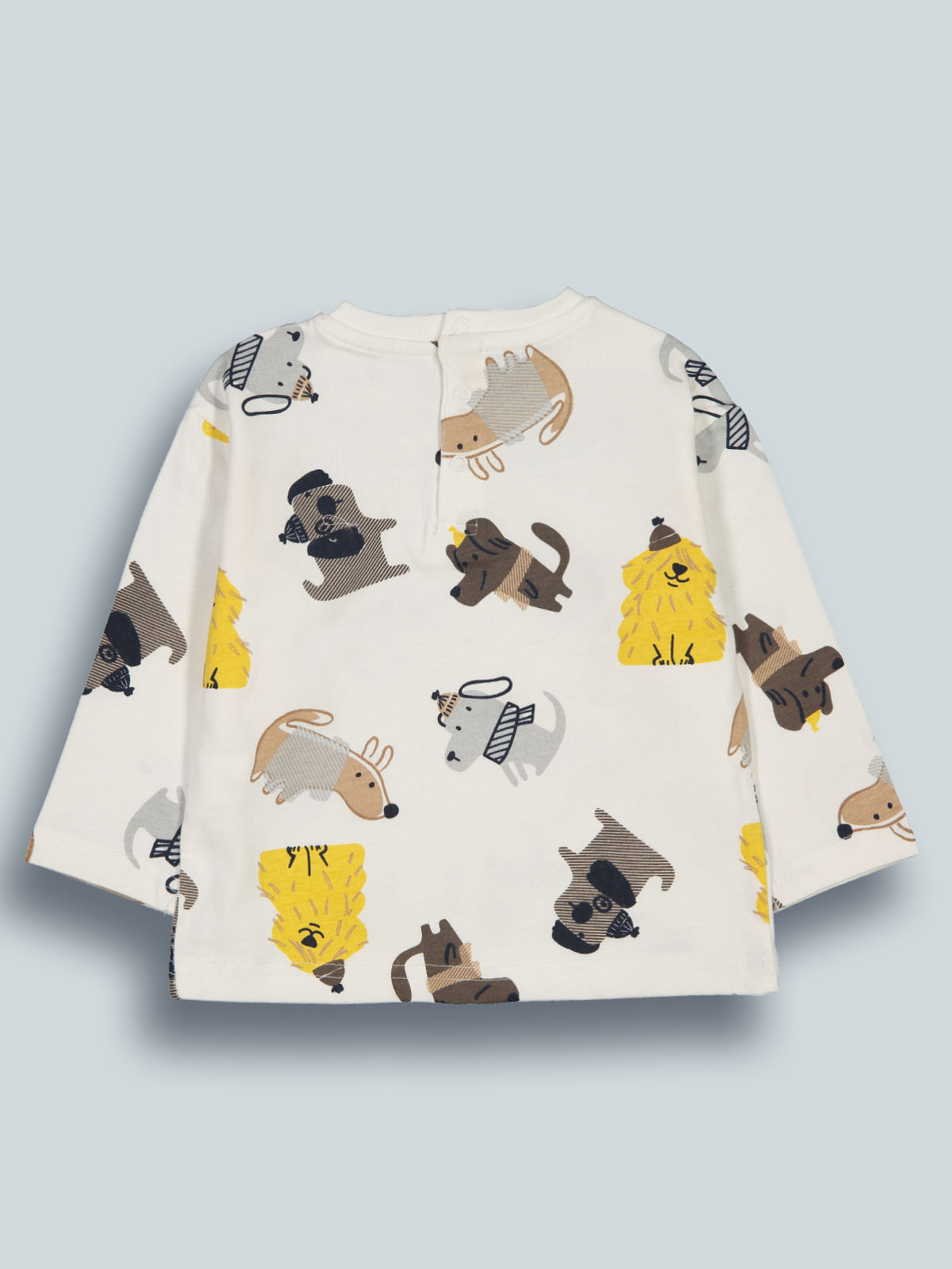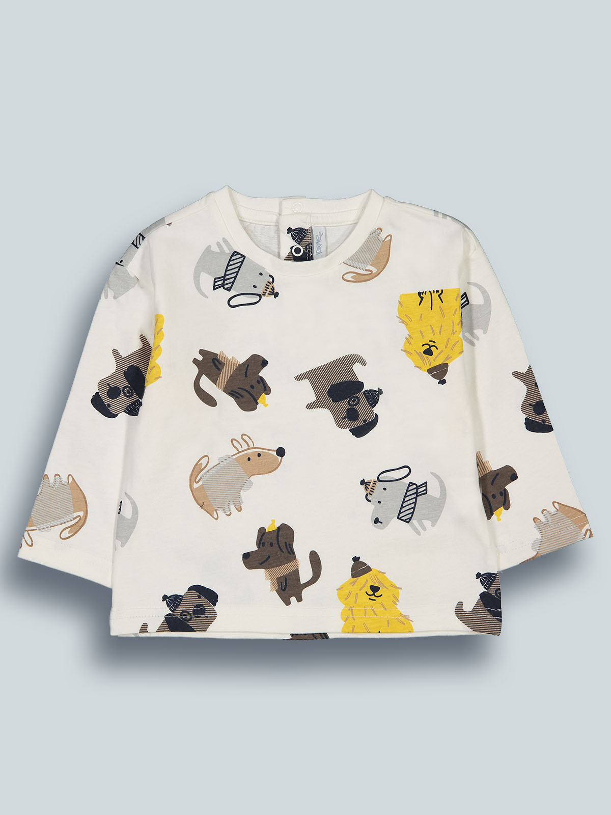 Tshirt manica lunga girocollo in caldo cotone fantasia, pratica apertura con bottoncini a pressione sul retro. Una tshirt allegra in una fantasia che piacerà molto al vostro bambino.