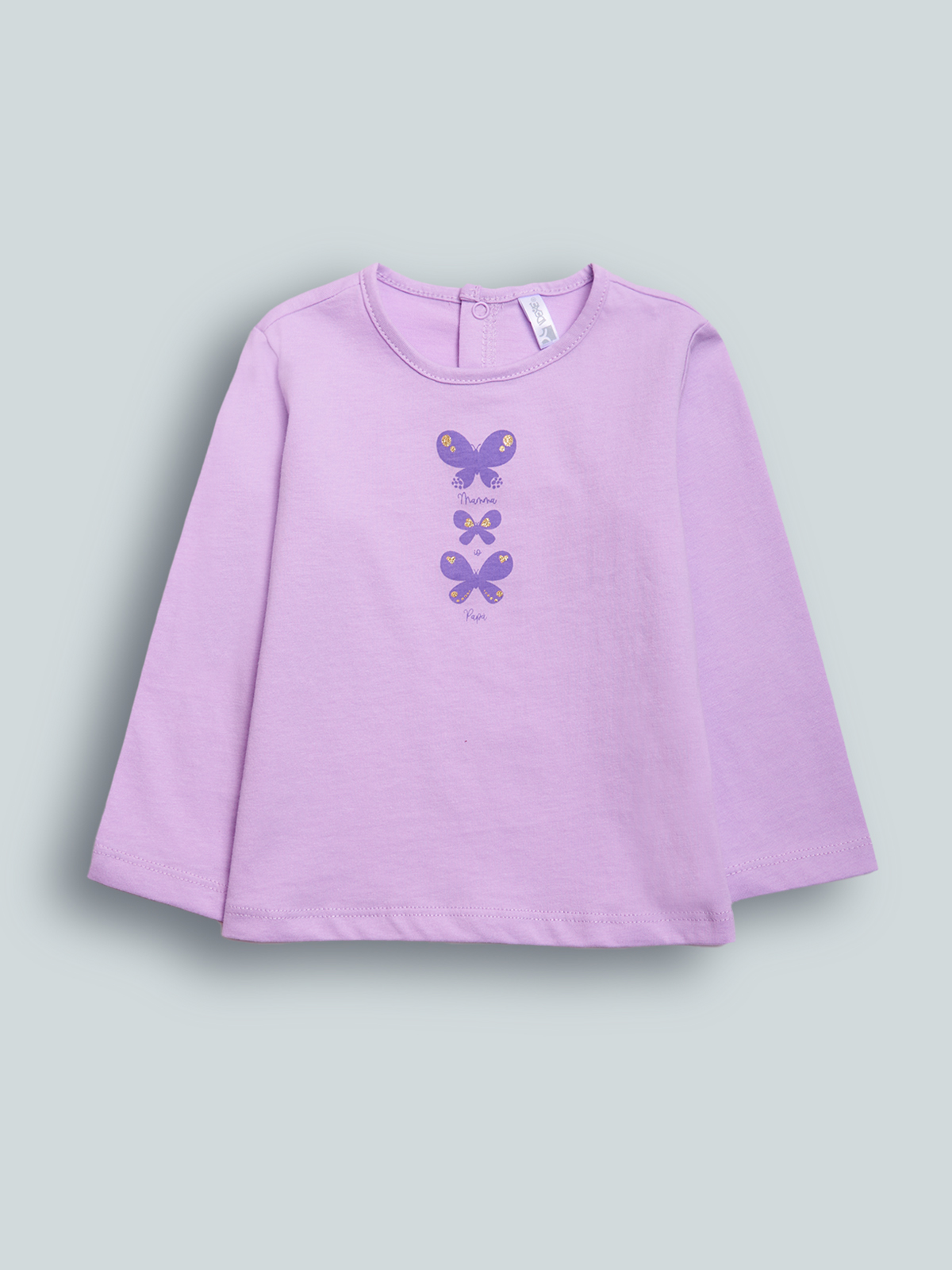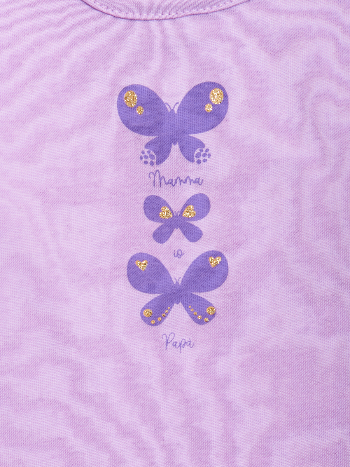Tshirt in cotone Manica lunga con pratica apertura sul dietro grazie ai bottoncini a pressione. Tenera stampa farfalle con glitter per impreziosire il tutto. Una tshirt basica dal sapore romantico.