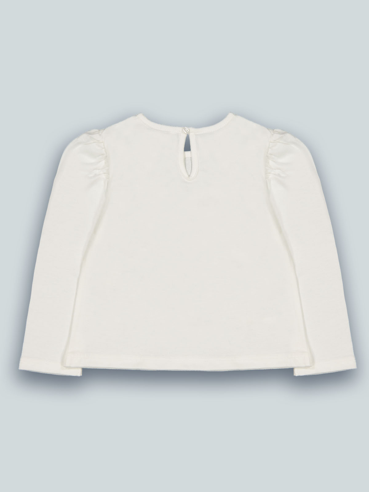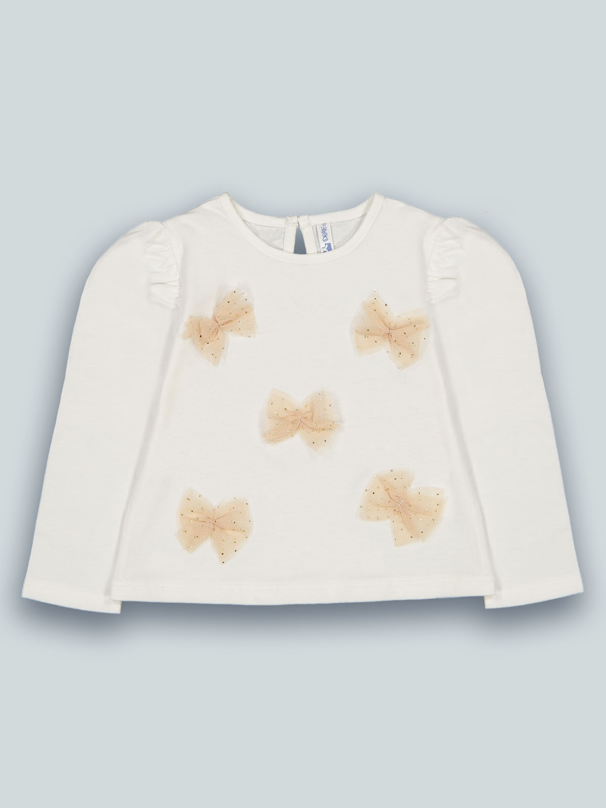 Tshirt in caldo cotone manica lunga con pratica apertura sul dietro grazie ai bottoncini. Fiocchi sul davanti in morbido tulle con pois in lamina. Manica con motivo a sbuffo per ancora più femminilità. Un capo sfizioso e di facile abbinamento.