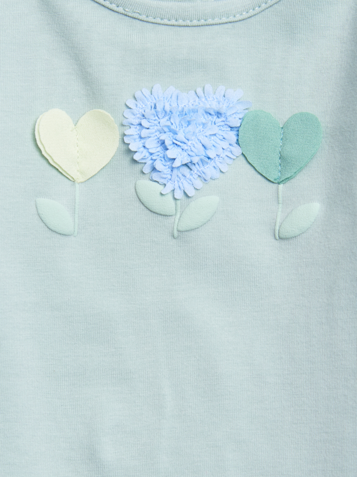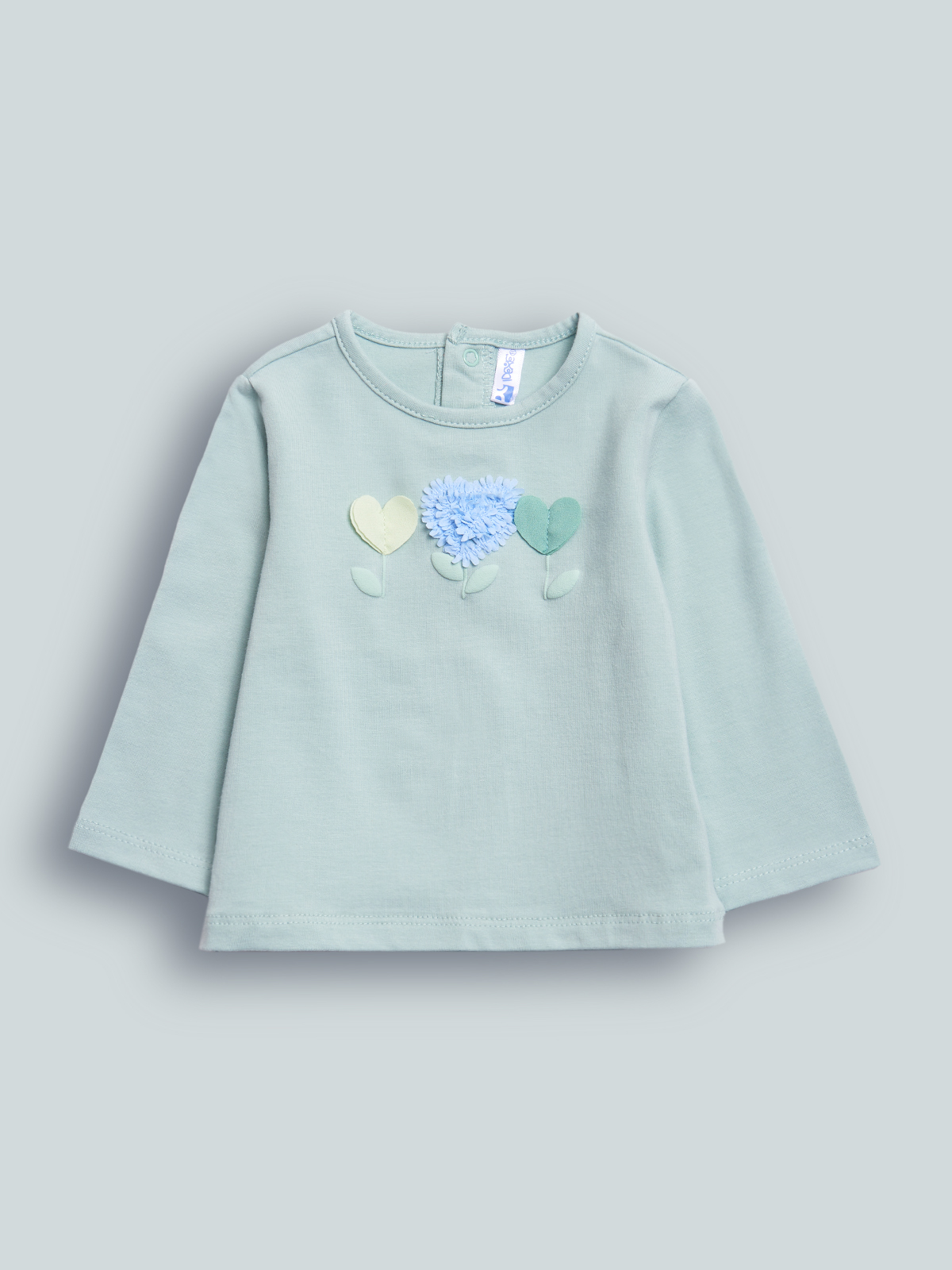 Tshirt girocollo a Manica lunga in cotone elasticizzato. Pratica apertura con bottoncini a pressione sul dietro, stampa arricchita da applicazione in fettuccia effetto petali. Confortevole e divertente.