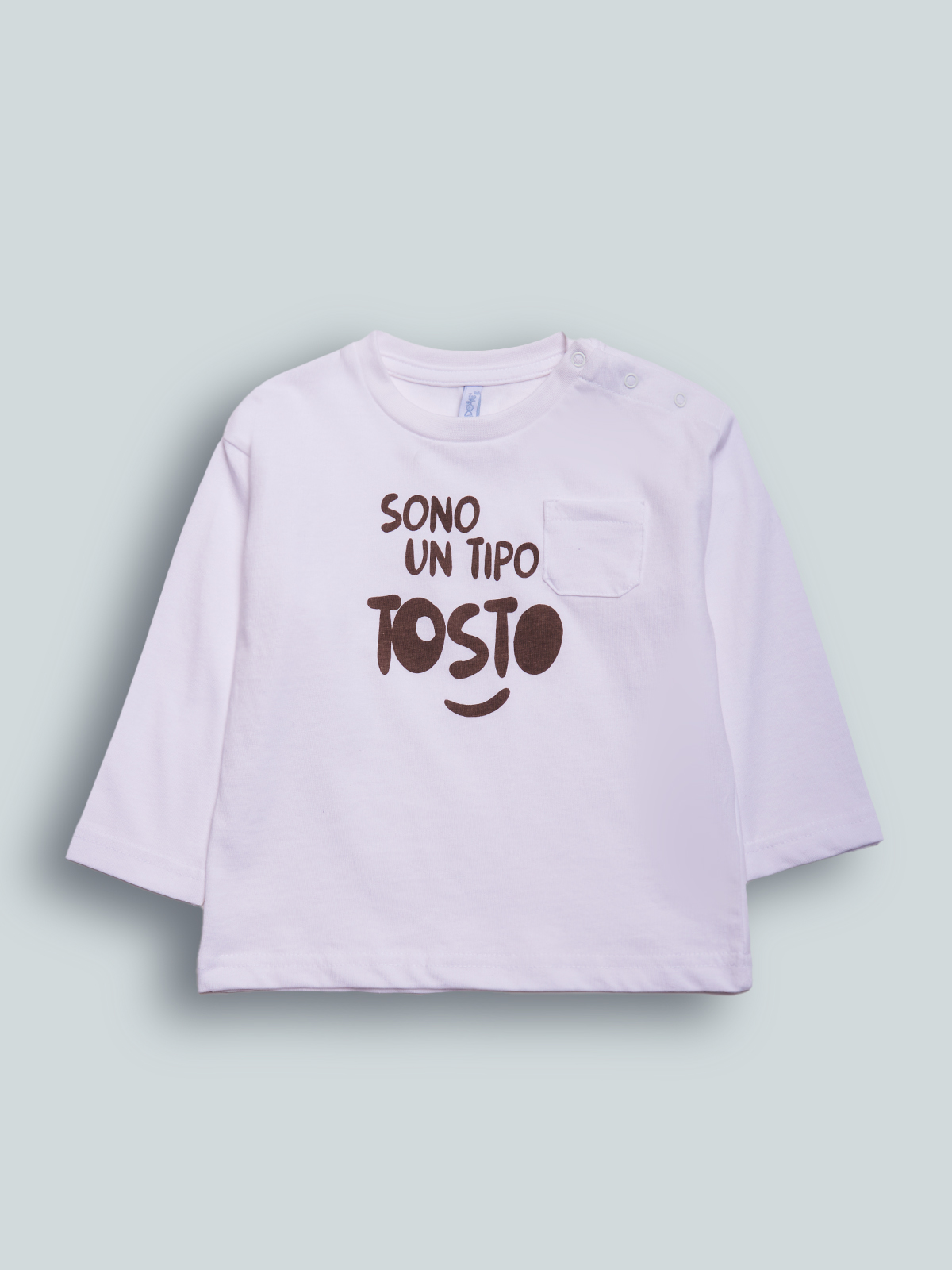 Tshirt Manica lunga girocollo in cotone, pratica apertura con bottoncini a pressione su spalla. Taschino e scritta “humor” stampata sul davanti. La tshirt ideale per la vostra incorreggibile peste!