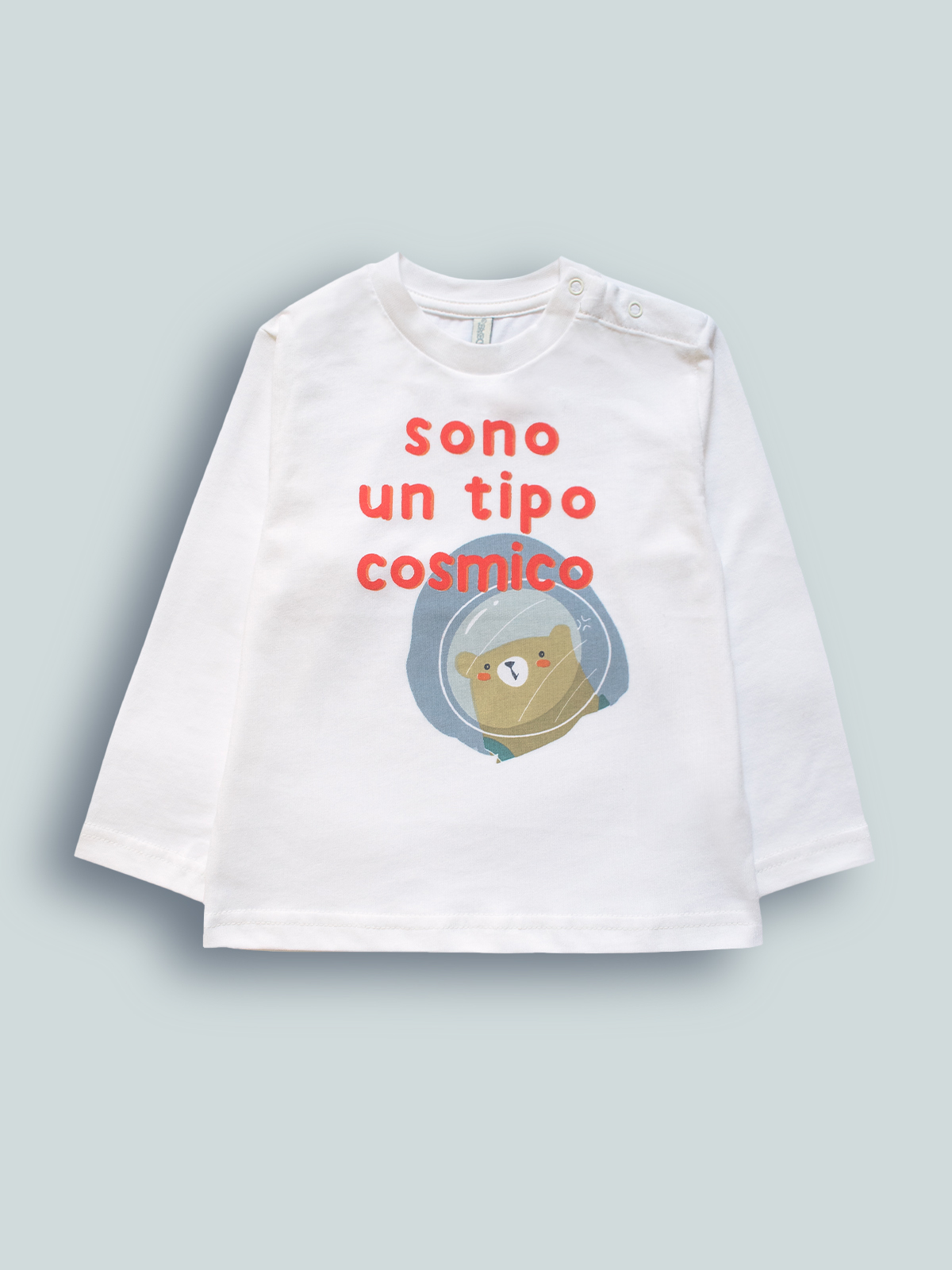 Tshirt Manica lunga girocollo in cotone, pratica apertura con bottoncini a pressione su spalla. Stampa humor sul davanti. Una tshirt basica e confortevole, da indossare tutti i giorni.