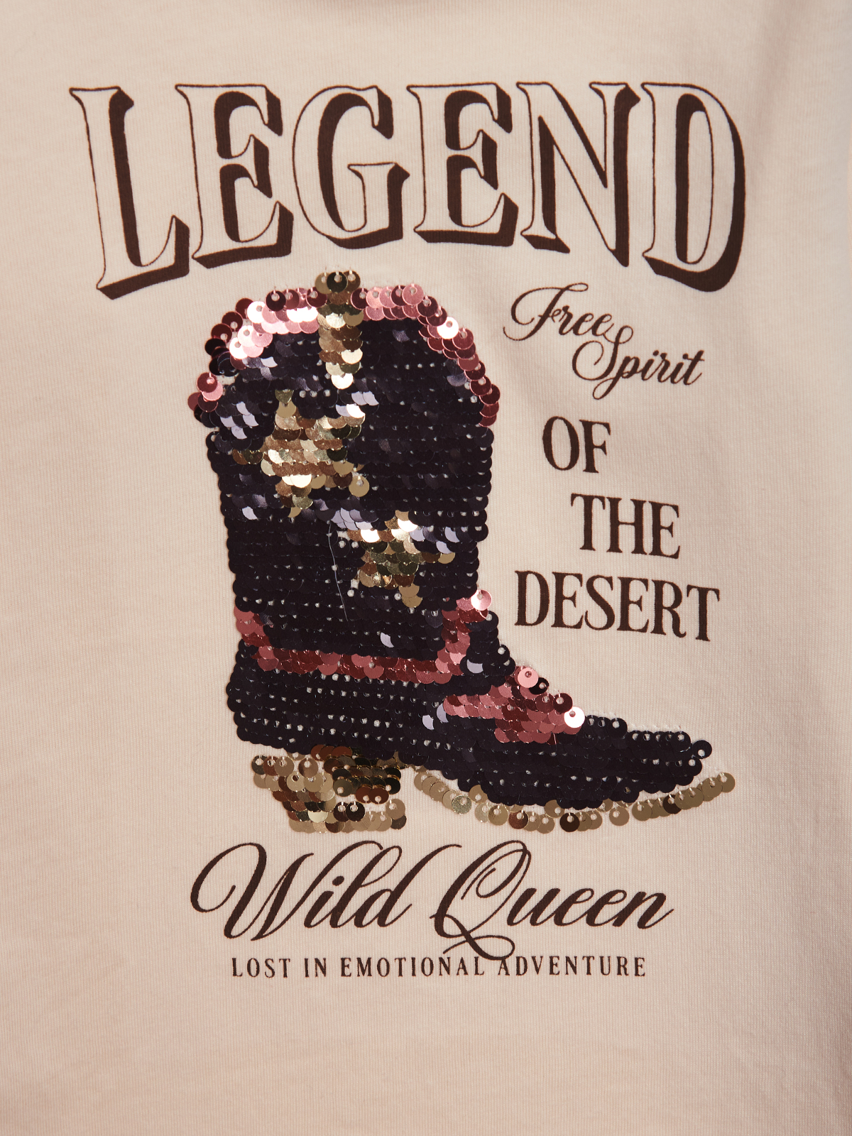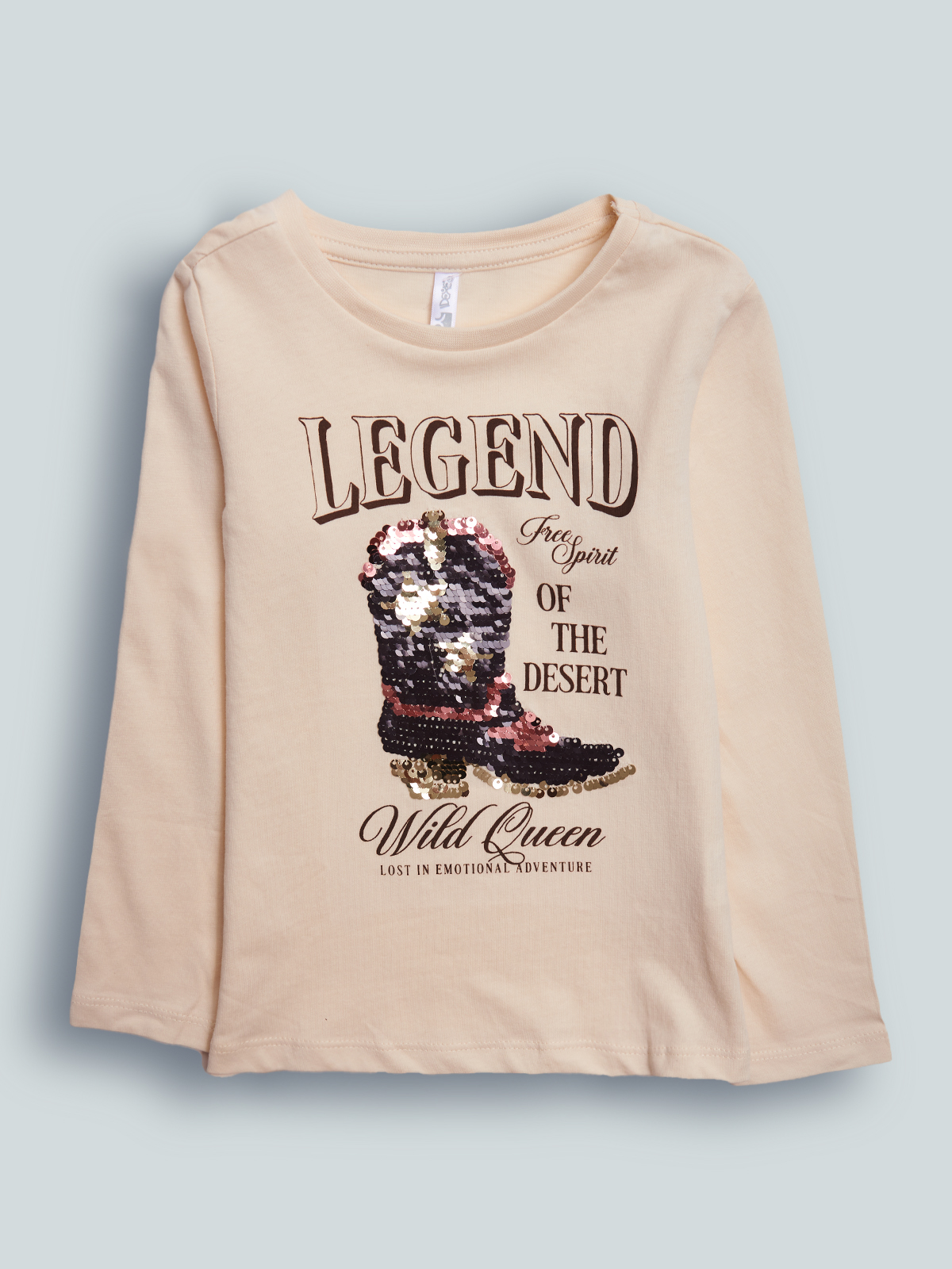 Tshirt manica lunga in mHomeorbido e caldo cotone. Simpatica scritta con stivale in paillettes reversibile. Una delle nostre famose tshirt interattive per far divertire la vostra bambina.
