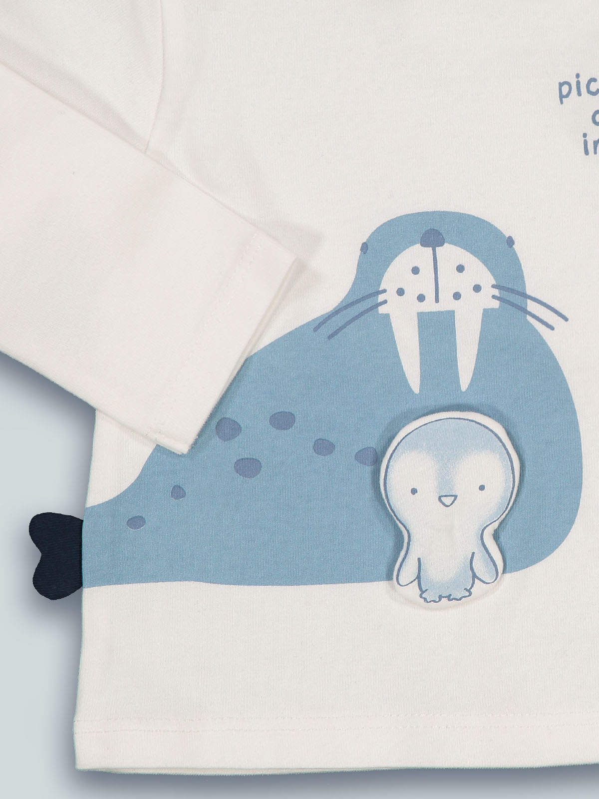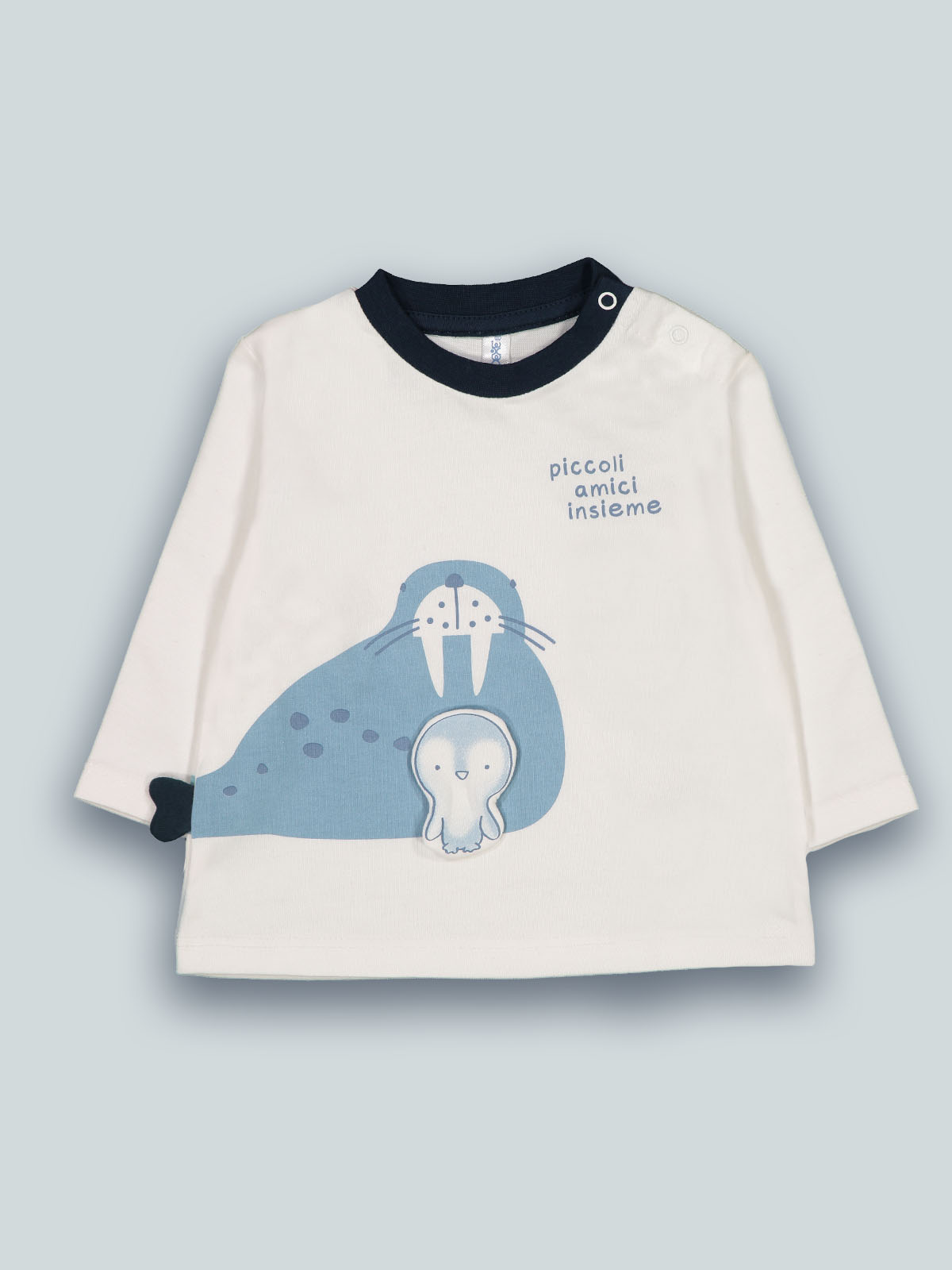 Tshirt manica lunga in caldo cotone. Comoda apertura su spalla per facilitare l’indosso. Simpatica stampa sulla parte anteriore con codina 3D e piccolo pinguino su toppa imbottita. Un capo versatile che può essere abbinato facilmente con il resto della collezione.