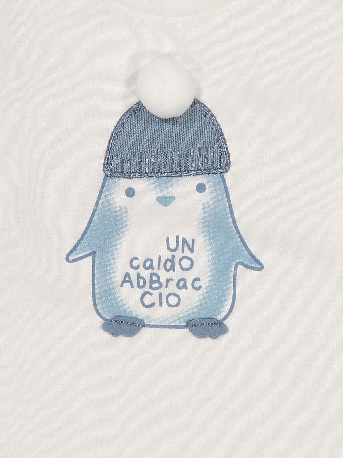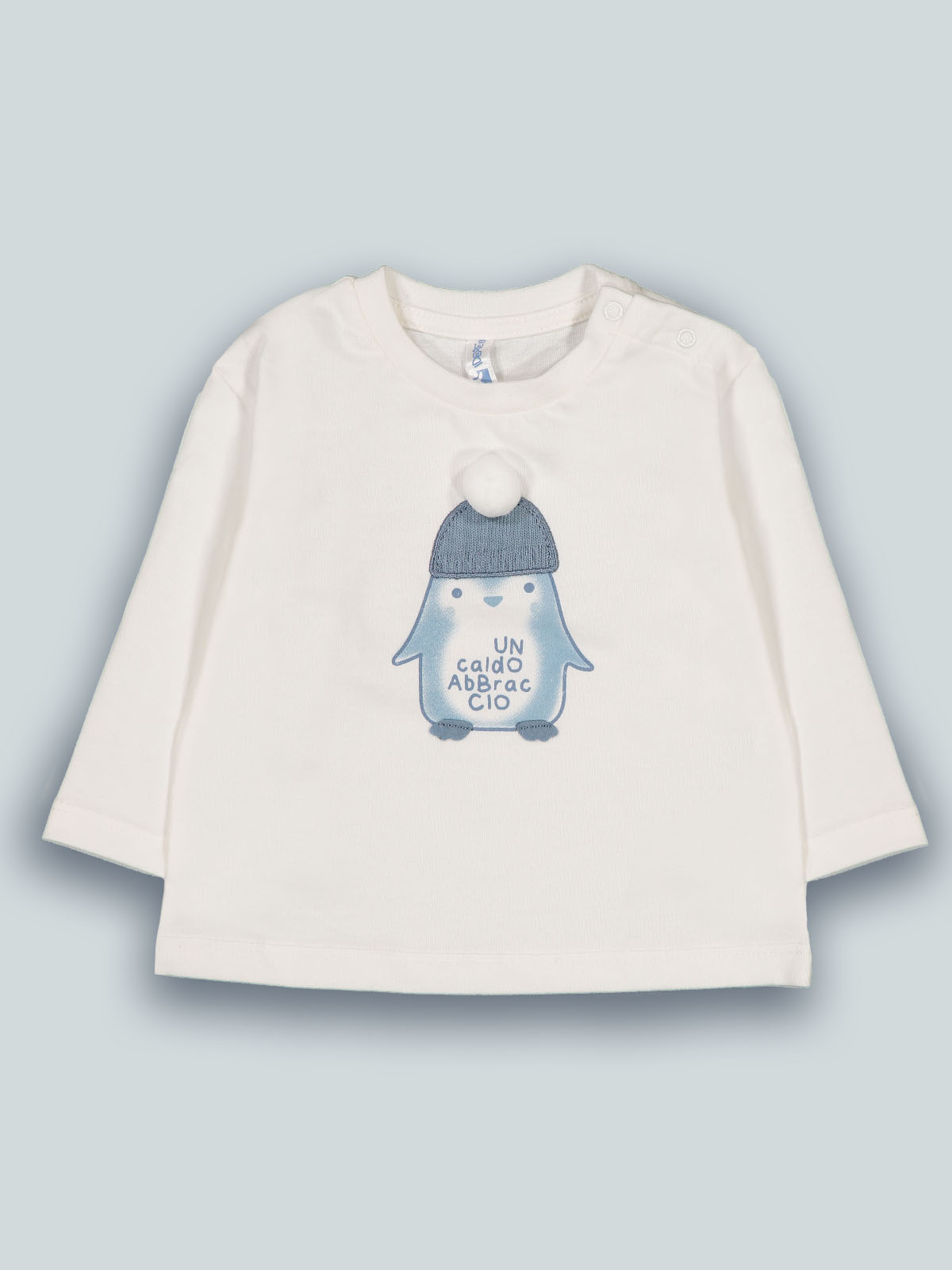 Tshirt manica lunga in caldo cotone. Comoda apertura su spalla per facilitare l’indosso. Simpatico piguino stampato e ricamato sulla parte anteriore. Un capo versatile che può essere abbinato facilmente con il resto della collezione.
