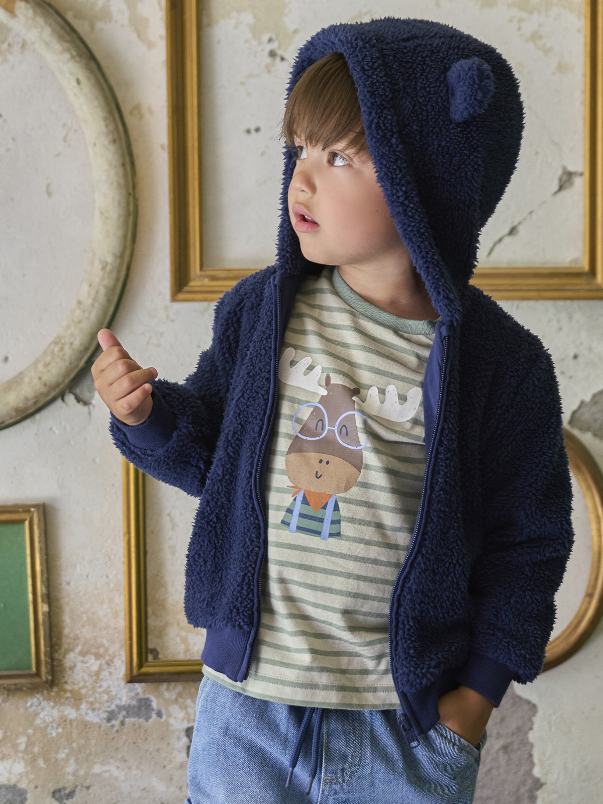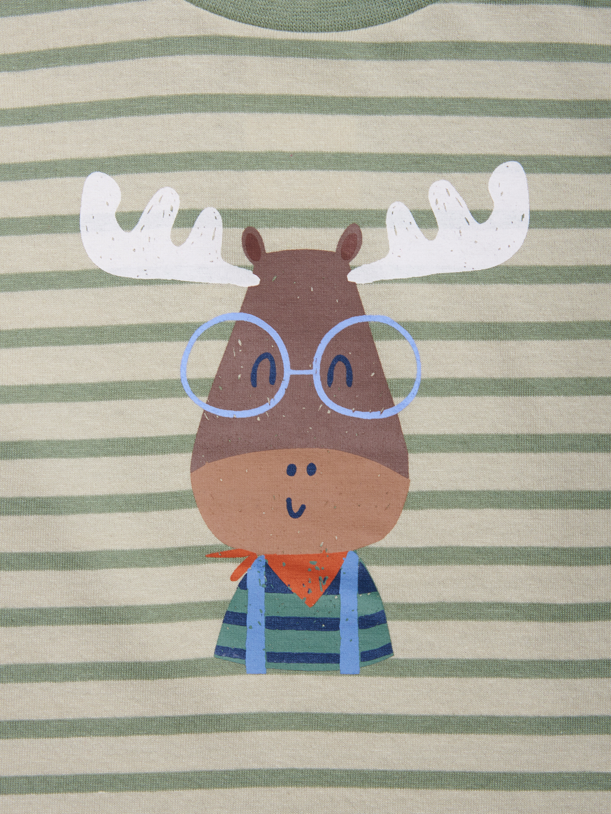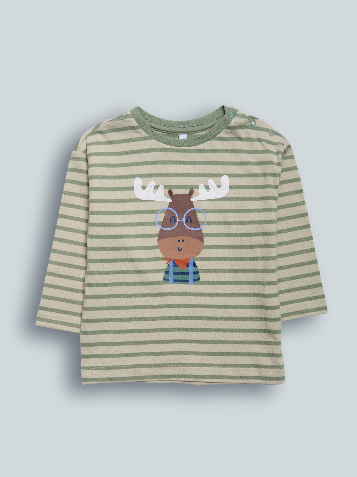 Tshirt Manica lunga girocollo in cotone rigato, pratica apertura con bottoncini a pressione su spalla. Simpatica alce stampata sul davanti. Una tshirt pratica e facile da abbinare ad un jeans o ad un comodo pantalone in felpa.