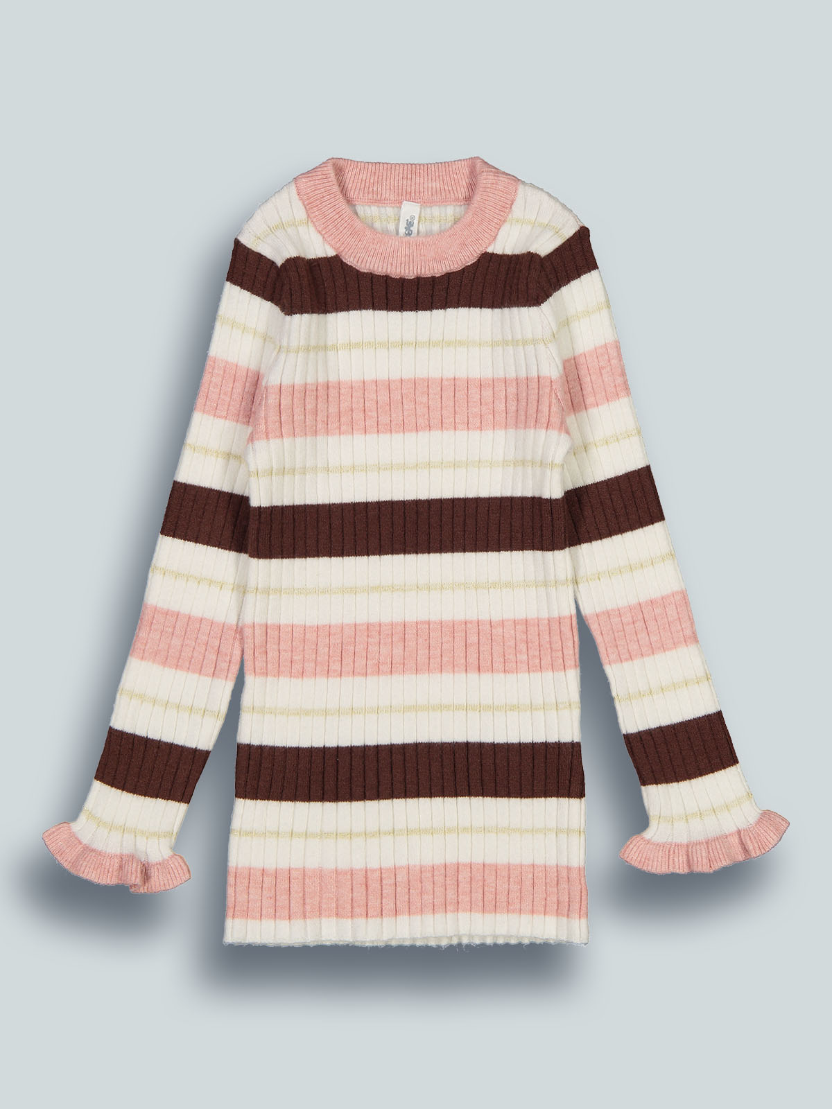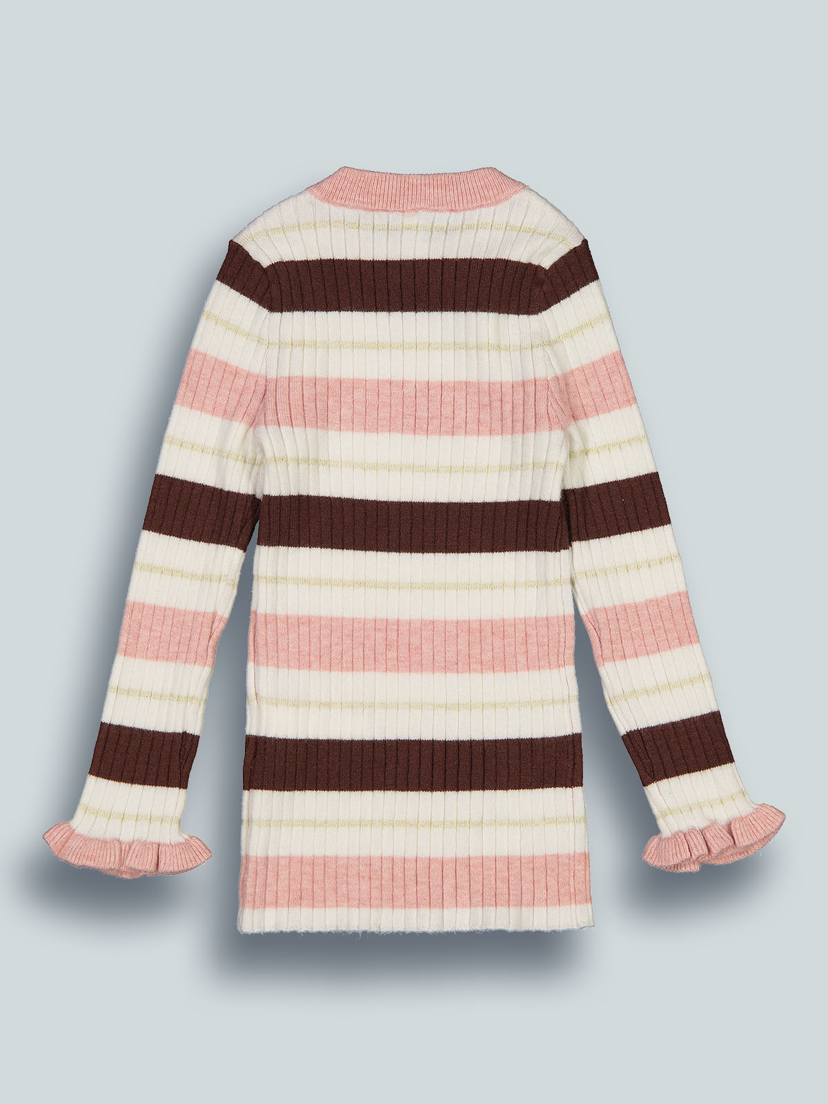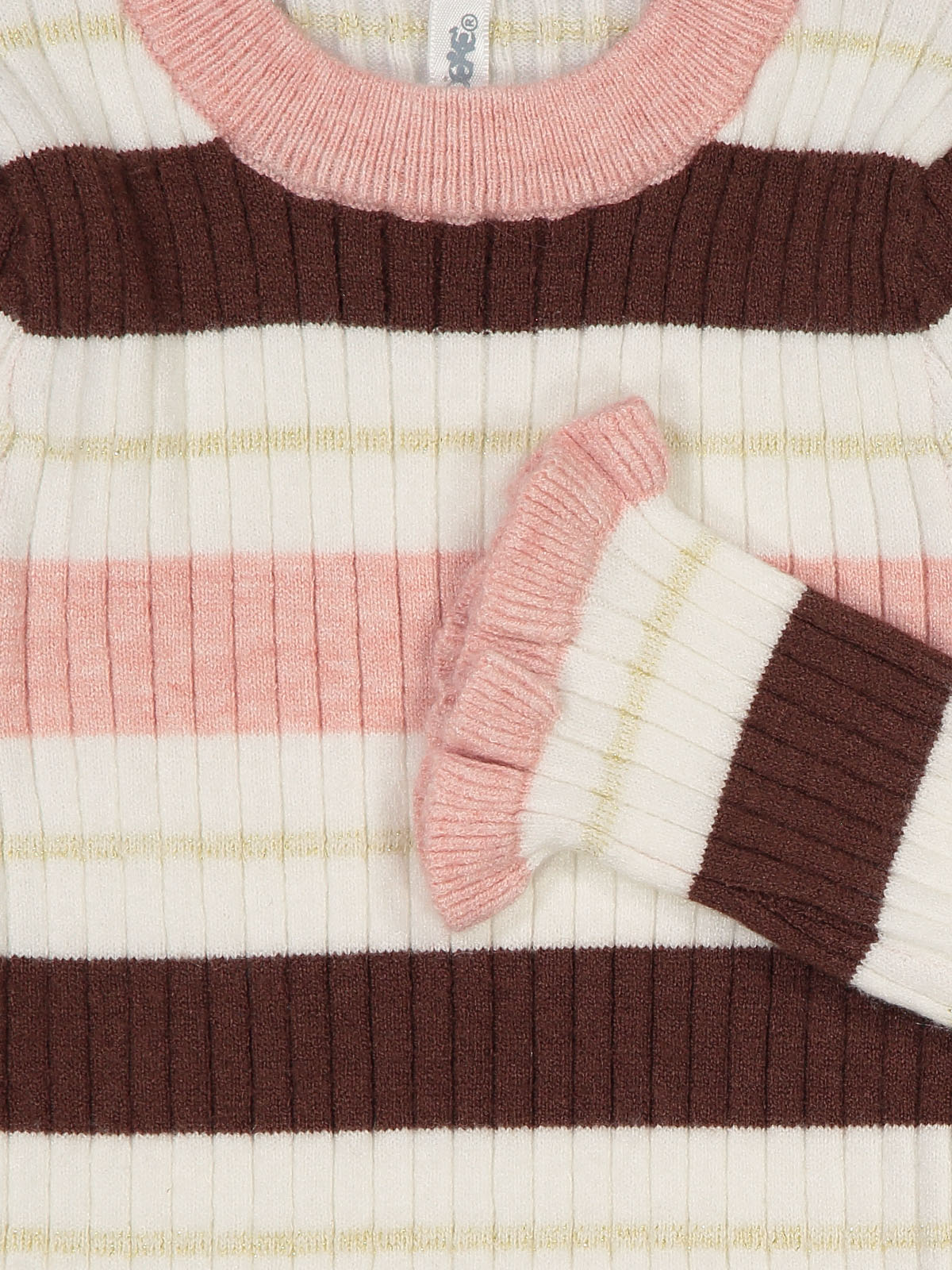 Tshirt manica lunga in morbida maglia rigata effetto costina. Rouches al fondo manica. Un capo delicato e grazioso.