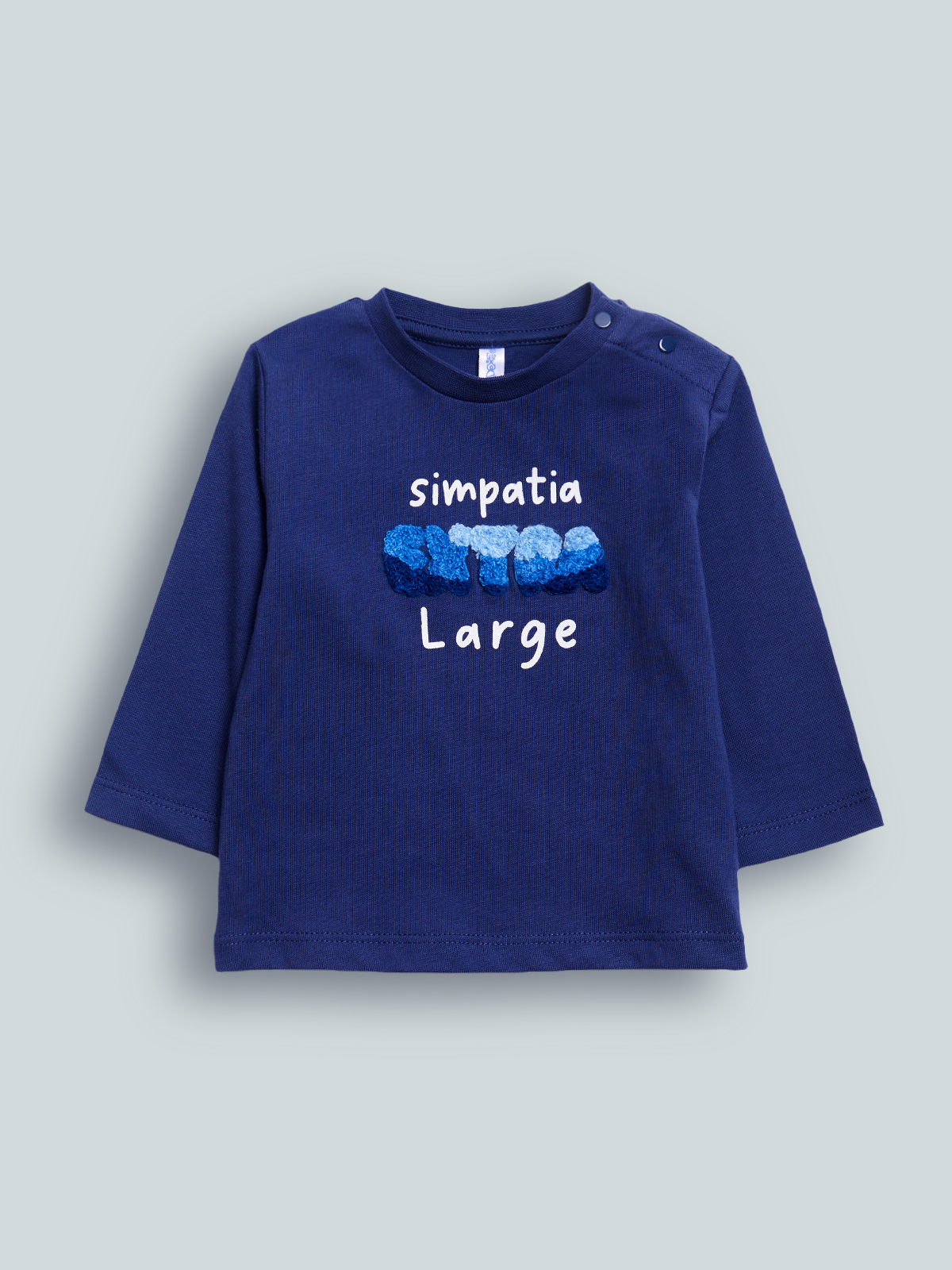 Tshirt girocollo a Manica lunga in cotone. Pratica apertura con bottoncini a pressione su spalla, spiritosa stampa humor con ricamo effetto spugna. Casual e originale, perfetta con un paio di jeans.