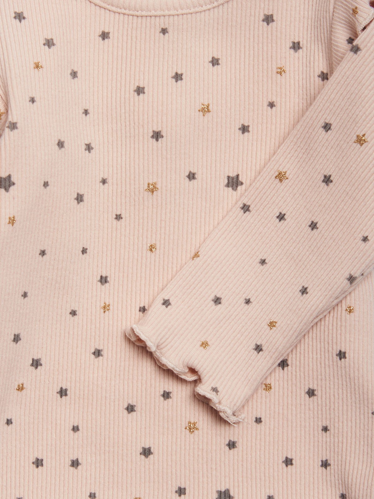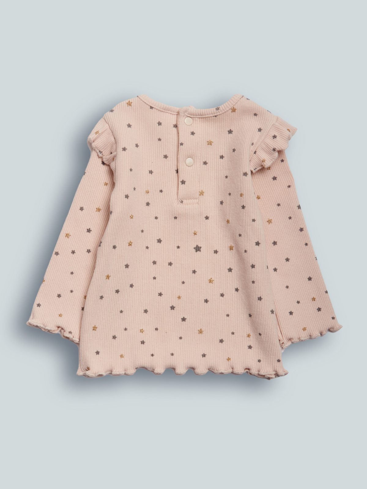 Tshirt Manica lunga in Morbida costina stampato fantasia stelle con glitter. Apertura dietro con bottoncini a pressione. Un capo “chic” che non può Mancare nell’armadio delle vostre neonate!