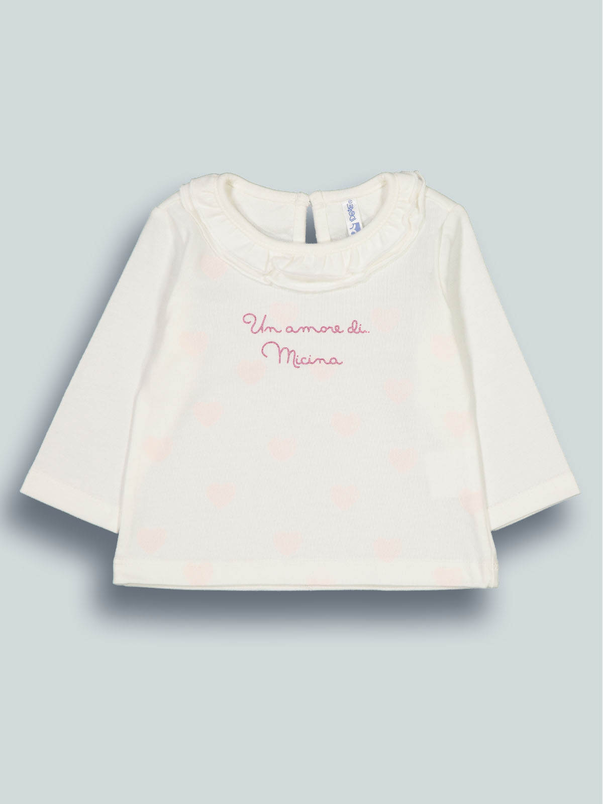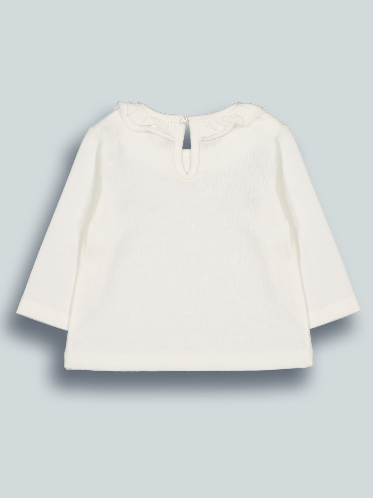 Tshirt in caldo cotone manica lunga, apertura a goccia e bottone sul dietro. Girocollo rifinito con rouches. Una tshirt con dettagli sfiziosi che non può mancare nell’armadio della vostra neonata.