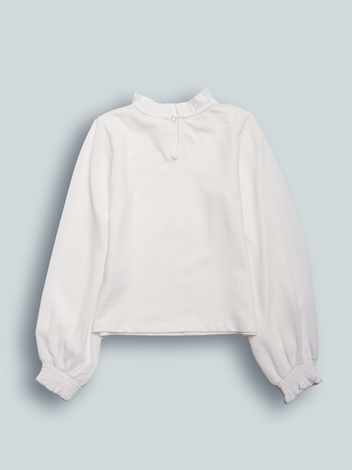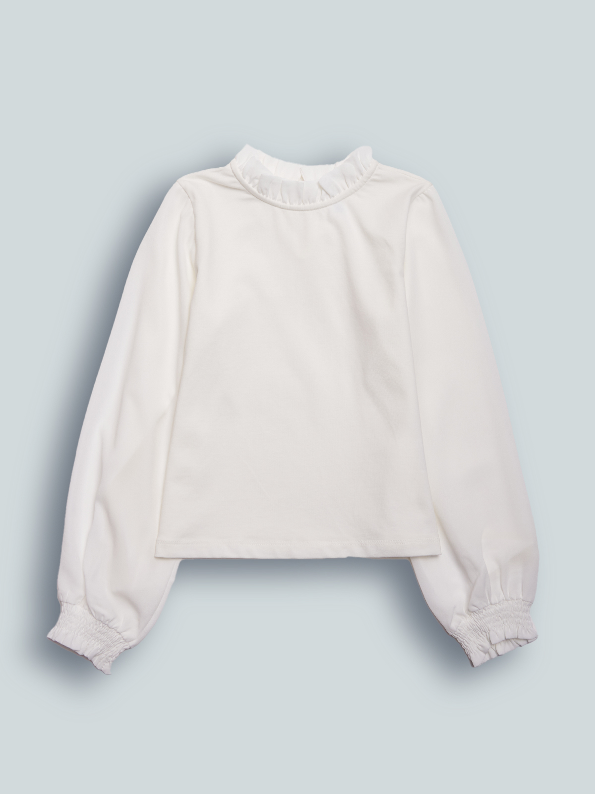 Tshirt in Morbido cotone elasticizzato con Maniche lunghe in voile con elastichino al fondo polsi, dettaglio di rouches in voile al collo e apertura sul dietro con goccia e bottone effetto Madreperla. Un capo Molto chic in un Morbido e confortevole tessuto, ideale per un’occasione speciale.