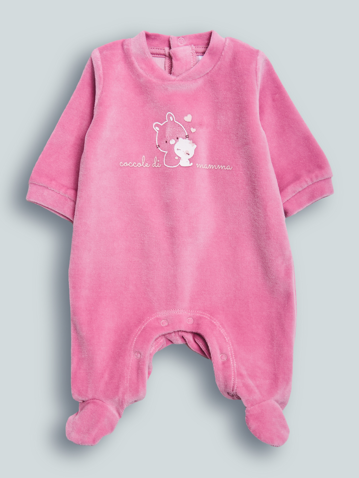 Pigiama manica lunga per neonato. Girocollo serafino. Chiusura con bottoni a pressione per agevolarne l’indosso. Soffice ciniglia per tenere al caldo il nostro neonato. Elemento decorativo: tenera stampa davanti. Questo pigiamino fa parte del corredino composto da tutti gli articoli indispensabili per il tuo neonato.