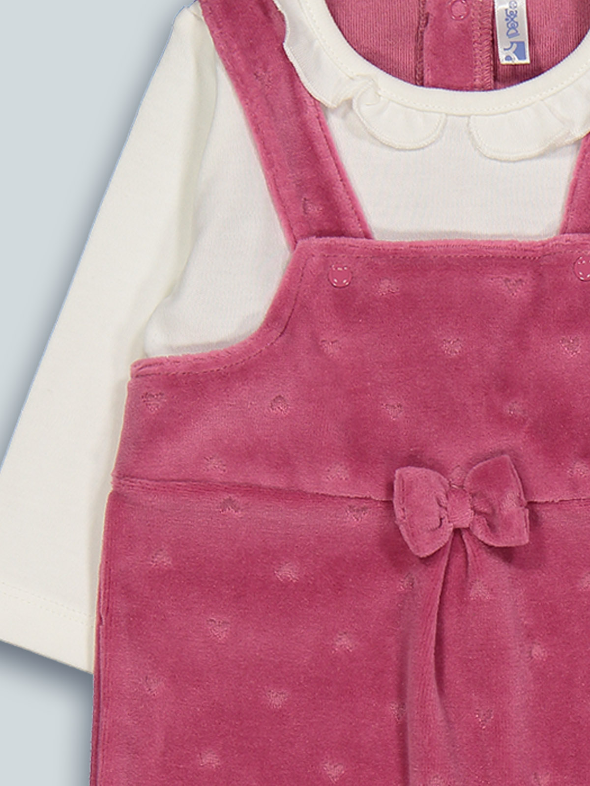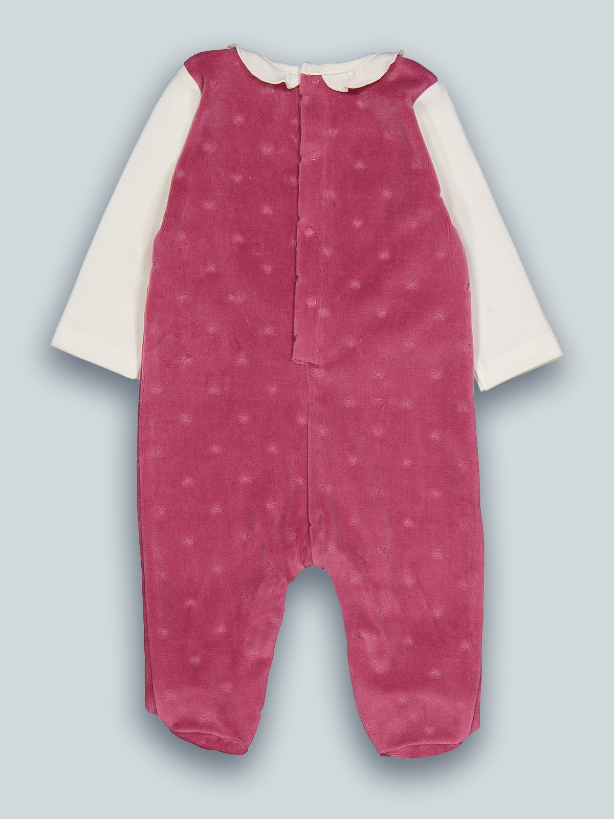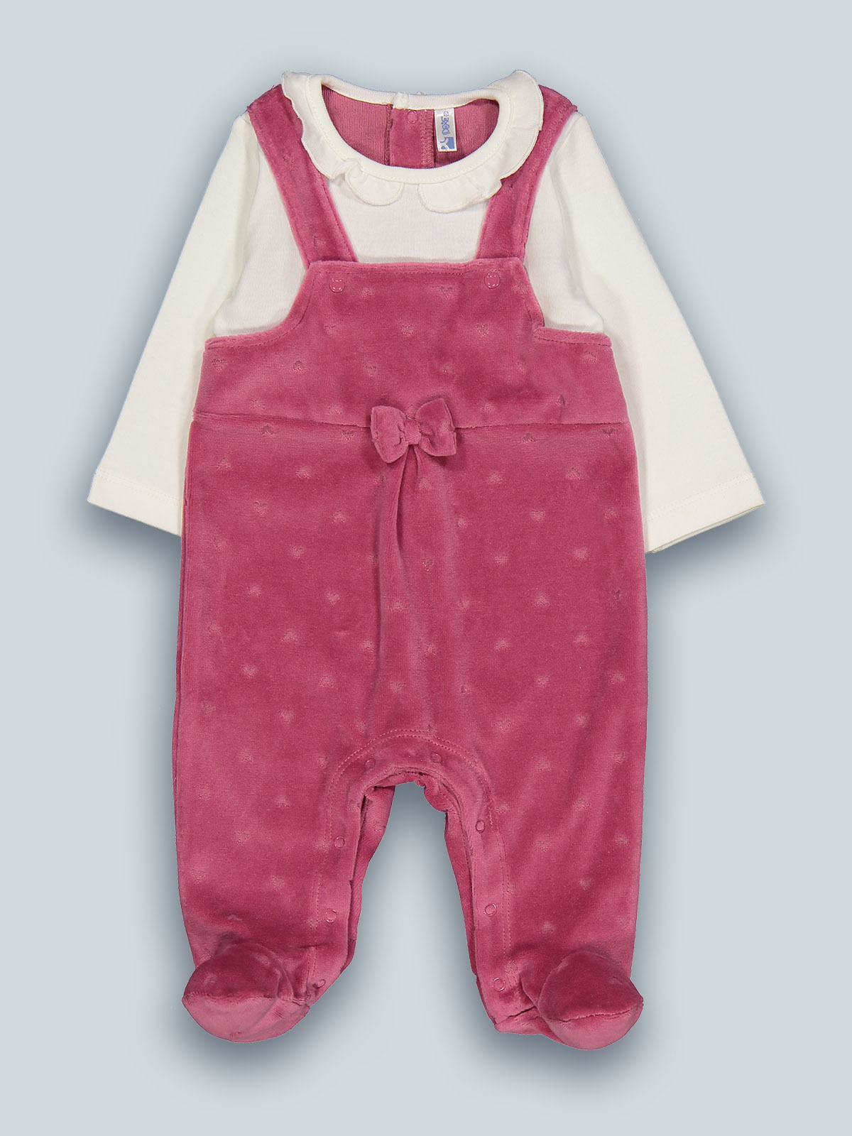 Tutina per neonata finta salopette in ciniglia incisa cuori adatta per le giornate più fredde. Collo con rouches per una maggiore femminilità. Apertura sul dietro e interno gambe con bottoni a pressione. Questo pigiamino fa parte del corredino composto da tutti gli articoli indispensabili per la tua neonata.