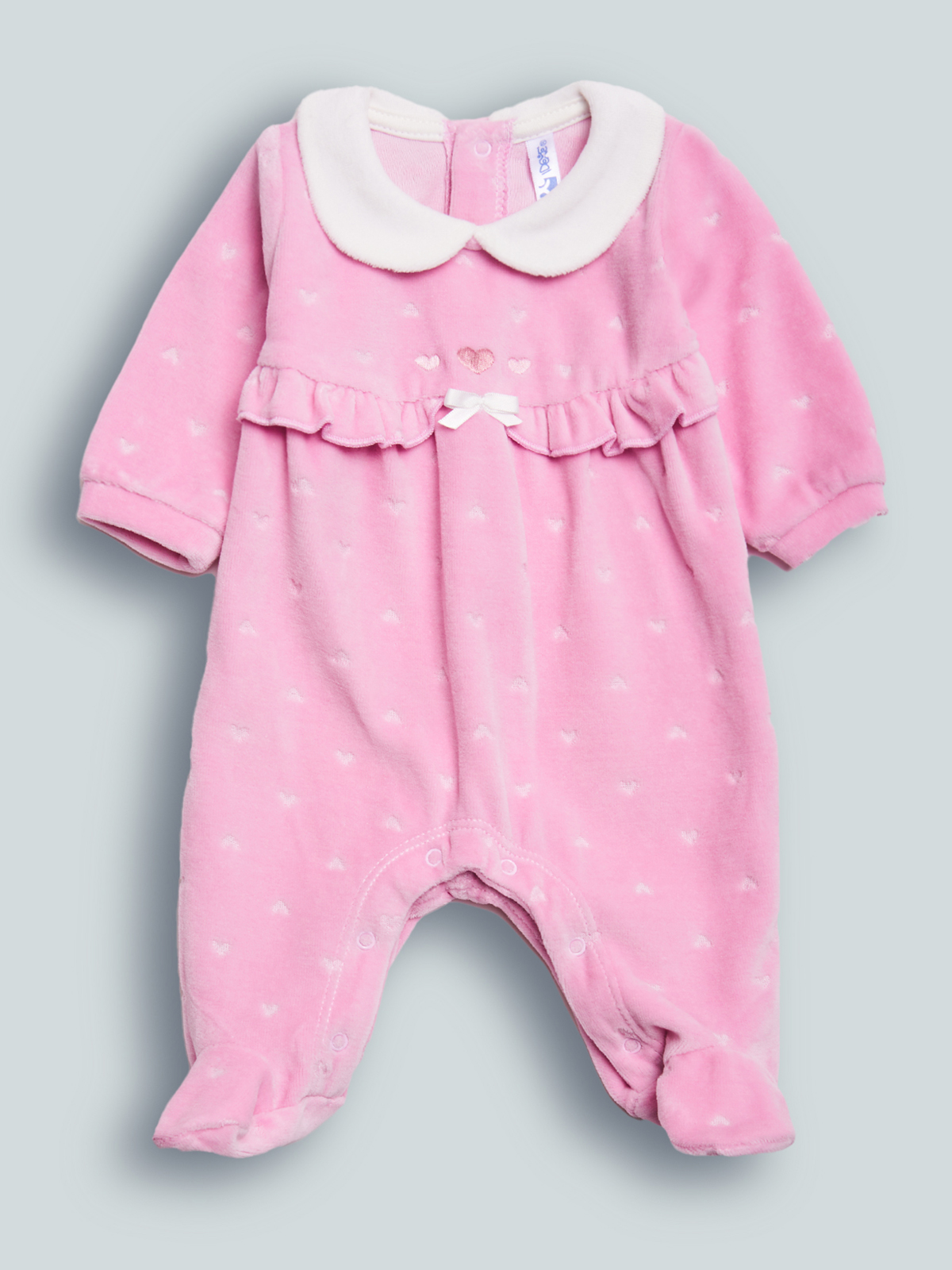 Tutina in ciniglia incisa cuori, collo rotondo, taglio con rouches e fiocco centrale. Pratica apertura sul dietro ed entrogambe con bottoni a pressione per rendere più facile l’indosso. Ideale per le grandi occasioni.
