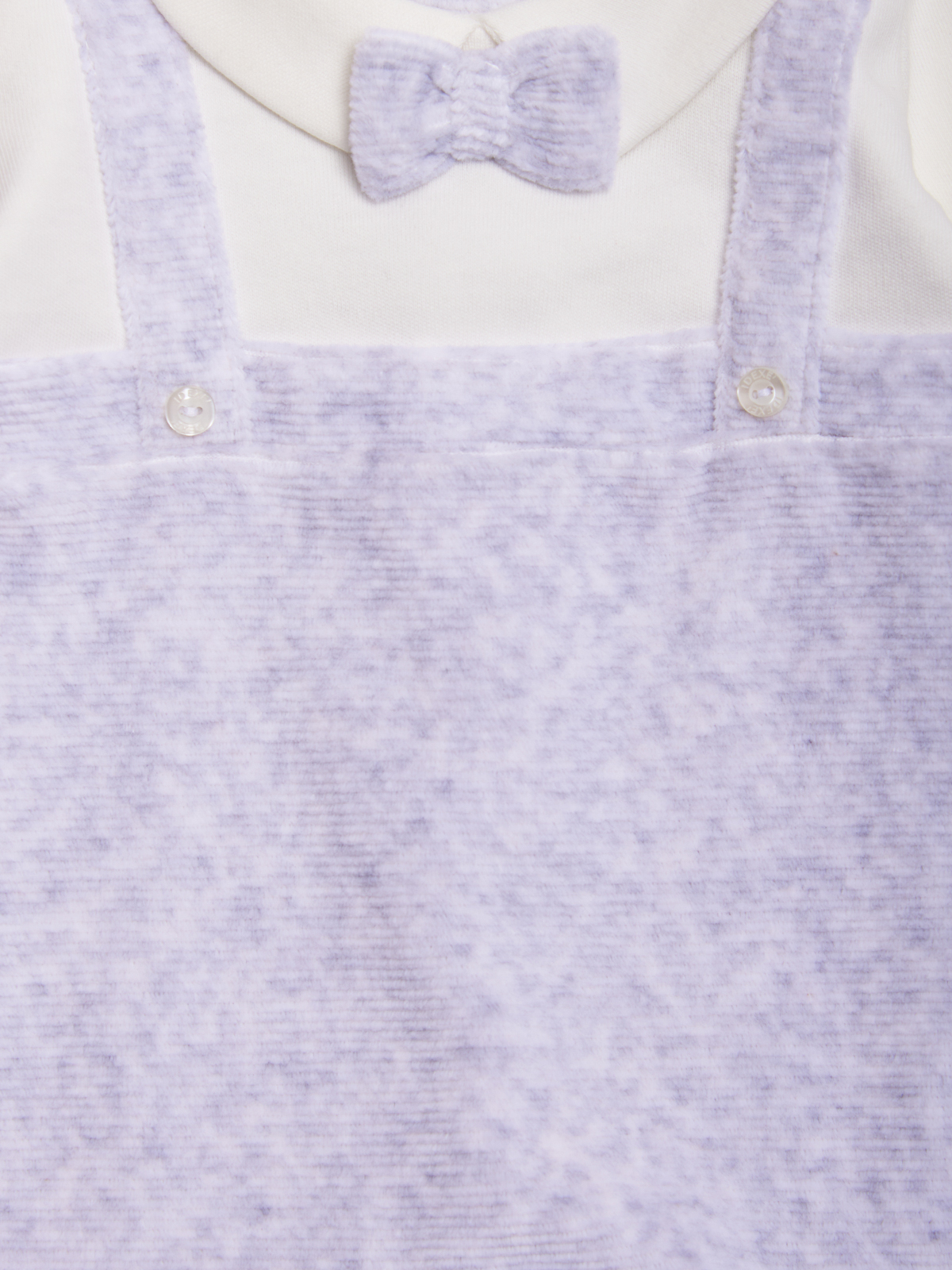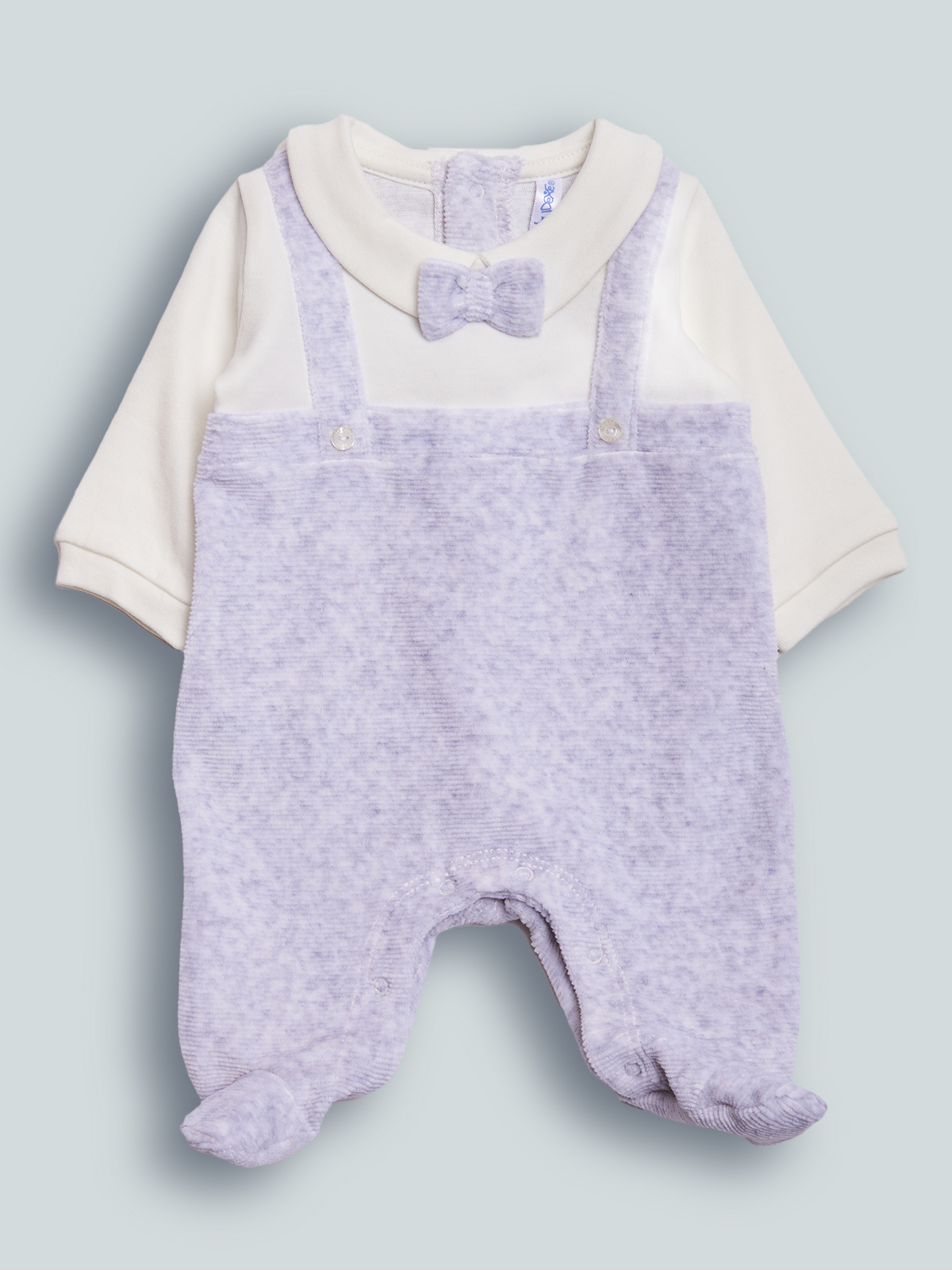Tutina manica lunga dalla linea classica ed elegante. In morbida ciniglia a coste melange con particolari in caldo cotone. Colletto modello camicia con papillon e finte bretelle rifinito da bottoncini madreperlati. Chiusura con bottoni a pressione per agevolarne l’indosso. Pigiamino da indossare nelle occasioni speciali.